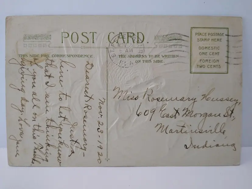 Antique original vintage embossed post card. Clean with corner dings and light age wear. Spotting on back. Marked John Winsch 1911 on front. Printed in Germany on back. Posted with Saint Petersburg, Florida cancel and stamp. Stock #th29.