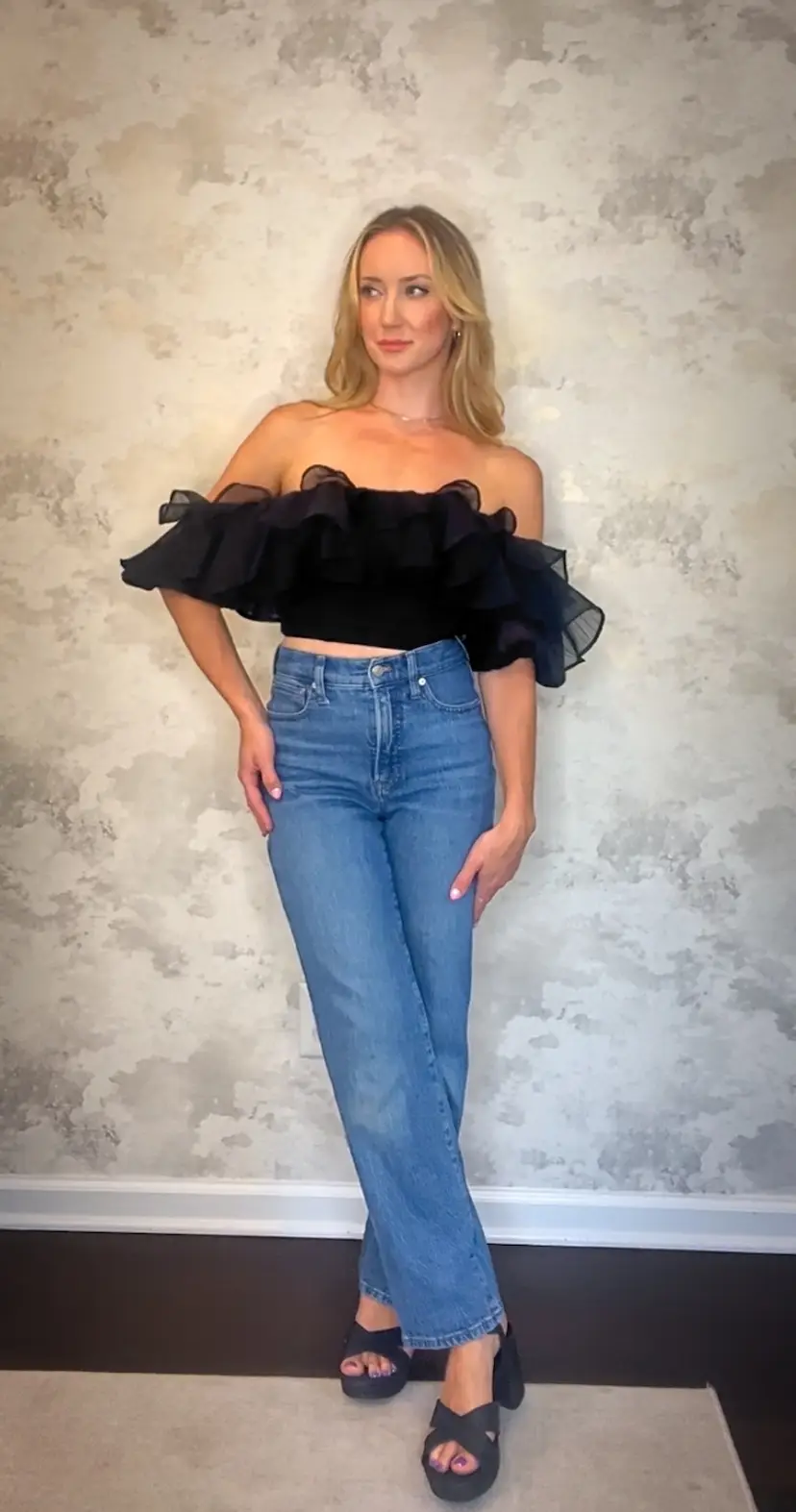 Fitted crop top features ruffles throughout with boning and zip back closure.