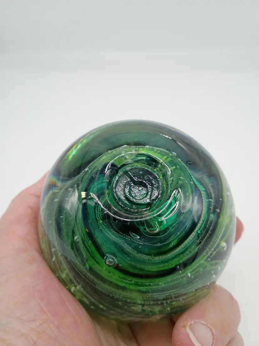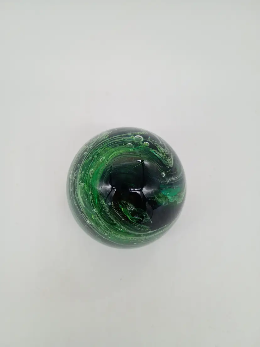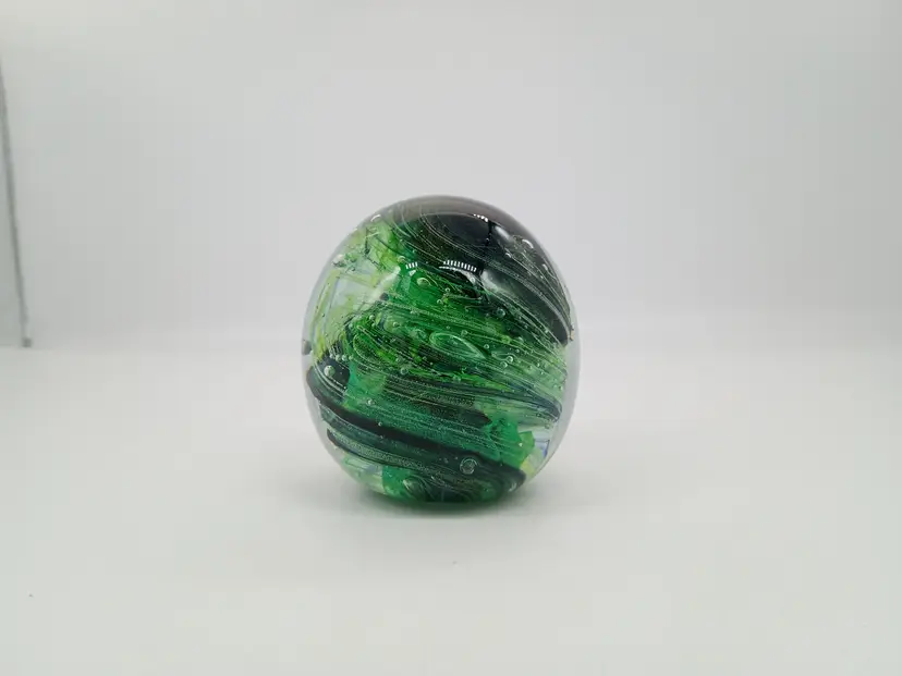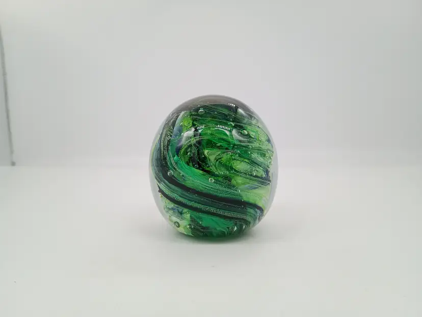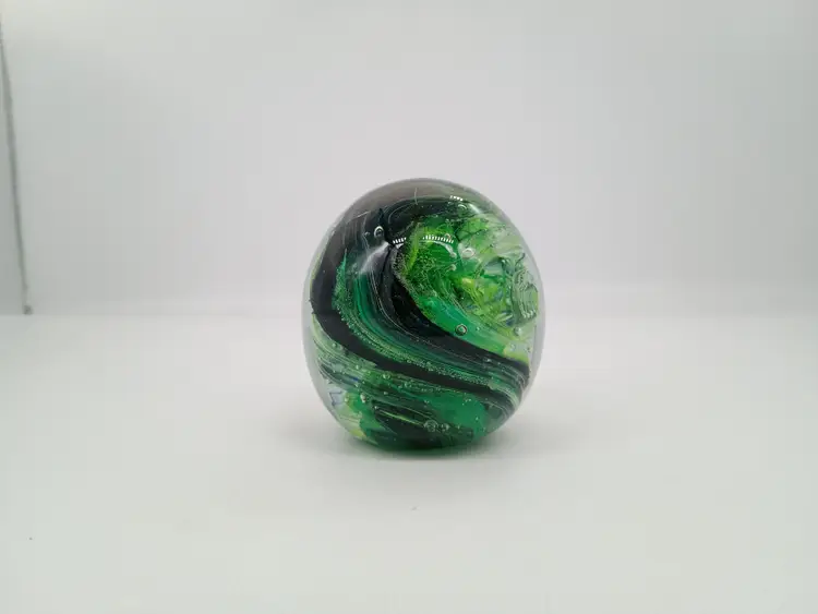 Kerry Ireland Green Black Glass Swirl Paperweight Hand Blown Art Glass Bubbles Swirls Stamp on Bottom. This is 3 inches tall and in diameter. Circa early 2000's. This is preowned, No Chips cracks, flea bites or bruises, no internal fractures. Excellent condition. Ships USPS, UPS