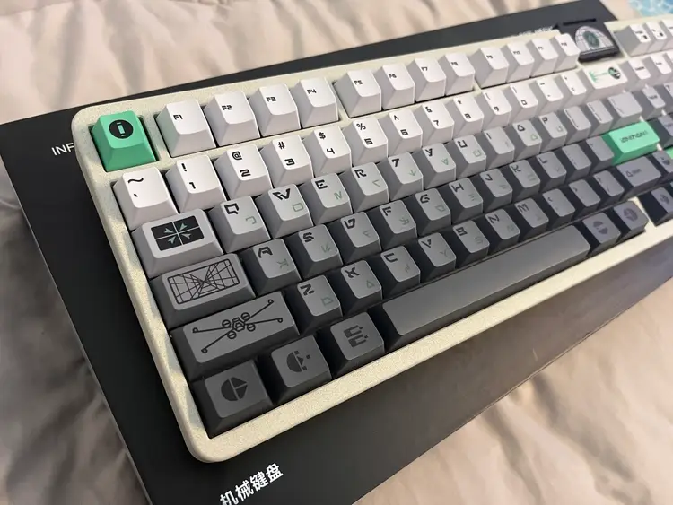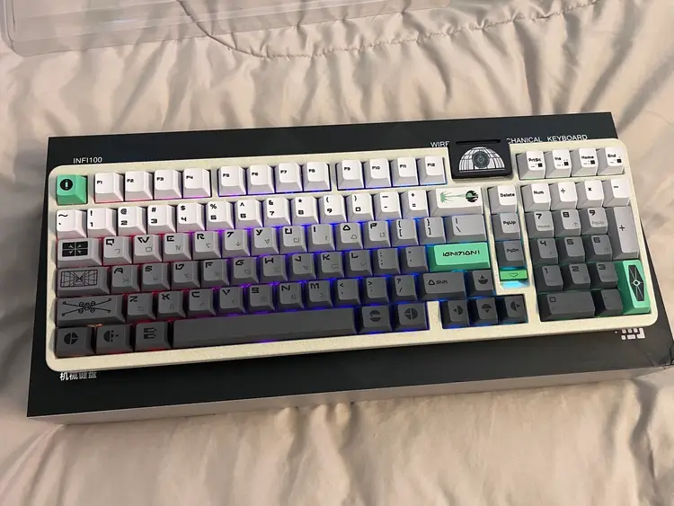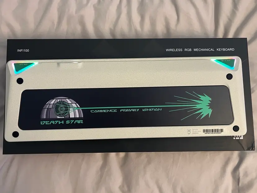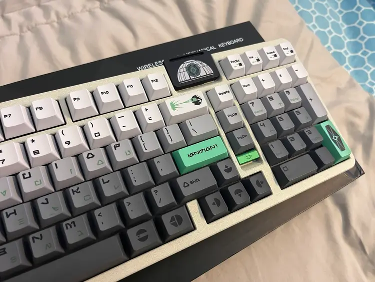 Aluminum chassis, leaf-spring mount, Tri-Mode connectivity, RGB lighting, and dye-sub keycaps.