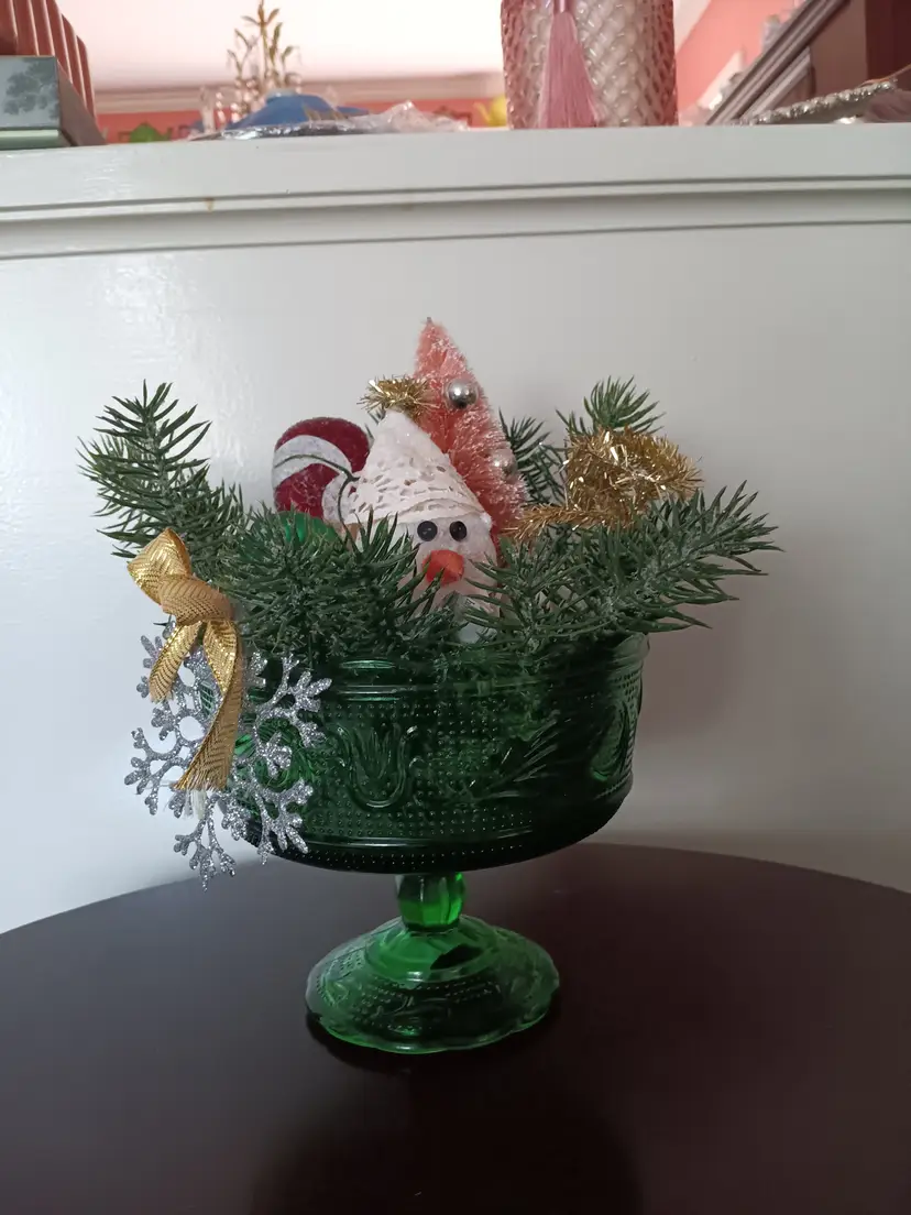 This is a Christmas centerpiece in a EO Brody footed green glass dish.