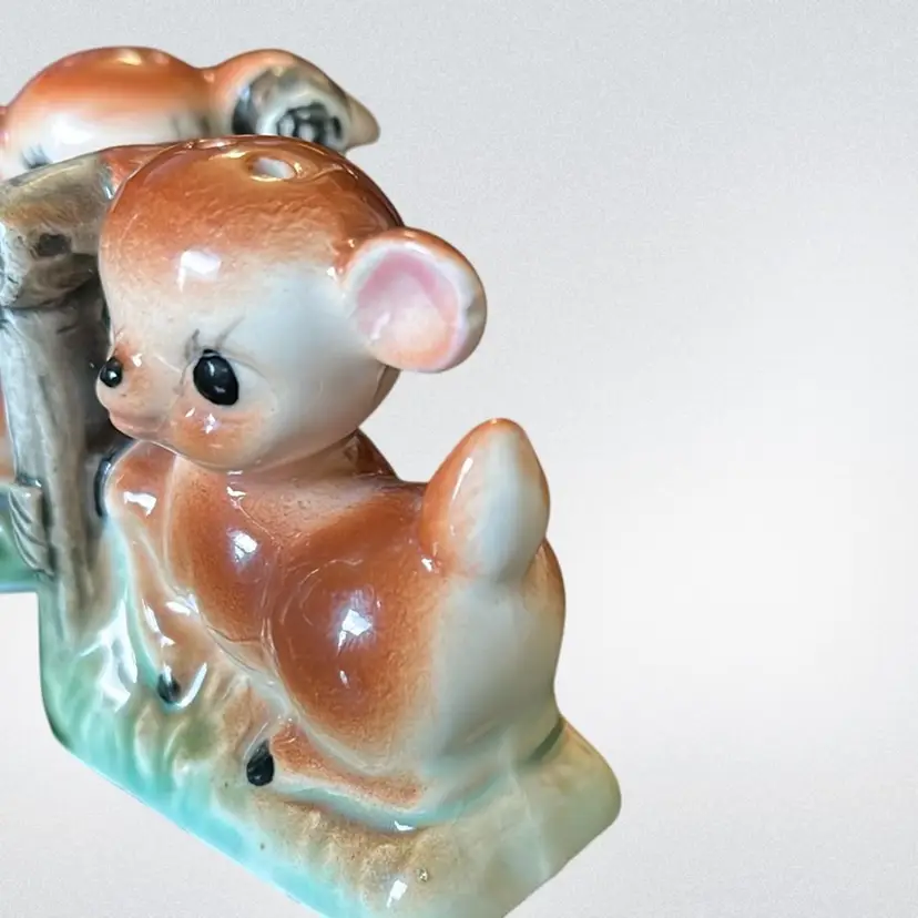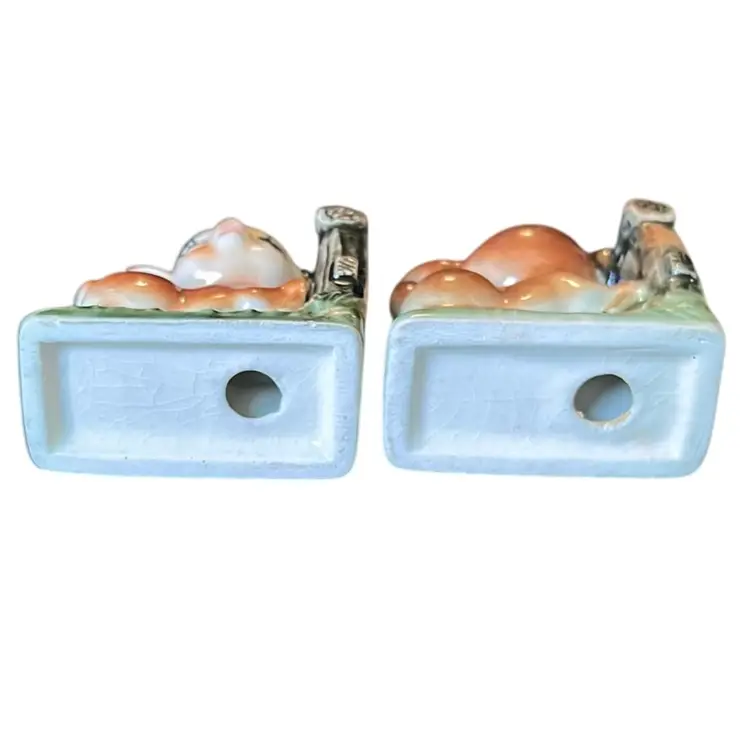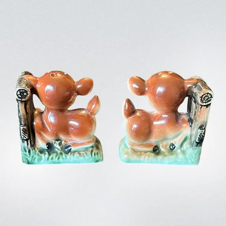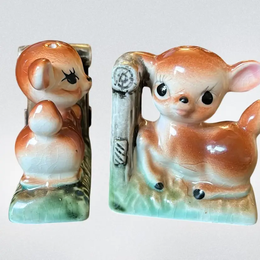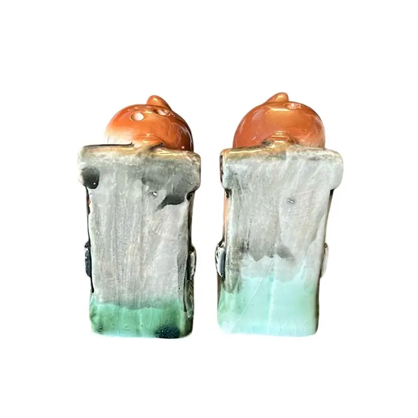 I was using them just as decor but they are still in great condition. They need new corks if you use them as shakers but they also work as cute little bookends for a small book or some recipe cards in the kitchen maybe. There is a small chip on one ear that I have shown in pictures and some crazing. The pieces are 2.25” high each.