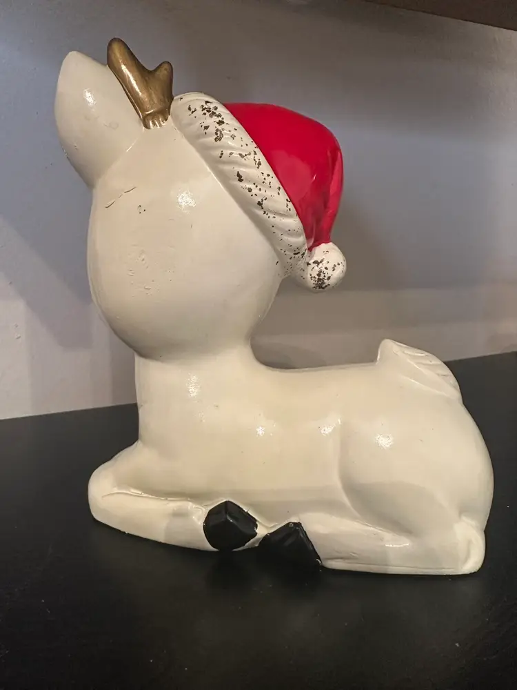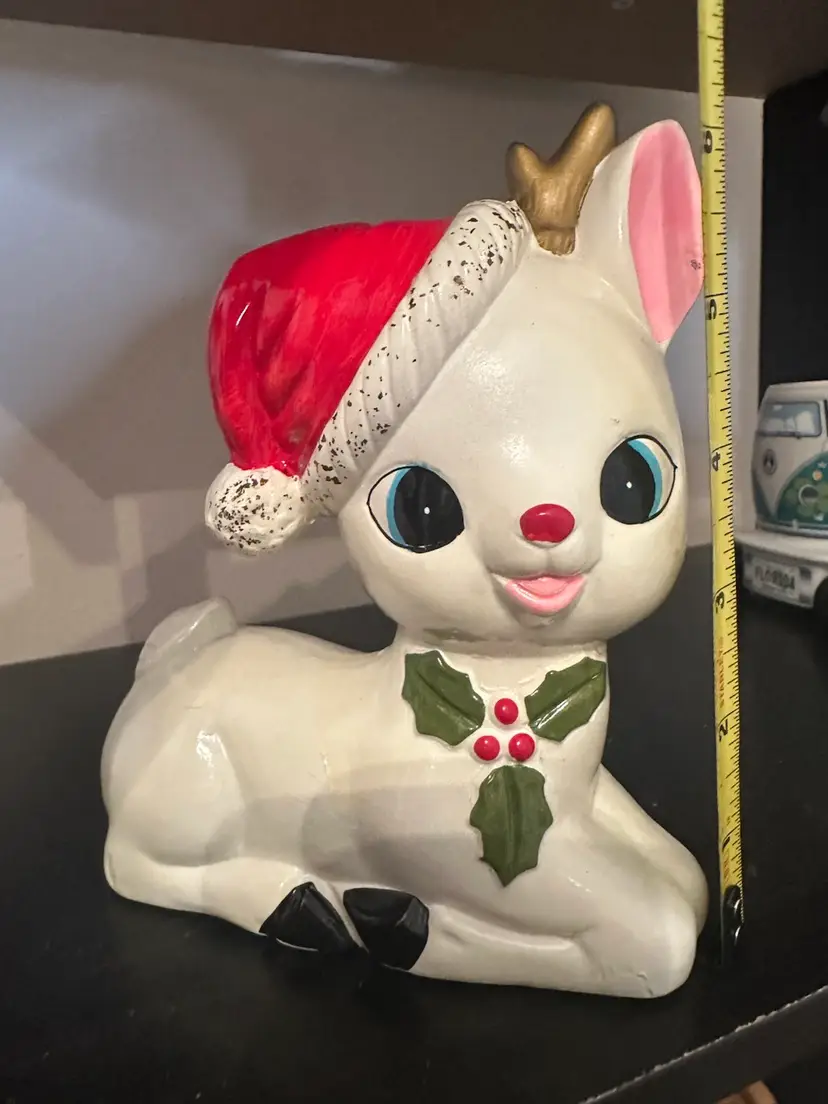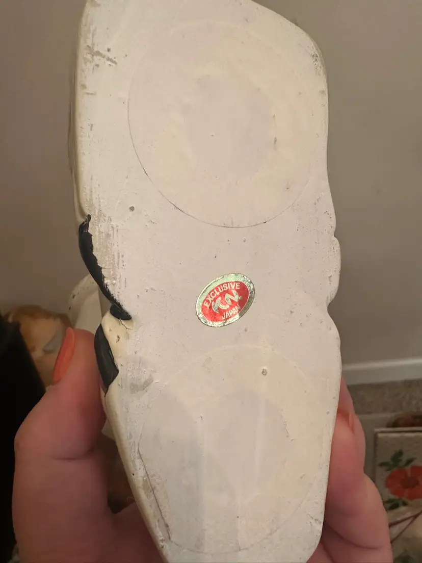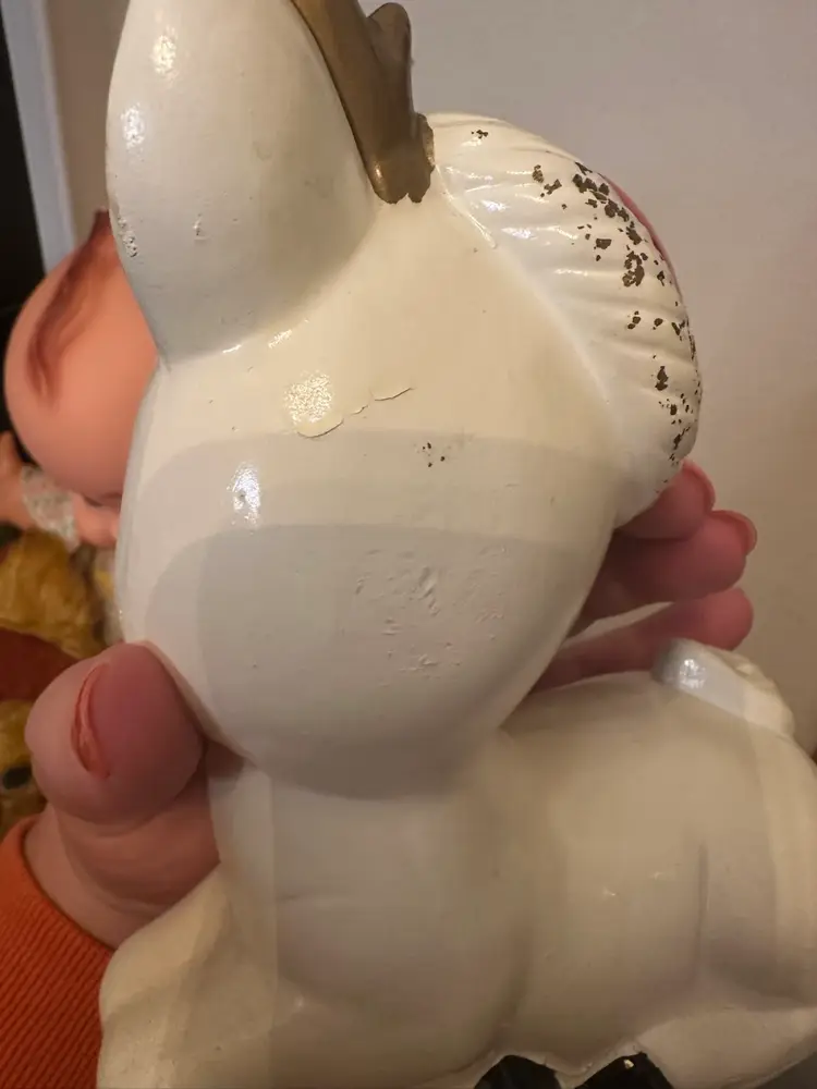The cutest little figurine. You don’t see this one every day! Made by KN Japan. Has some small areas of paint loss from age, see all photos. She’s very cute and has loads of life. Is a nice light paper mache/plaster style material. Thanks for looking! See my Other vintage listings!