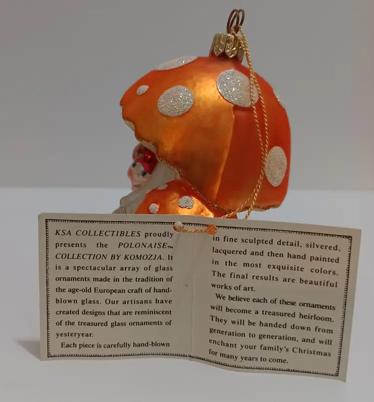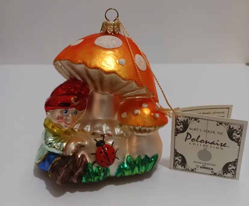 Kurt S Adler Polonaise Ornament; Polka Dot Mushrooms Offer A Respite For The Gnome & His Lady Bug Friend; Very Bright and Cheerful! Excellent condition; no chips or cracks or scuffs! Tag attached! Hand crafted in Poland; 5" Tall x 4" Wide x 3" Deep