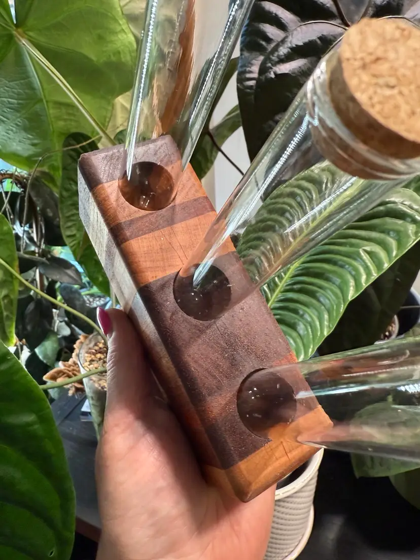 Measures 6” long, 2” wide, and 2.75” high, with 3 holes for included glass vials (5.5” tall, 1” wide). A simple, natural way to display plant cuttings.