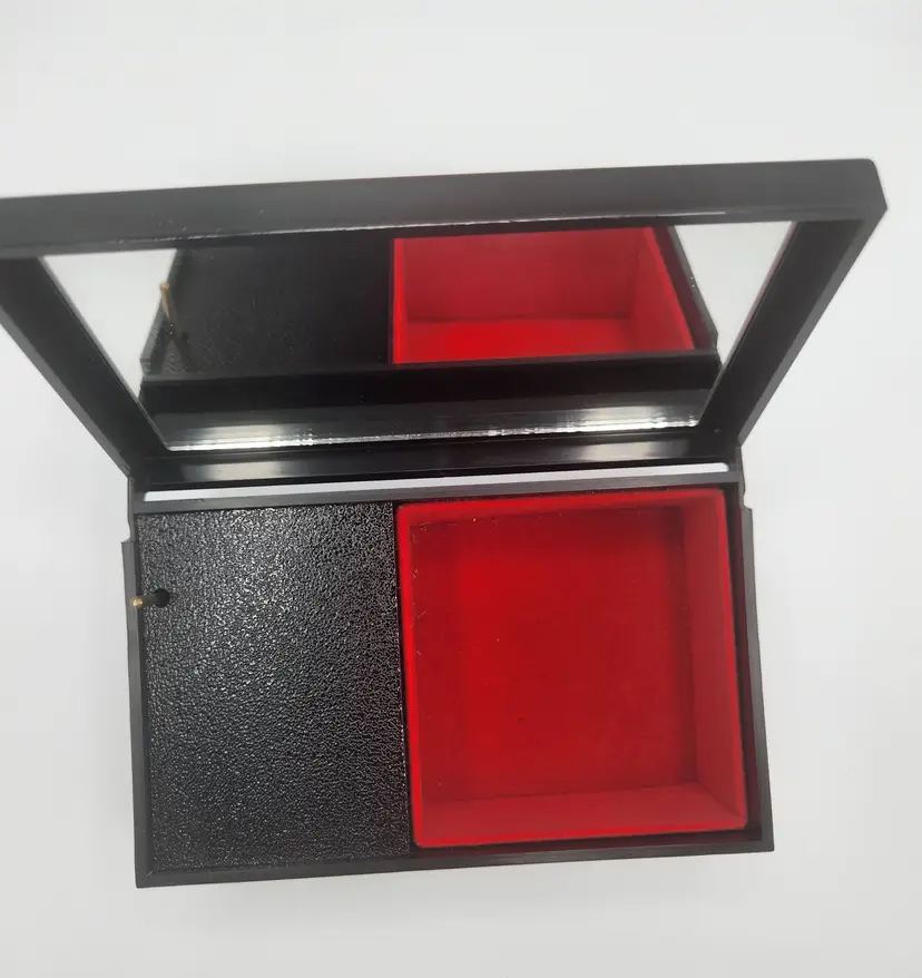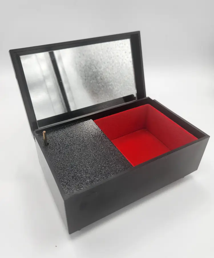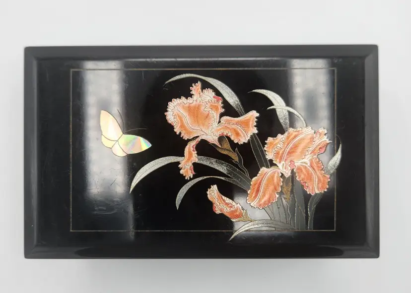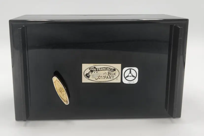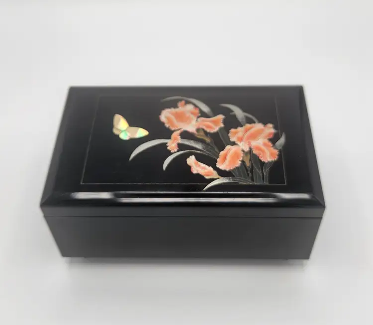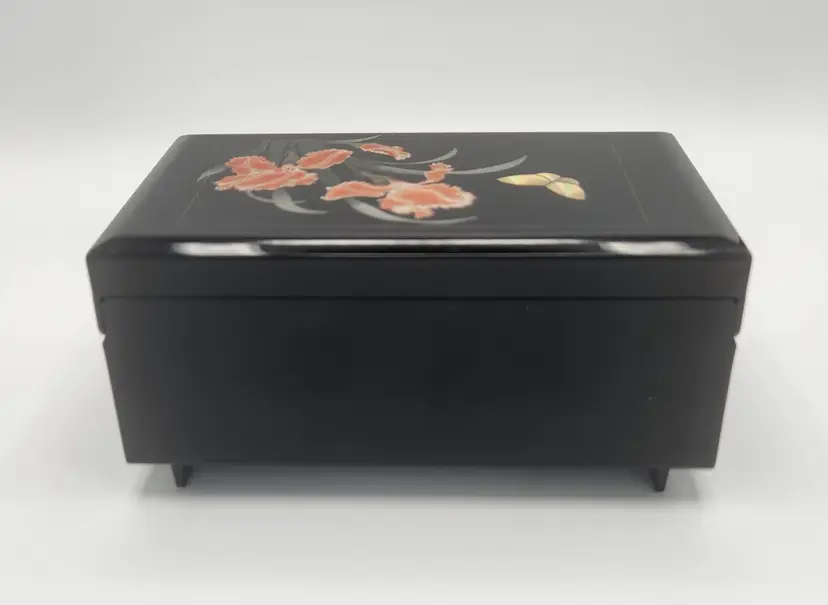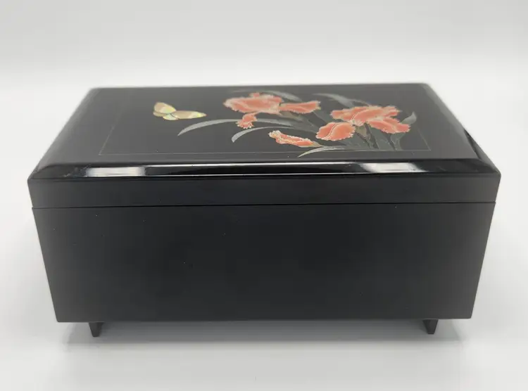 San Francisco Music Box Black with iris & butterfly design. Made in Japan. Music box works. Minor scratching. See photos and video. 5.25"x2.5"x3"