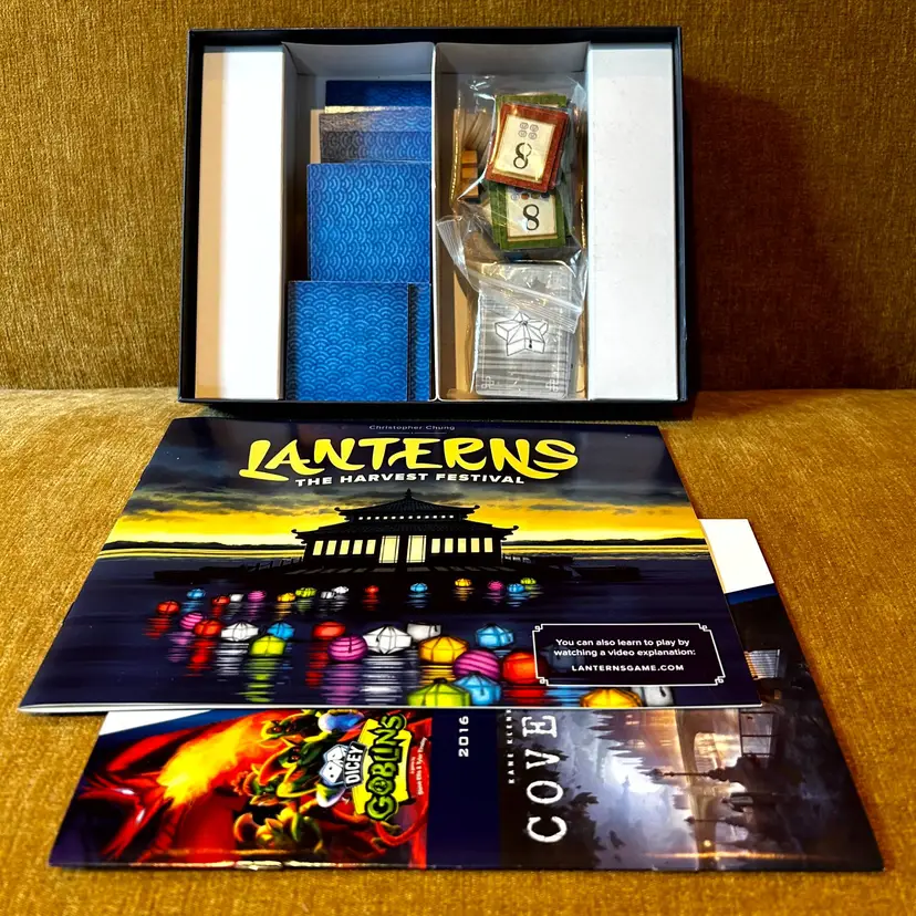 In Lanterns: The Harvest Festival, players have a hand of tiles depicting various color arrangements of floating lanterns, as well as an inventory of individual lantern cards of specific colors. When you place a tile, all players (you and your opponents) receive a lantern card corresponding to the color on the side of the tile facing them. Place carefully to earn cards and other bonuses for yourself, while also looking to deny your opponents. Players gain honor by dedicating sets of lantern cards — three pairs, for example, or all seven colors — and the player with the most honor at the end of the game wins.