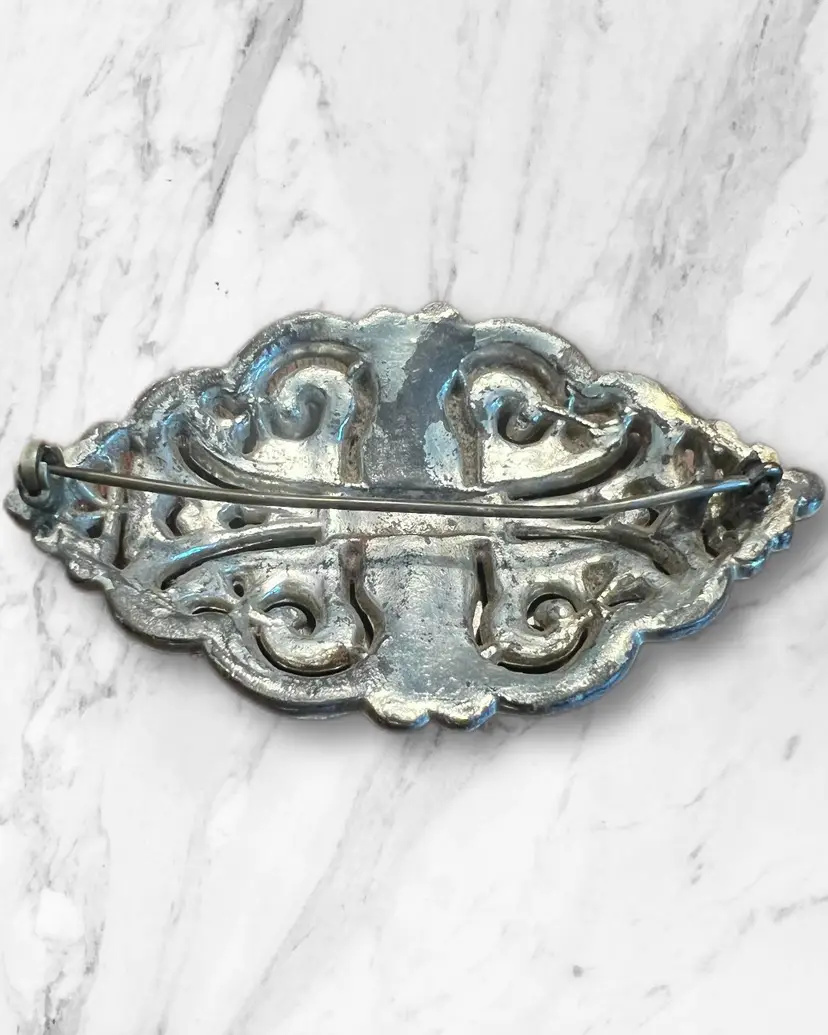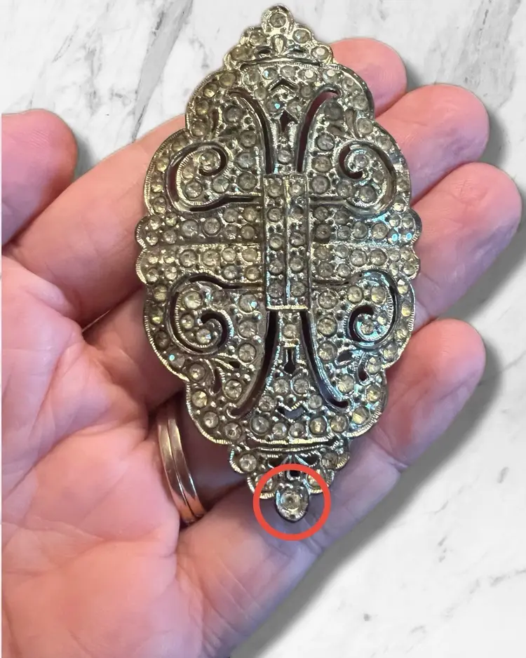 This old brooch is BEAUTIFUL! Missing stone on end- circled in photograph. Some stones are darkened due to age. Displays beautifully!! Measures 3x1.5”