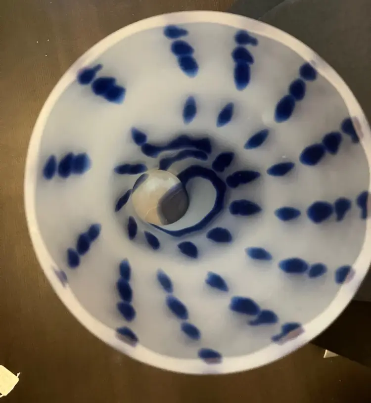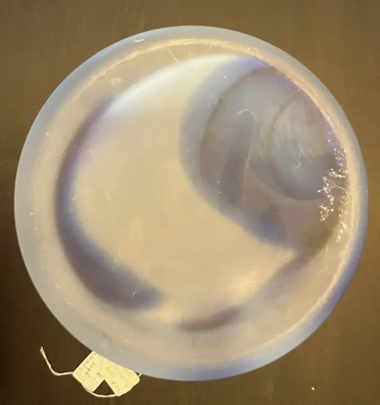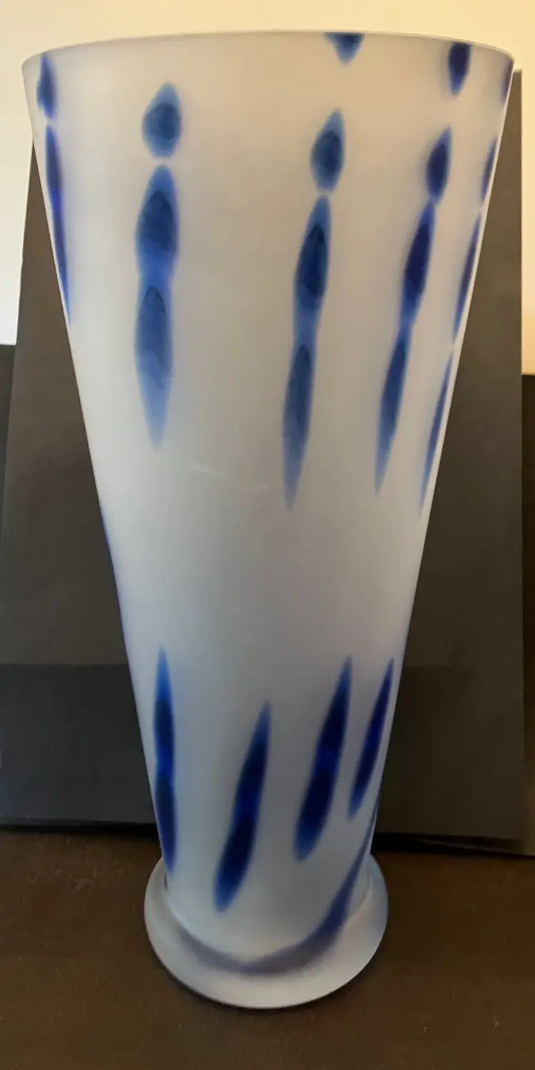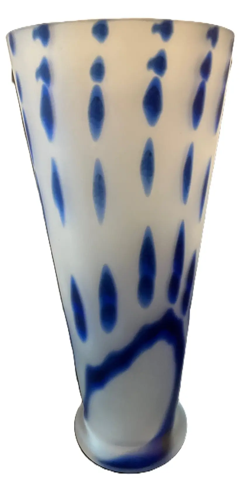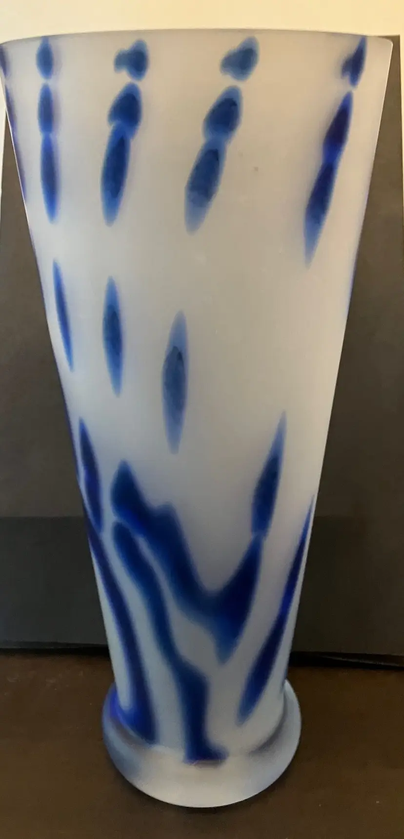 Beautiful! No condition issues. The blue areas are raised towards the inside and but it is smooth on the outside. It is etched on the bottom. The only part I can read is Italy. Measurements: 16" tall, about 7" across at the opening, 4 3/4" wide at the base. 6 lbs before packaging