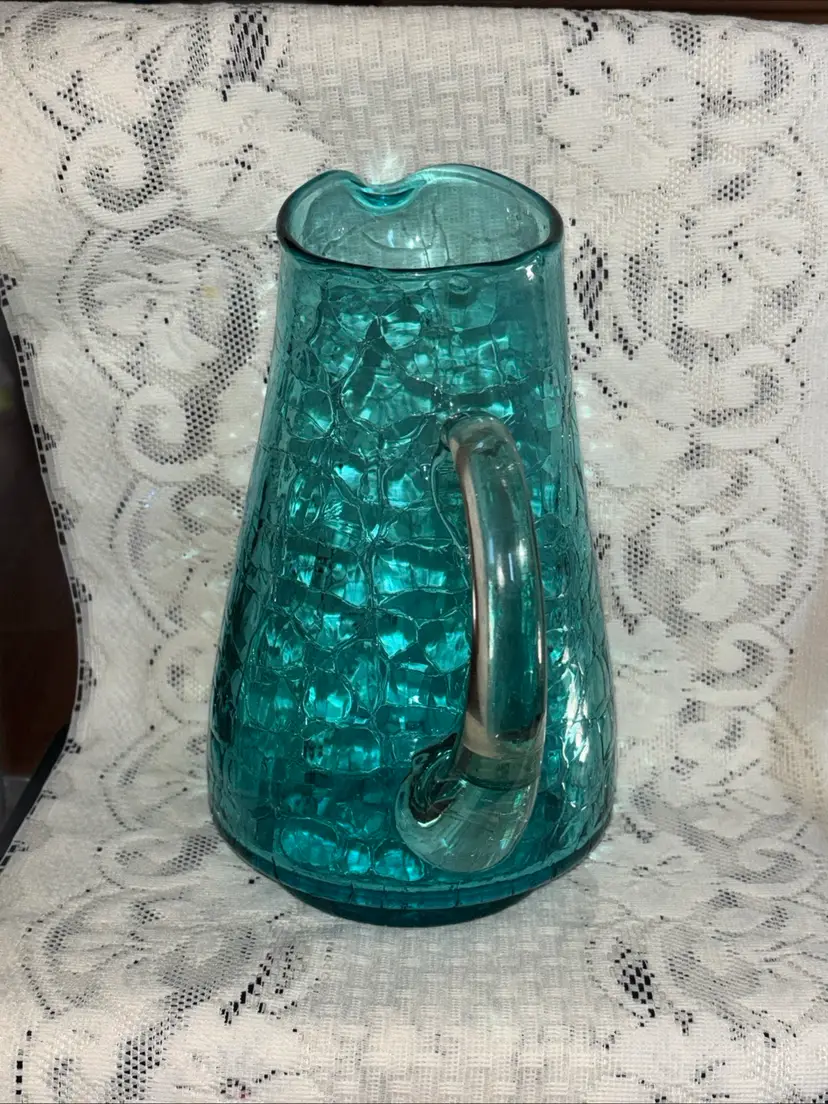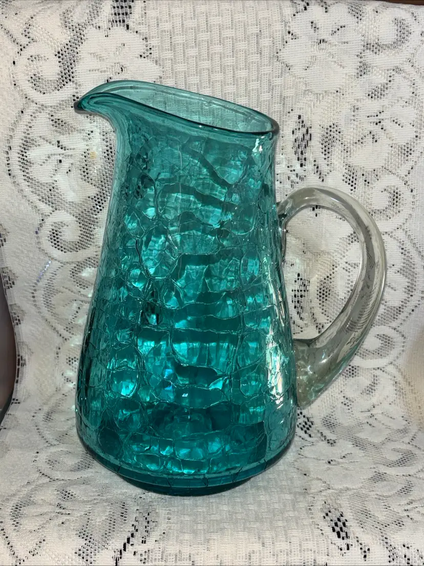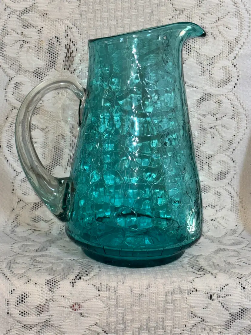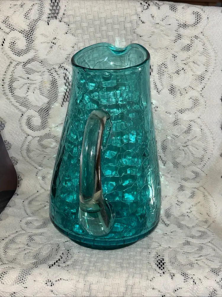 This large MCM blue crackle glass pitcher stands at 9.75 inches tall, featuring a glossy finish. It is a vintage piece with a mid-century modern style, showcasing a hand-blown glass design with an applied handle. The vibrant blue color adds a pop of retro charm, making it a unique addition to any collection of decorative cookware and serveware.