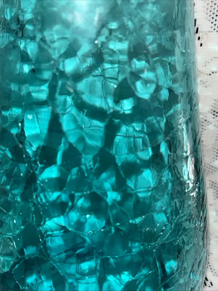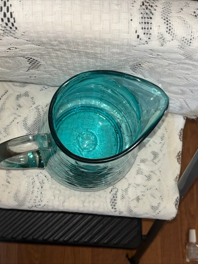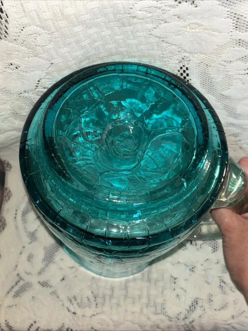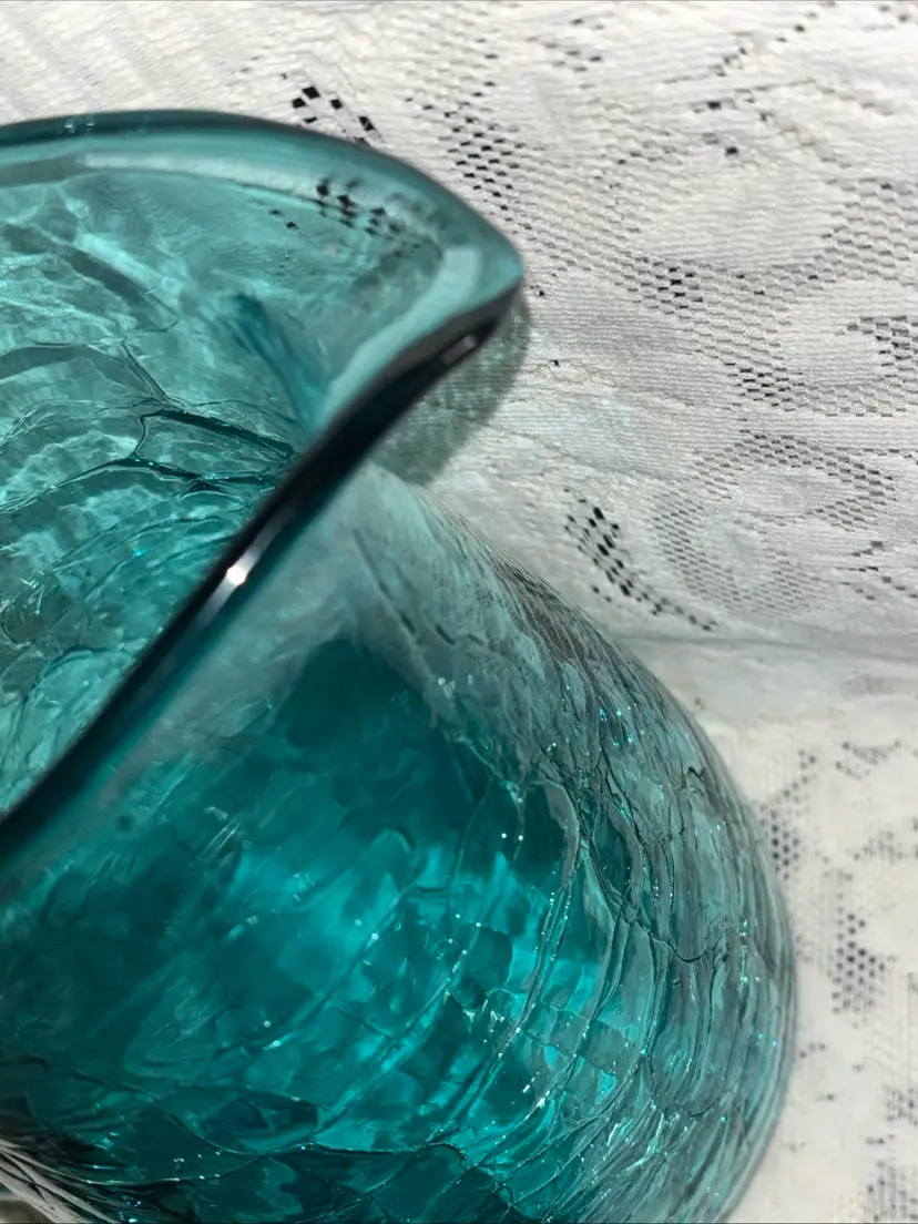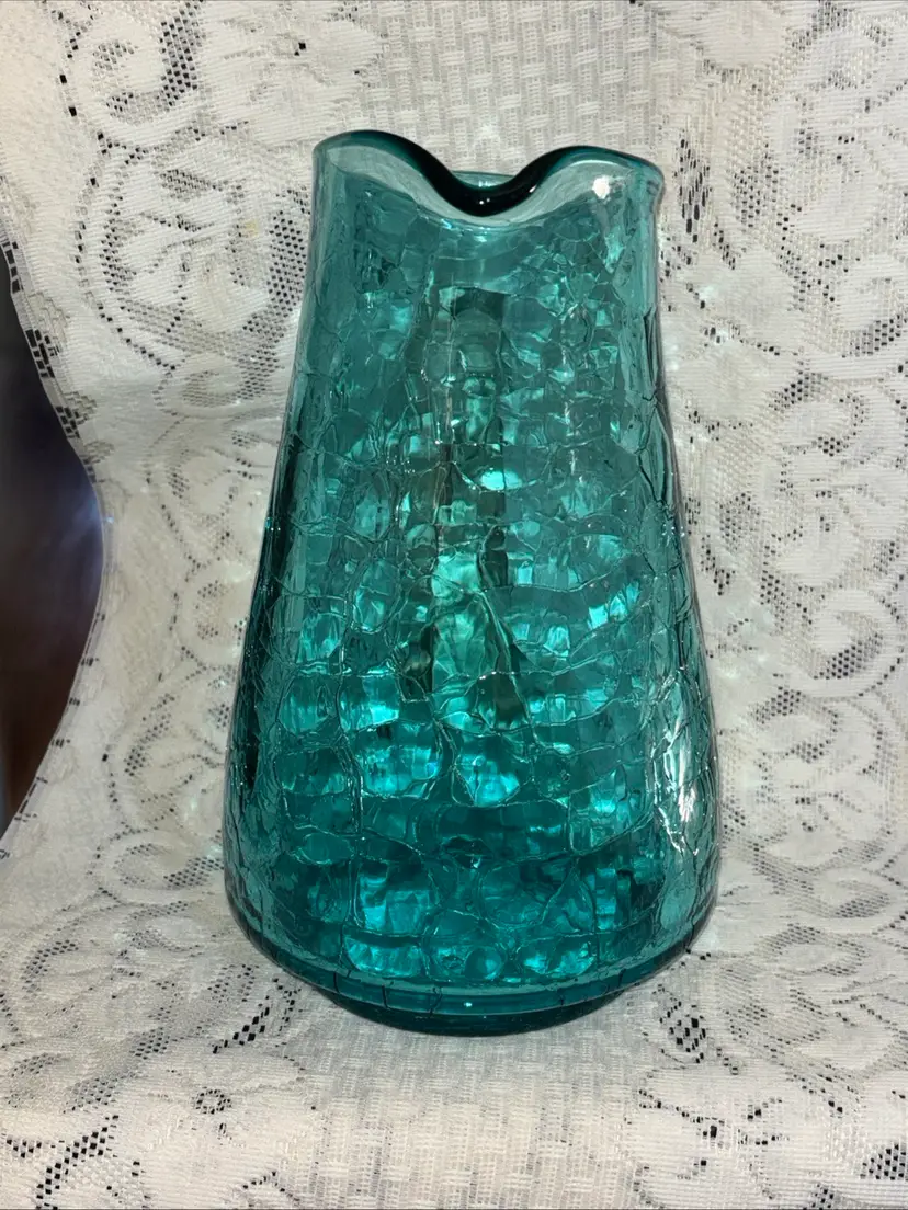 This large MCM blue crackle glass pitcher stands at 9.75 inches tall, featuring a glossy finish. It is a vintage piece with a mid-century modern style, showcasing a hand-blown glass design with an applied handle. The vibrant blue color adds a pop of retro charm, making it a unique addition to any collection of decorative cookware and serveware.
