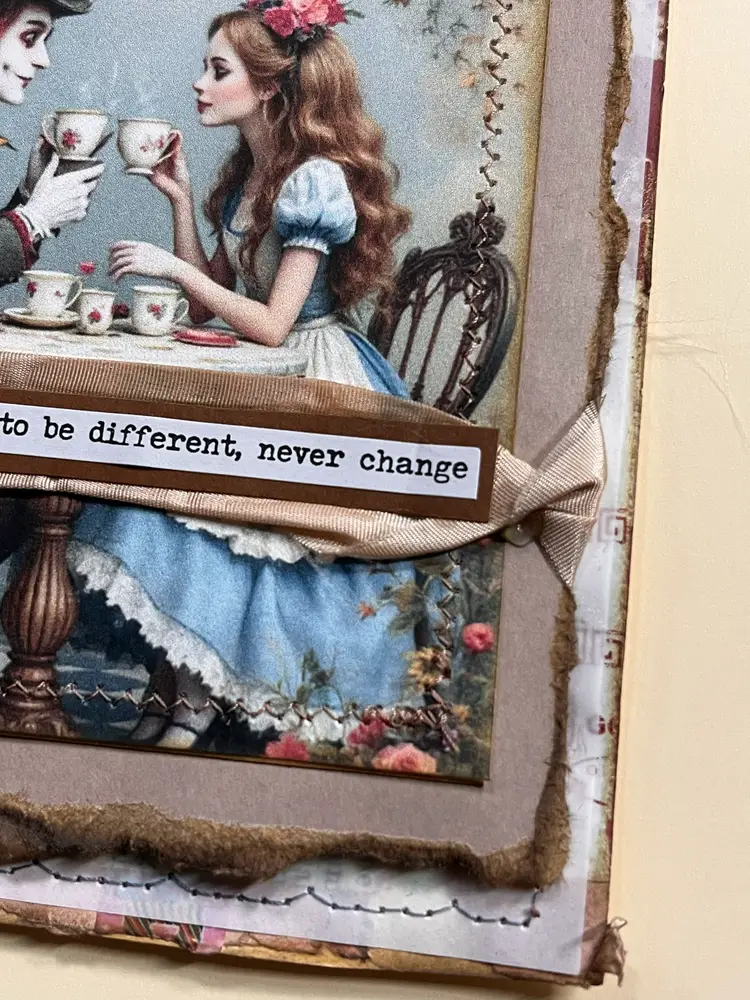 Top layer is an image of Alice and The Mad Hatter, sewed around the edge and made to look aged with distressing ink, and with paper underneath to reinforce it. It pops up a little from the bottom layer since I added a little something behind it to rise it up a bit.
