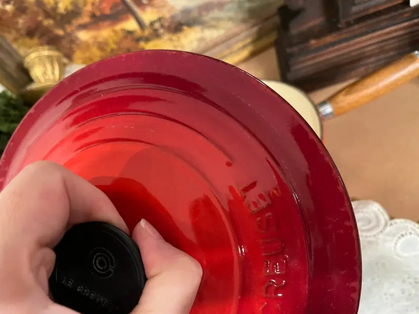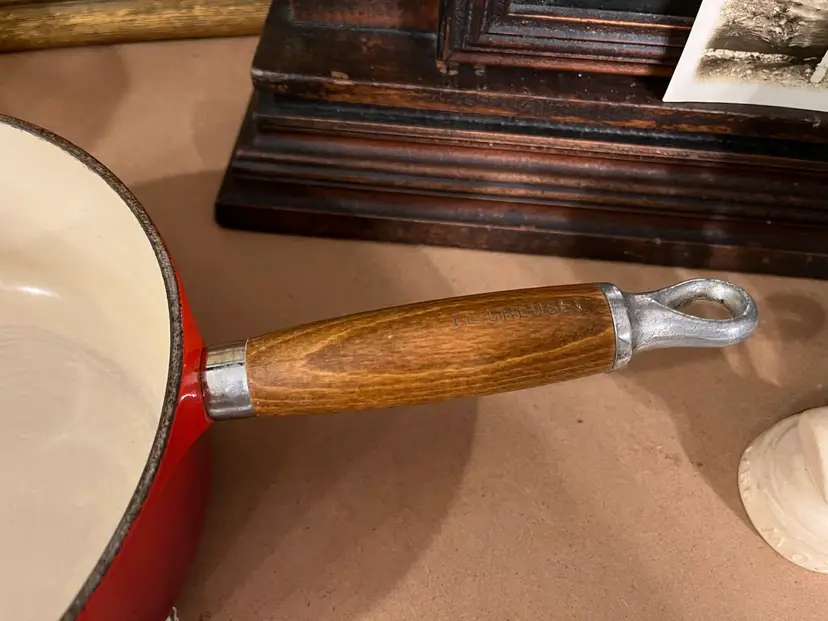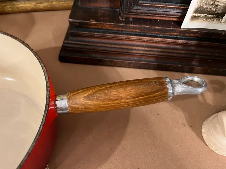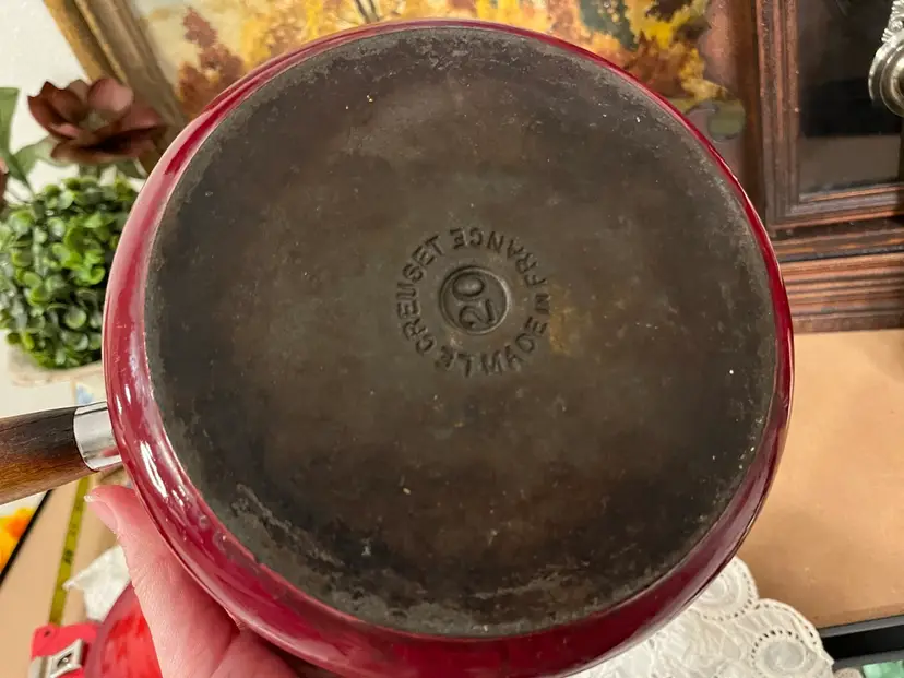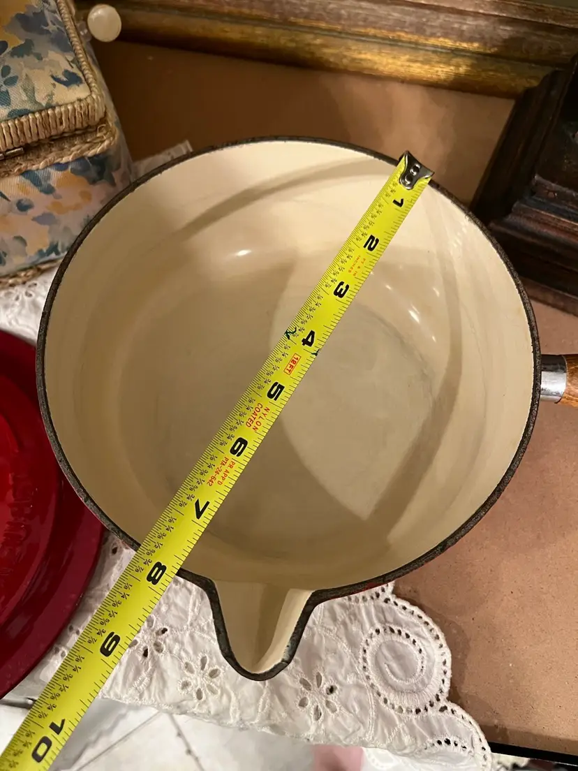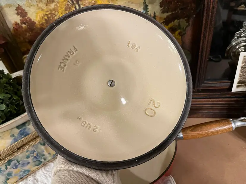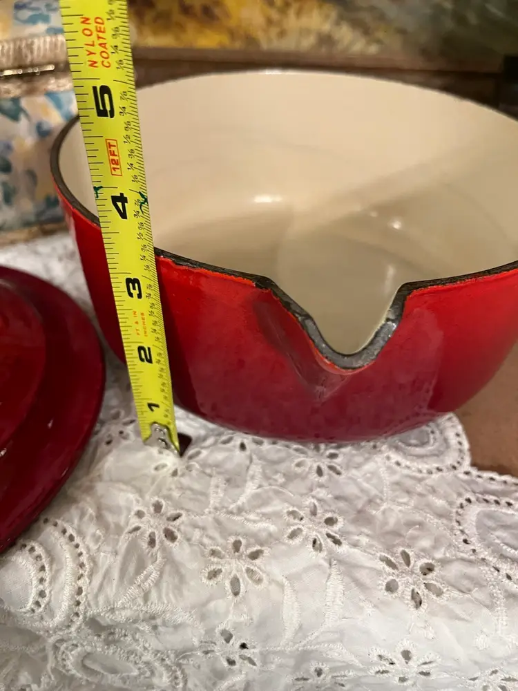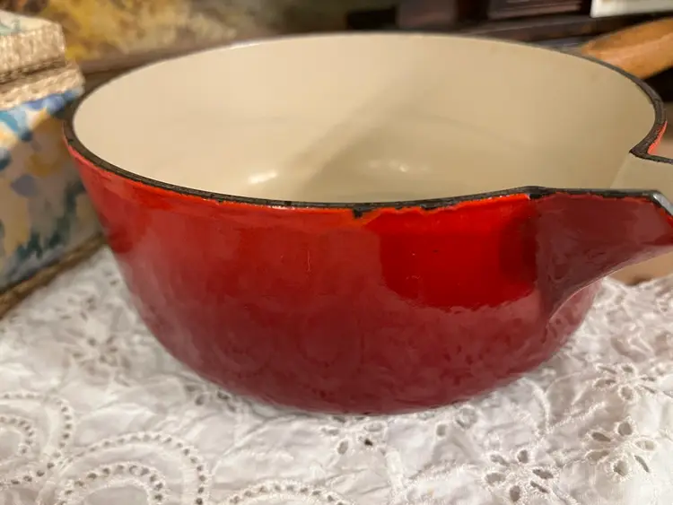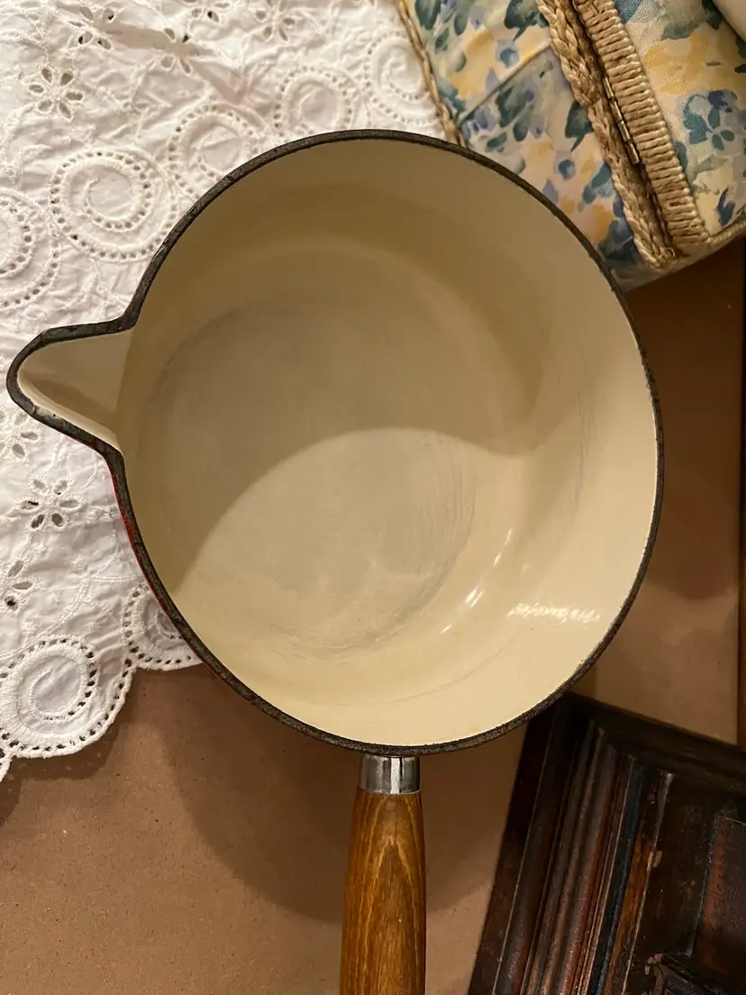 This is a beautiful sauce pan with minimal damage. Light chipping to the enamel around the edge of pan and wear around edge of lid.
