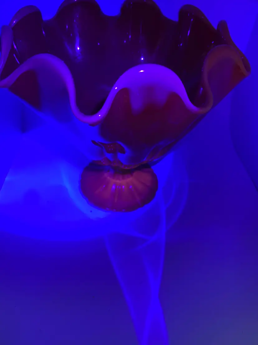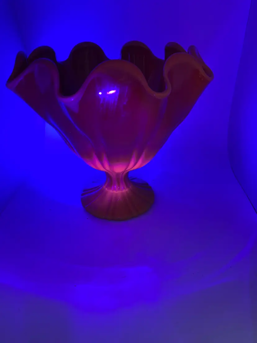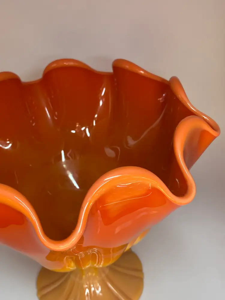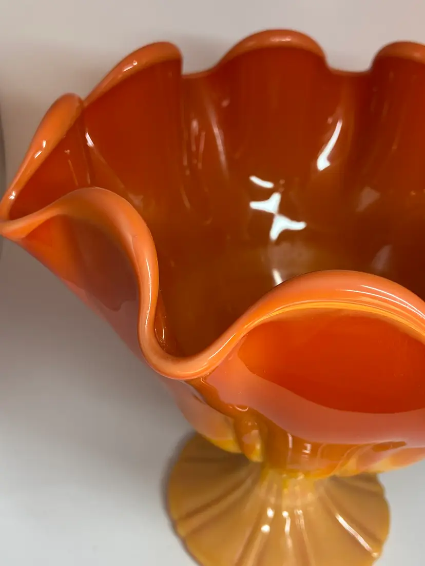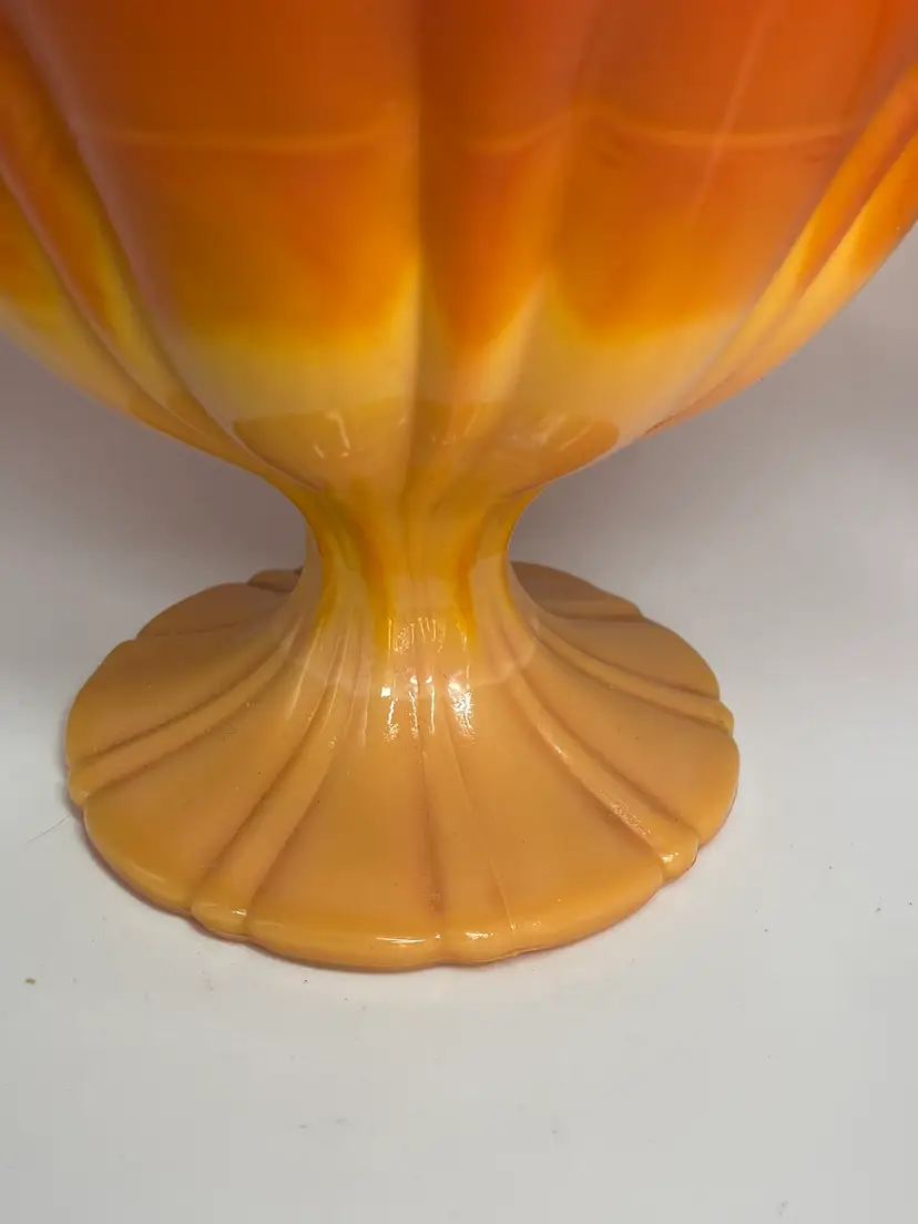 GLOWS UNDER UV LIGHT. The L.E. Smith Bittersweet Orange Slag Glass Compote is a vintage piece of American-made art glass from the Mid-Century Modern era. This 7" tall, 7.75" wide bowl features a glossy finish and a vibrant orange color, perfect for all occasions. The set includes a pedestal bowl, making it a unique and stylish addition to any decorative cookware or serveware collection. Crafted in 1963 by renowned brand L.E. Smith, this slag glass compote showcases the intricate craftsmanship and bold design of mid 20th-century glass art.