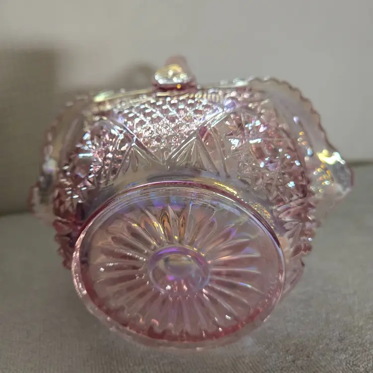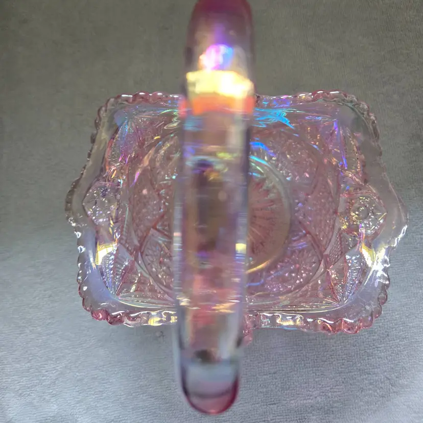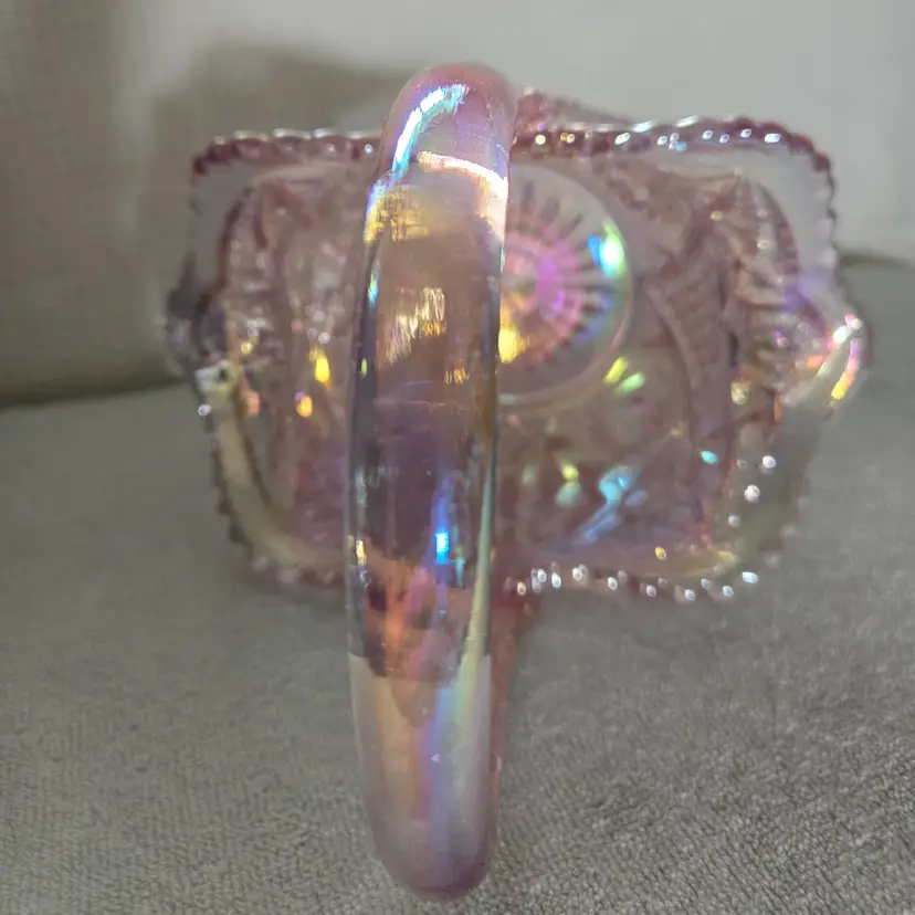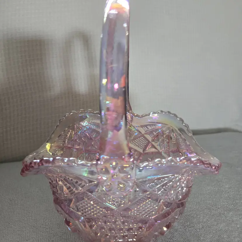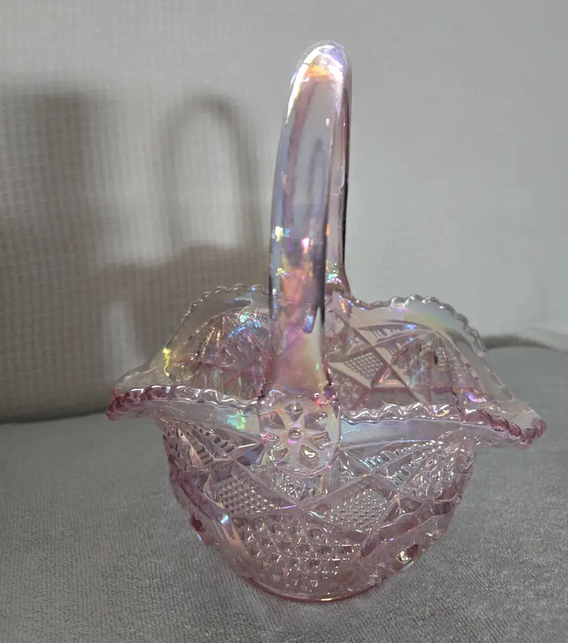 This is a heritage Bridal Flower Basket in the Quintec pattern. L.E. Smith is known for its high quality glass and is sought after by collectors. Stands 8 1/2" high, 7" wide and is 4 1/2" deep. In excellent condition. No chips, cracks, or repairs.