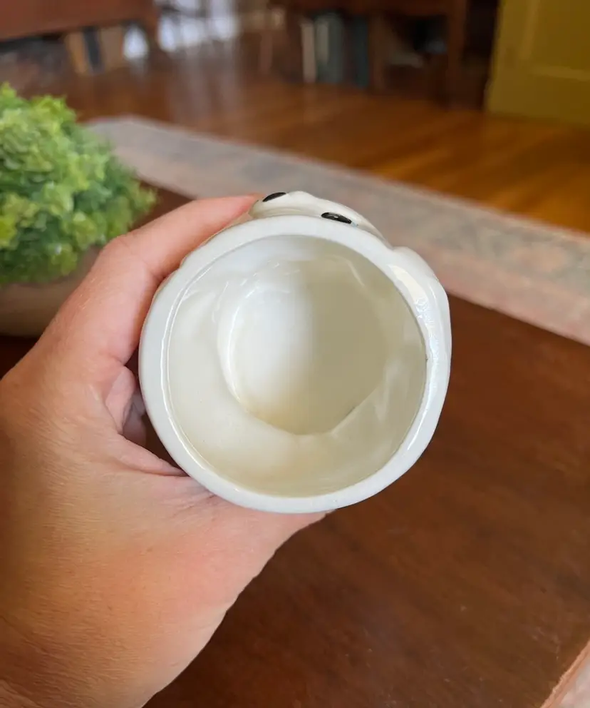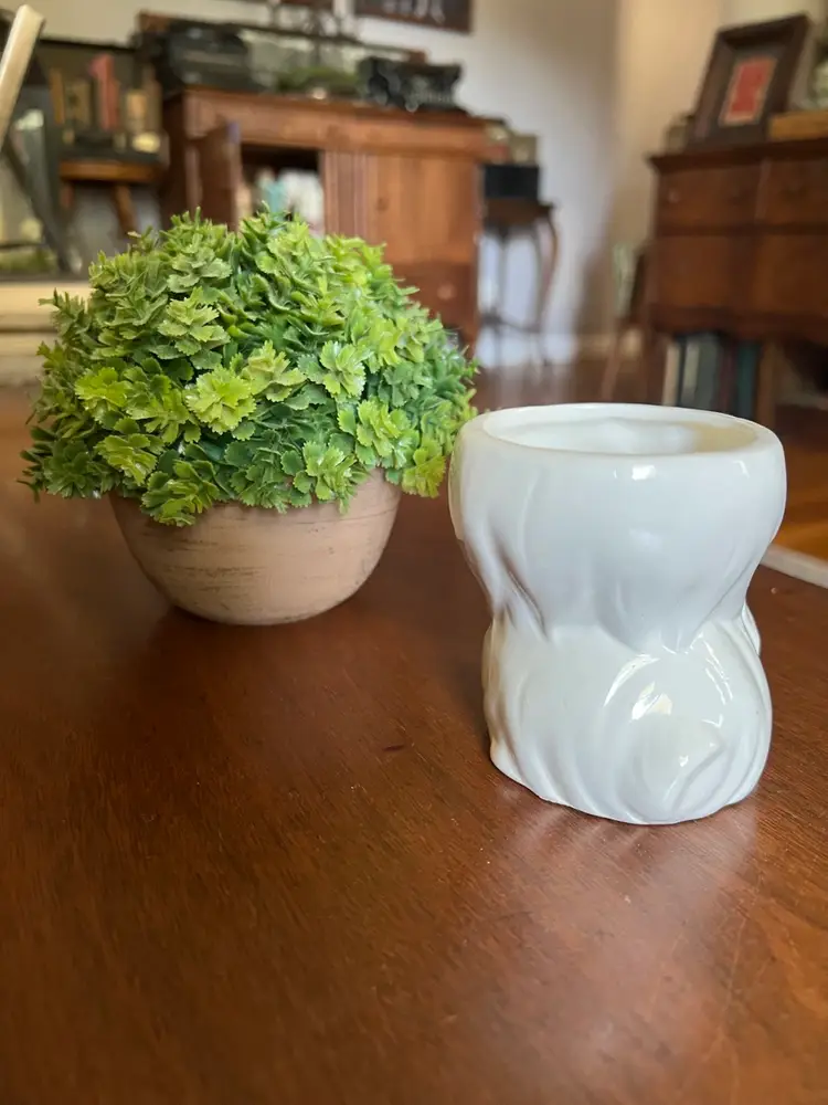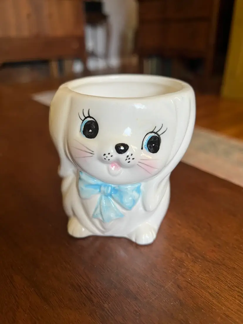 A kitsch classic🤍🩵 This Lefton Mr. Toodles is a classic. He has no cracks or chips. However, he is missing his lid. Without a lid, he is a GREAT planter with faux greenery, pencil holder, change holder… the possibilities are endless.