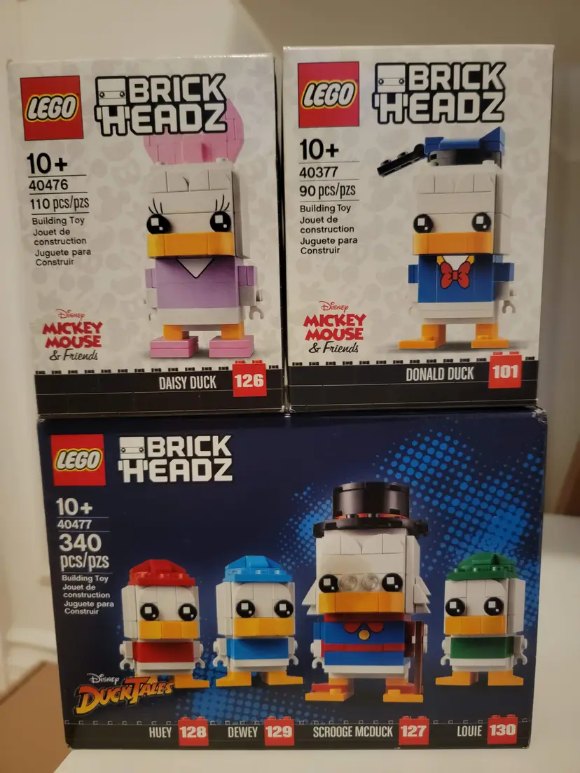 Lego Brickheadz bundle: 40377, 40476, & 40477: Donald Duck, Daisy Duck, & Scrooge McDuck, Huey, Dewey & Louie. Get all of the Disney ducks in one bundle!