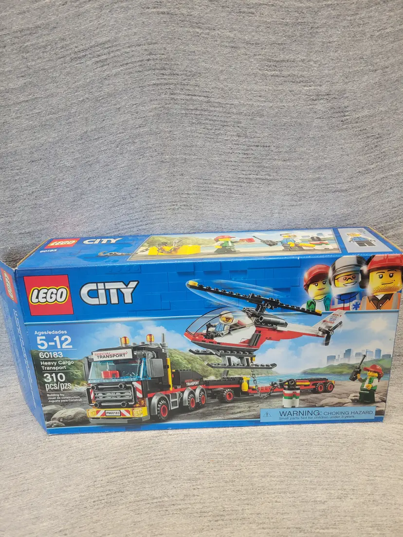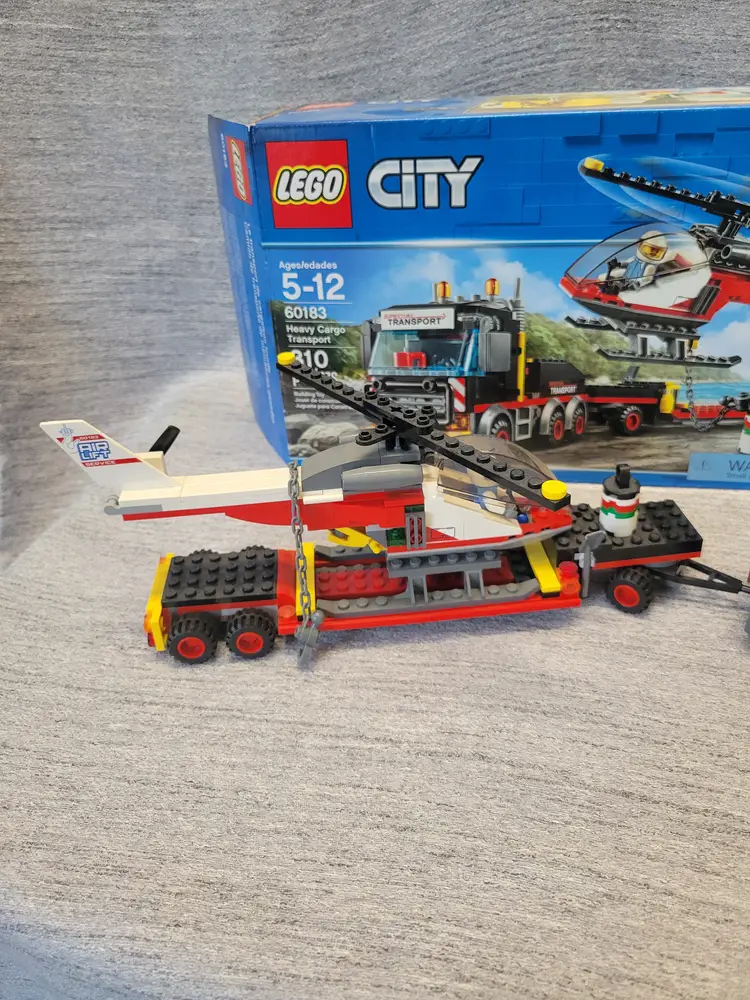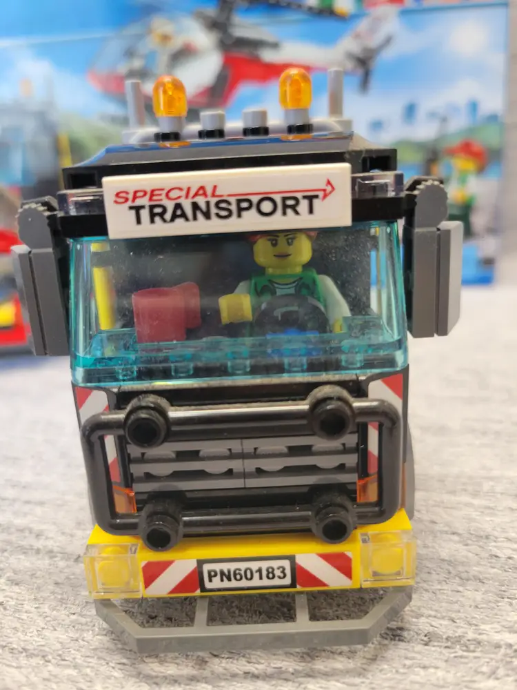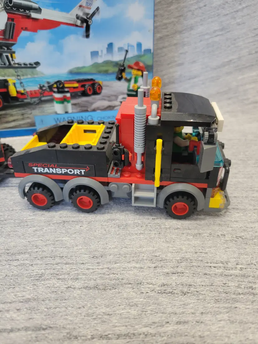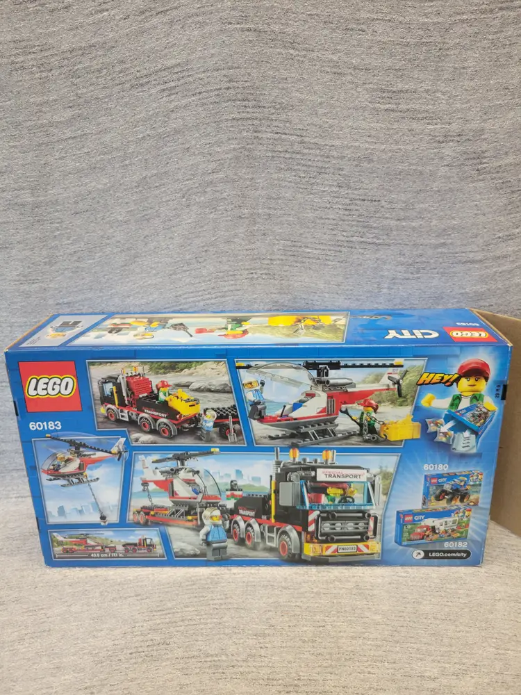 Head to the worksite outside the city limits with the LEGO® City 60183 Heavy Cargo Transport, featuring a heavy truck with opening cab, toolbox and bull bars, a detachable extended flatbed trailer truck toy, plus a helicopter with spinning rotors, opening cockpit and a chain. This great toy helicopter transport model building toy includes 2 minifigures. Accessory elements include a mug, box, wrench, shovel, walkie-talkie, fire extinguisher and an oil barrel. Truck measures over 3” (8cm) high, 5” (14cm) long and 2” (6cm) wide.. Flatbed trailer measures over 1” (3cm) high, 10” (27cm) long and 1” (5cm) wide. Helicopter measures over 3” (8cm) high, 8” (21cm) long and 1” (4cm) wide.
