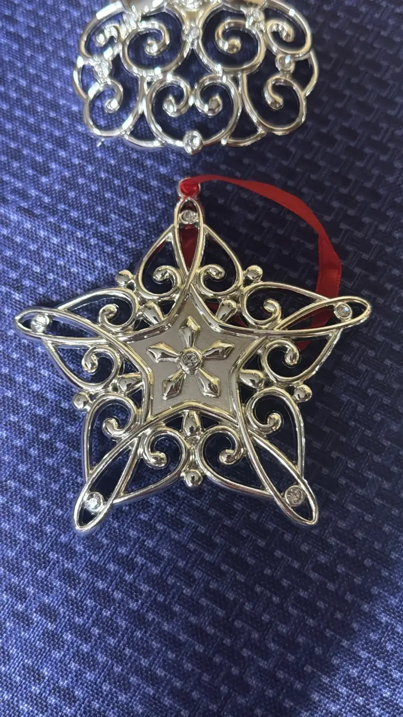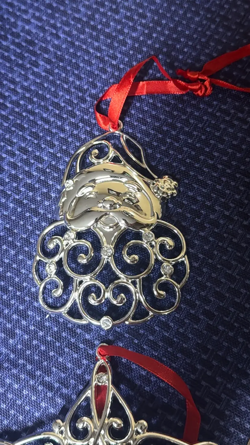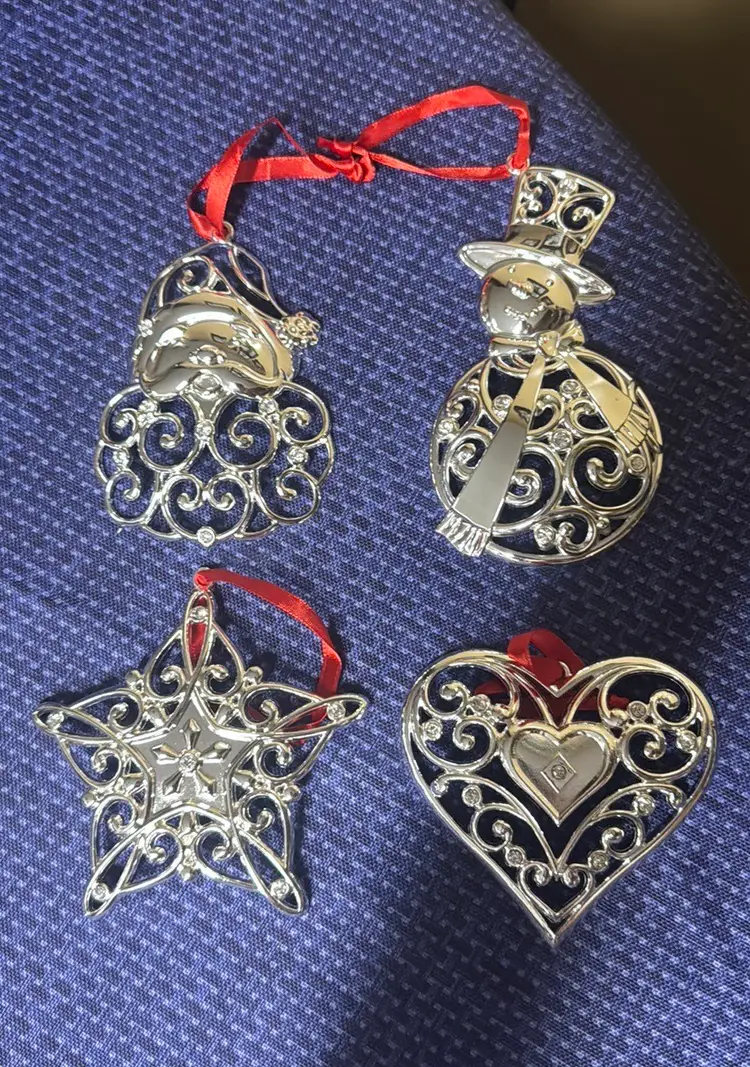 4 LENOX Sparkle & Scroll Clear Approximately 3.25” to 5” tall Crystal Ornaments in Original Boxes Silverplate Enhance your holiday decor with this elegant silver ornament set. Featuring intricate designs and vibrant red accents, these ornaments add a festive touch to any setting. All are new in original boxes (2) (9749425mb3)