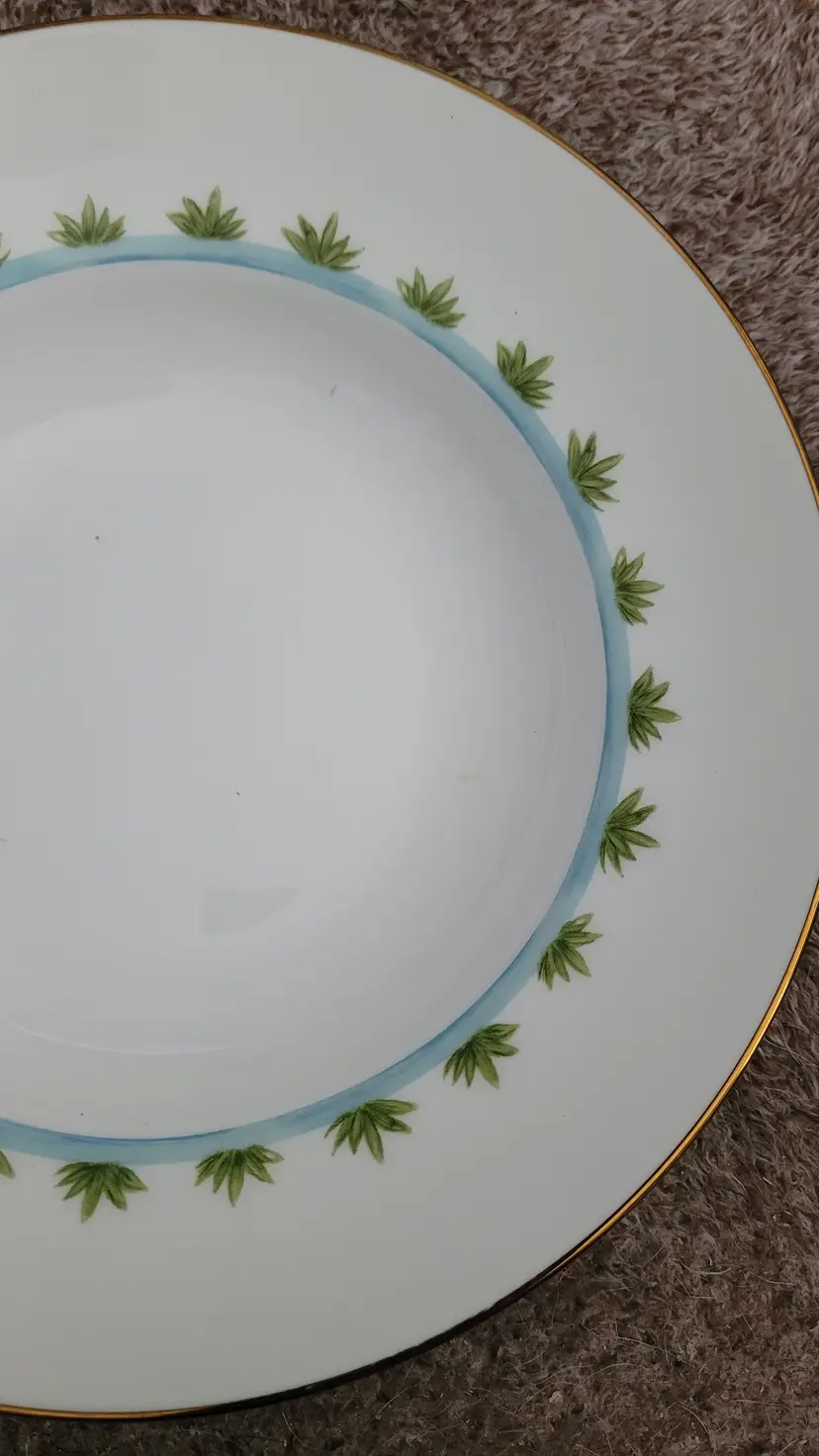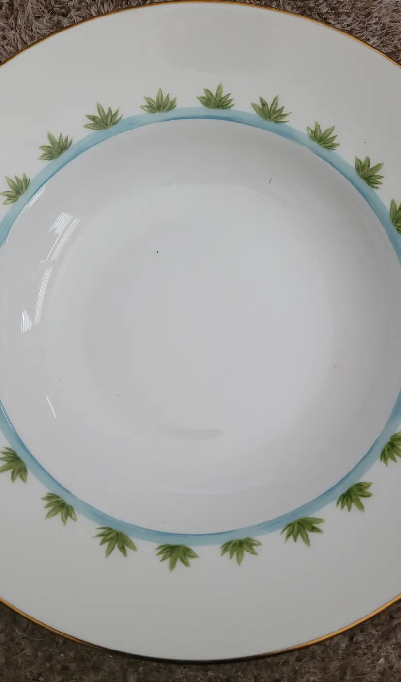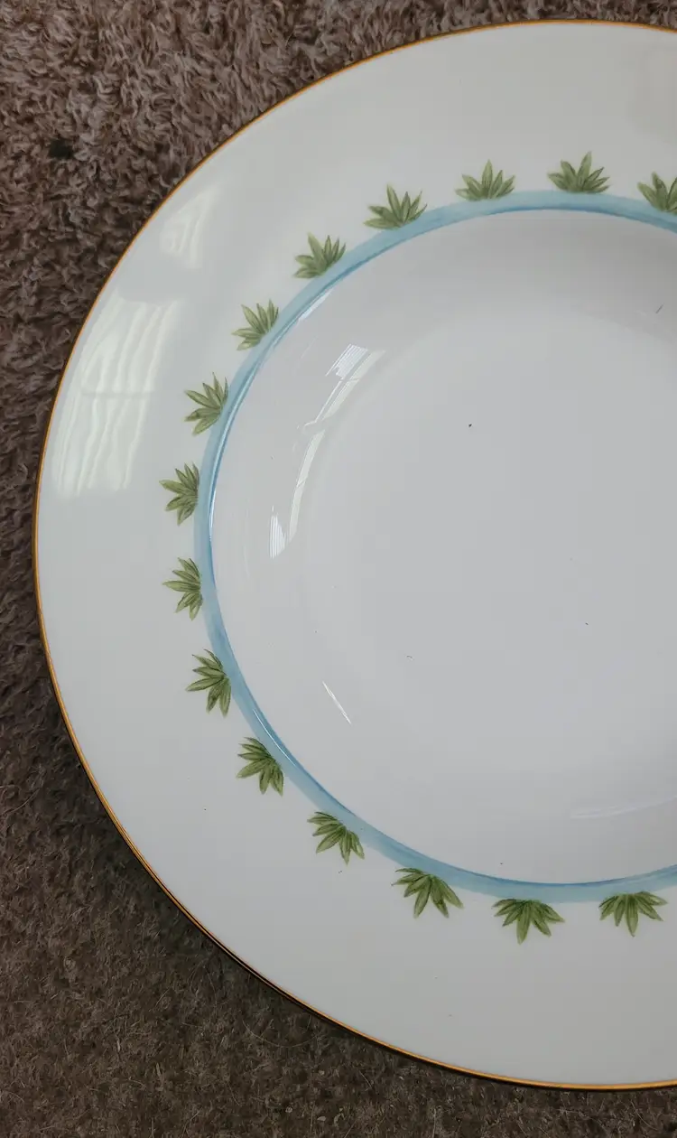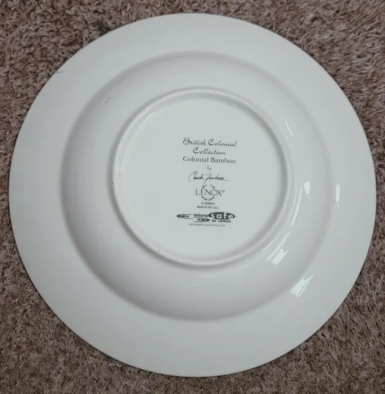 The Lenox British Colonial Bamboo Rim Soup Bowl is a round, multicolor soup pasta bowl made of fine bone china. With a diameter of 9 1/4 inches, this bowl features a colonial British design and is part of the Colony product line by Lenox. It is microwave and dishwasher safe, making it suitable for all occasions. Made in the United States, this soup bowl combines elegance and functionality, perfect for serving soups and stews in style. This bowl has never been used just sitting ina cabinet, no chips or cracks as seen in pictures.