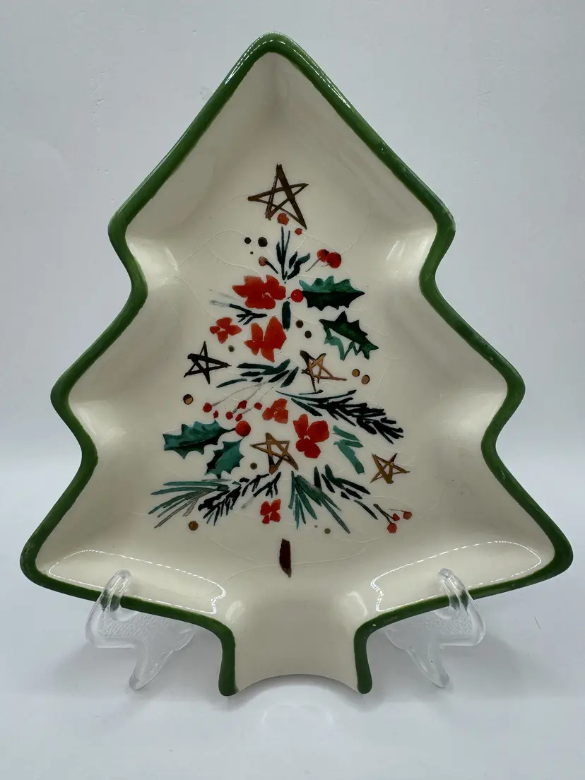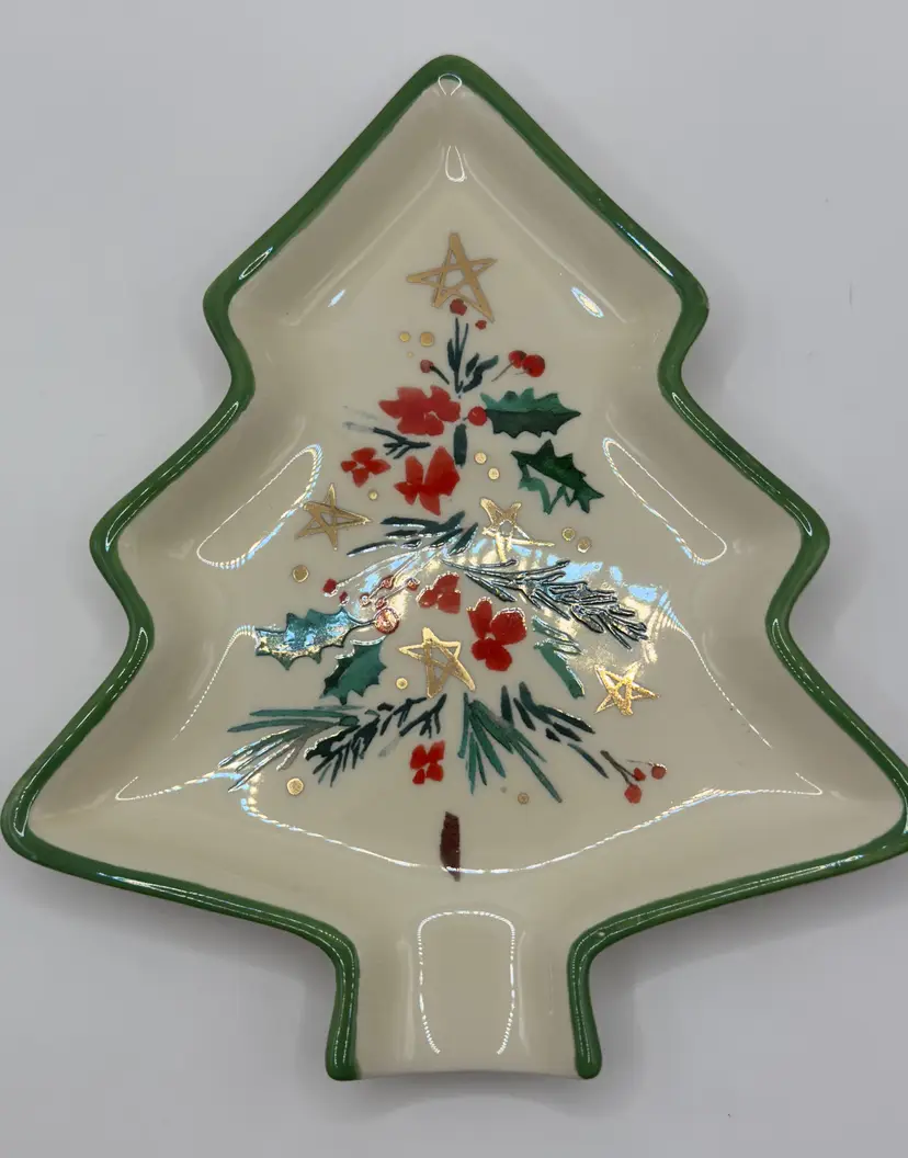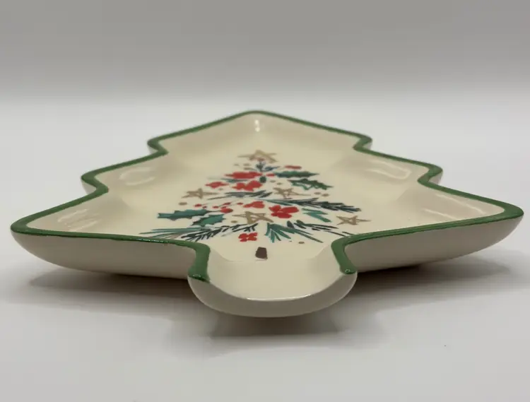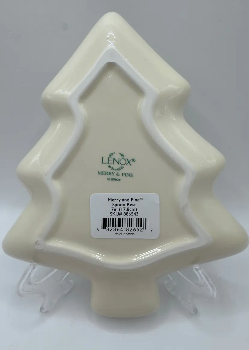 Celebrate the festive season with this charming Lenox Christmas tree shaped spoon rest. Perfect for serving holiday meals or as a decorative piece, this spoon rest features a beautiful hand-painted design with holly, pine and stars. Comes in its original box, making it a great gift option. Also comes with paperwork to register for the Lenox Breakage Replacement Program. Excellent condition, no chips or cracks. Measures 6x7 inches. Weighs 12oz.