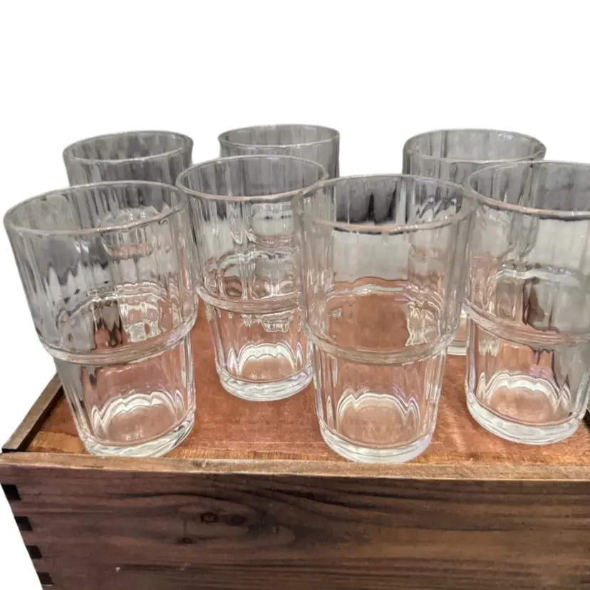These Libbey Gibralter glasses are known for their faceted paneled design & “Duratuff” treatment for added durability. They are sometimes referred to as “paneled” glasses. The design features a classic sturdy look that is often used for commercial purposes in restaurants & bars. These glasses are made of tempered glass for strength & are dishwasher safe. No cracks or chips observed.