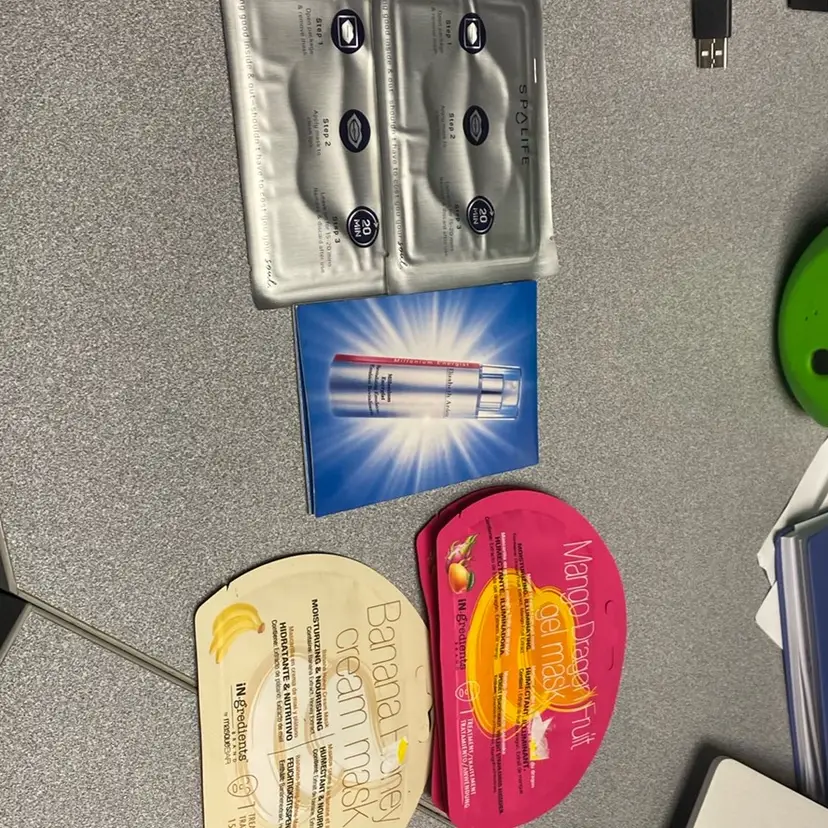 2- 1 pack spa life lip masks 1- Elizabeth Arden millennium energize revitalizing emulsion 3- 1 pack in.gredients brand mango dragonfruit gel face masks 1- 1 pack in.gredients brand banana honey cream mask