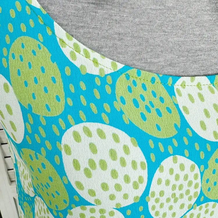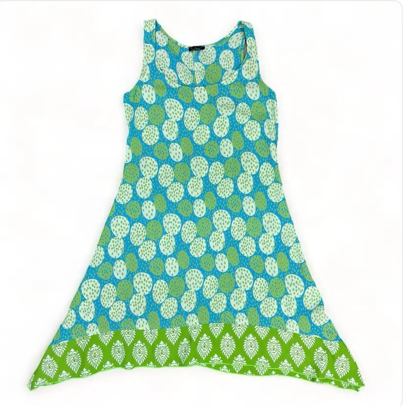Aqua turquoise blue lime green & white Multi print Contrasting hem Sleeveless Scarf handkerchief hem Scoop neck Georgette textured rayon fabric Pullover