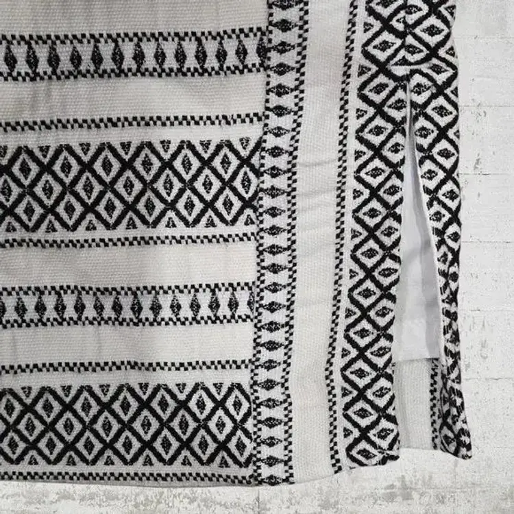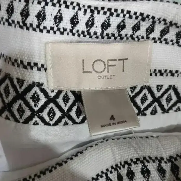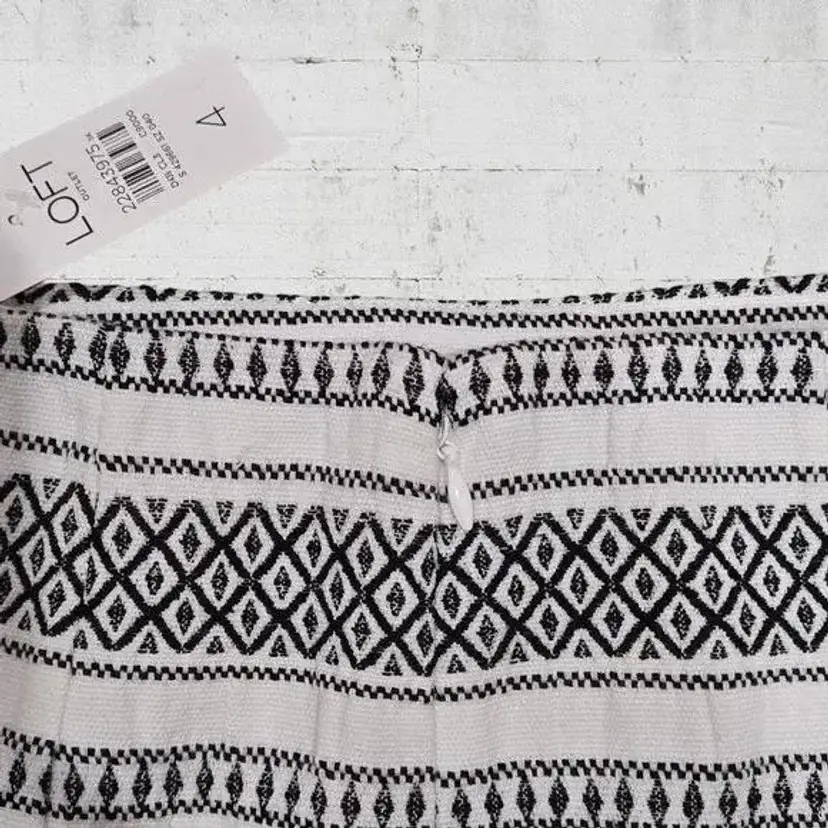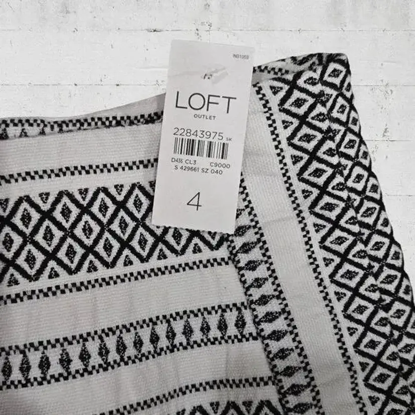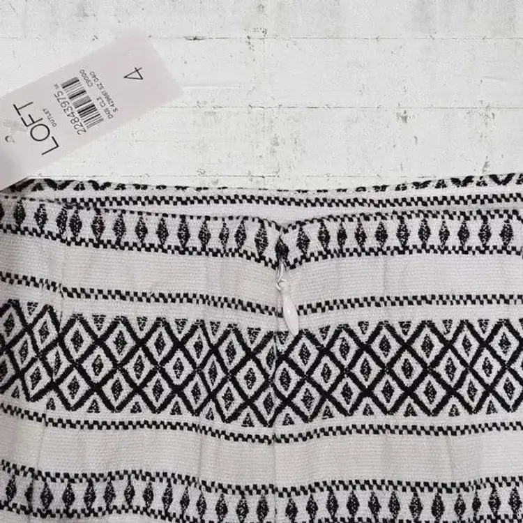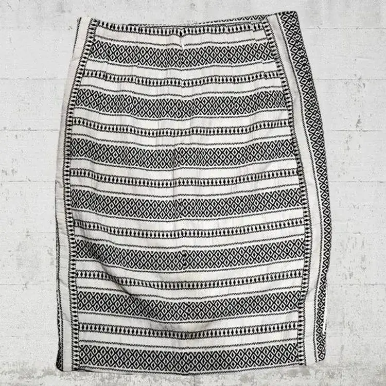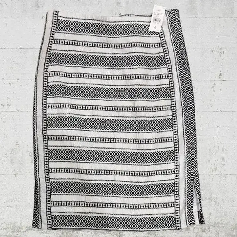 White Bodycon Skirt Brand: LOFT Size: 4 Style Name: None Color: White and Black NWT Bodycon style Midi length Aztec pattern Textured cotton outer Lined Back hidden zip closure Side split hem No stretch Waist: 14.5" Top to Bottom: 22.25" Shell: 100% Cotton Lining: 100% Polyester