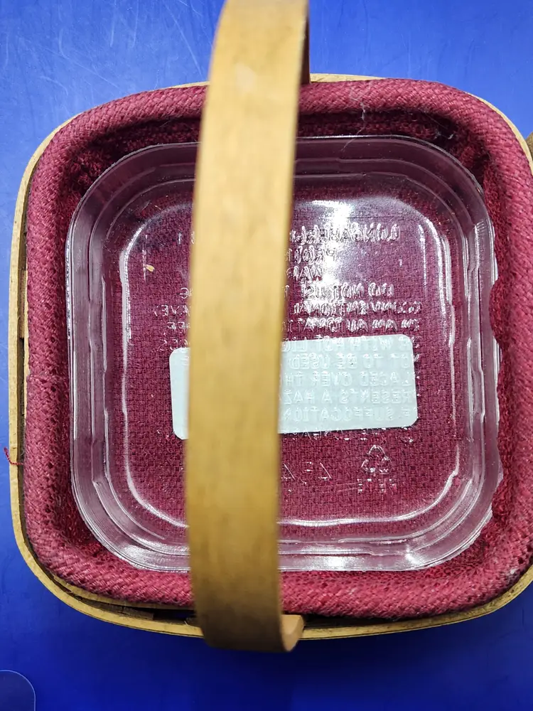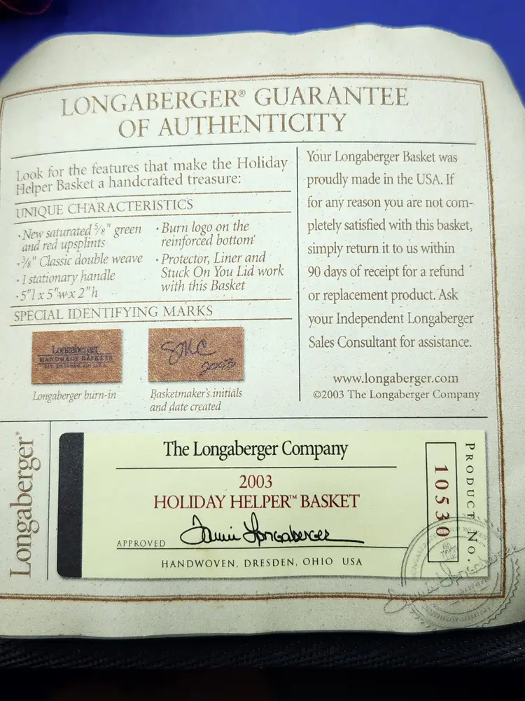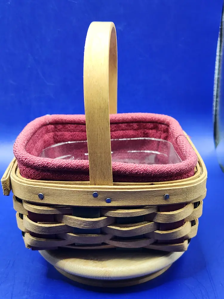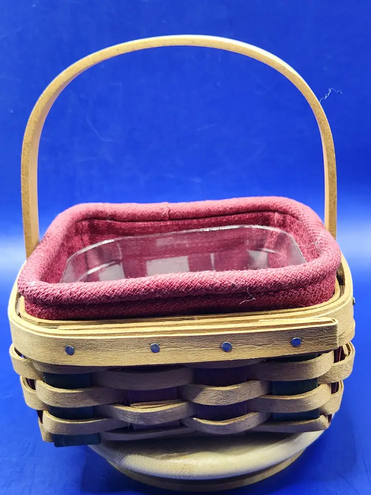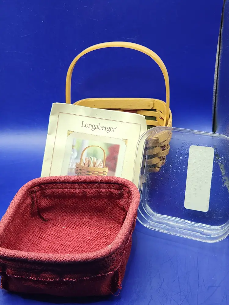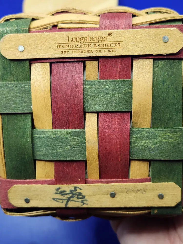 Longaberger 2003 Holiday Helper Basket Red and green weave design Measures approximately 5 inches wide and tall Includes plastic liner, cloth liner and pamphlet with guarantee of authenticity The cloth liner is bit faded but otherwise in excellent condition
