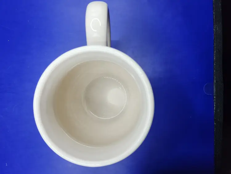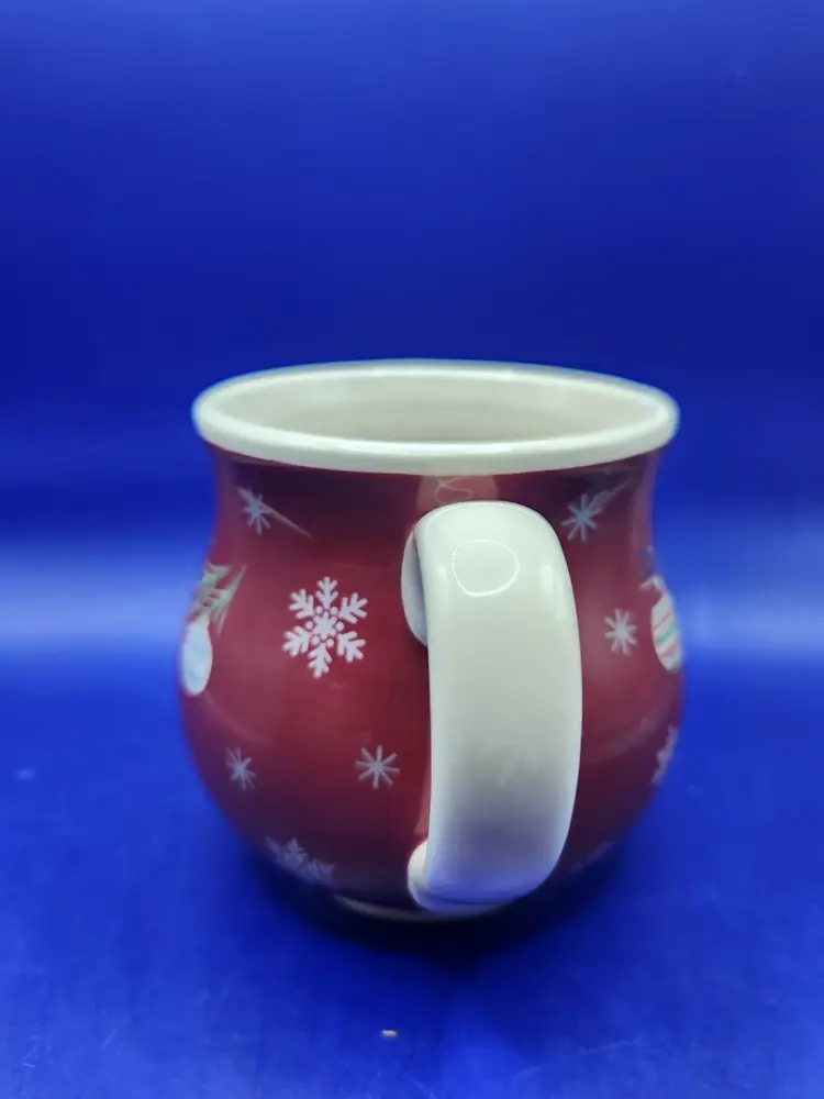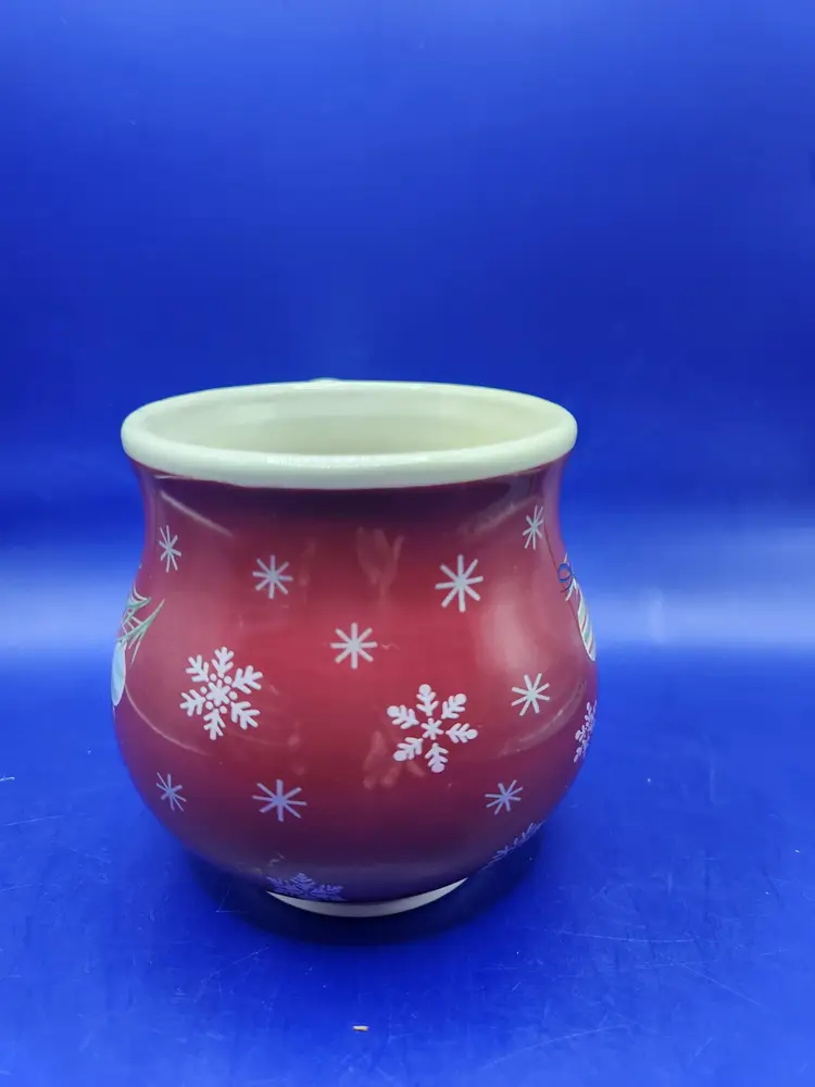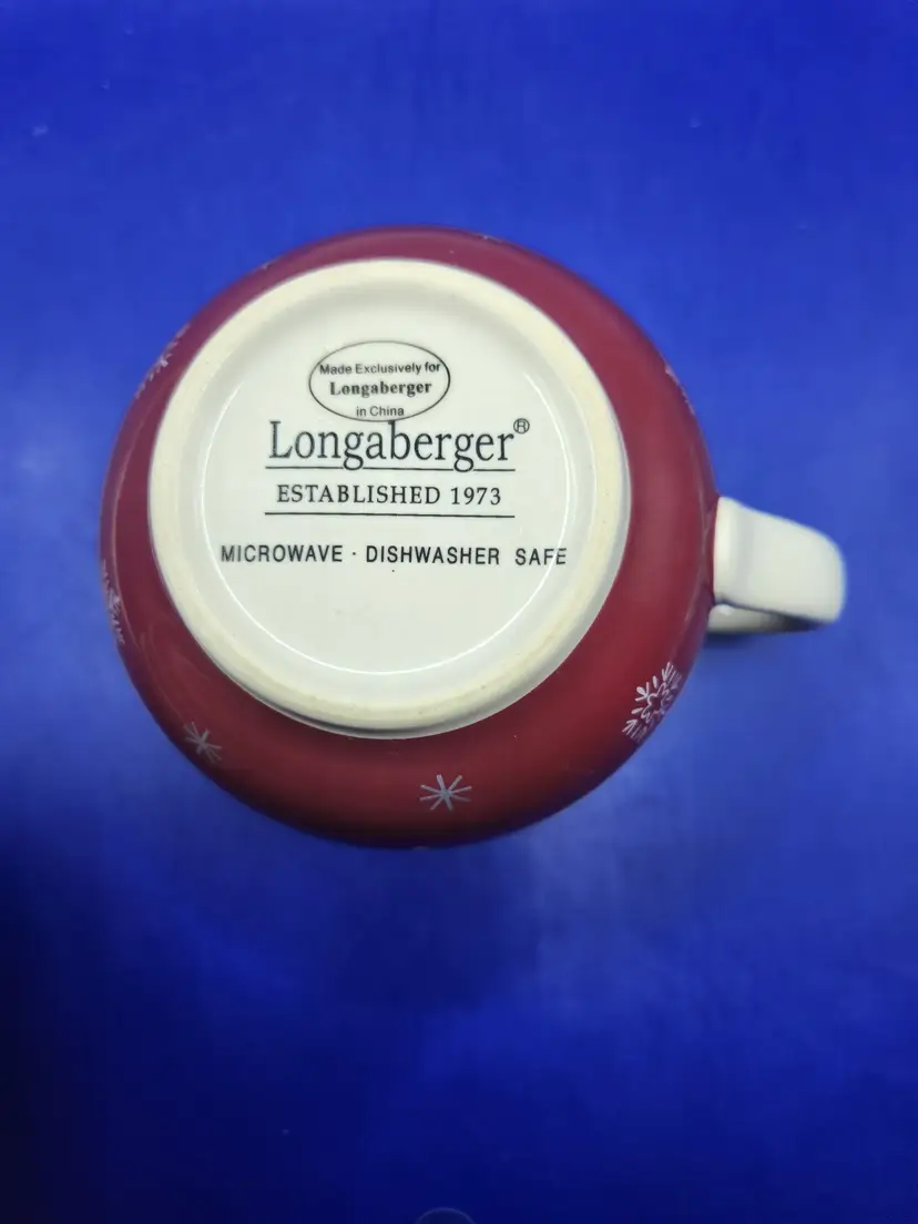 Longaberger Christmas Red Mug Measures 4 inches tall with mouth opening of 3 1/2 inches Holds approximately 16 fluid ounces No chips or cracks but inside bottom does have crazing