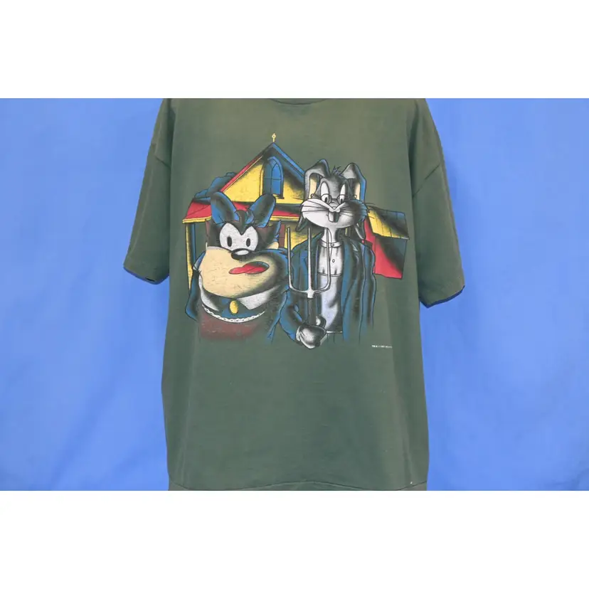 26.5x29, t-shirt parodying Grant Wood's famous painting American Gothic, featuring the Looney Tunes characters Bugs Bunny & Taz. There are some spots and a small holes on the back, see pics.