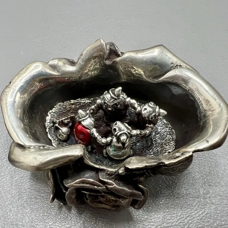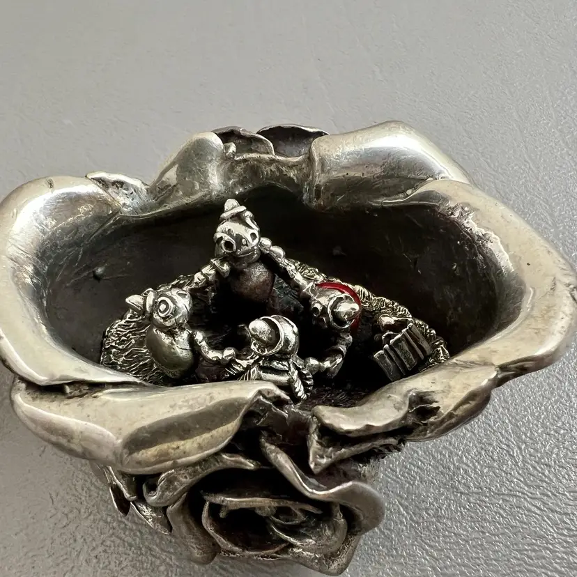 Throughout 1998, HK issued four limited edition double roses, each with distinctive exterior colouration and interior scenes. As a grand finale to this exceptionally popular series, HK produced “The Double Sterling Rose,“ limited to an edition of 1500 pieces and initially offered to Queen Empress dealers only. Crafted in solid sterling silver by Robert Glover who does commissions for the British royal family, this piece has been sanctioned by the London Assay Office. The interior portrays Lord Byron and three of his bug friends, hand-in-hand around a bonfire, donning party hats. Lord Byron is enameled in red. Hallmarks include ©, star, HBC logo, M, and RG.