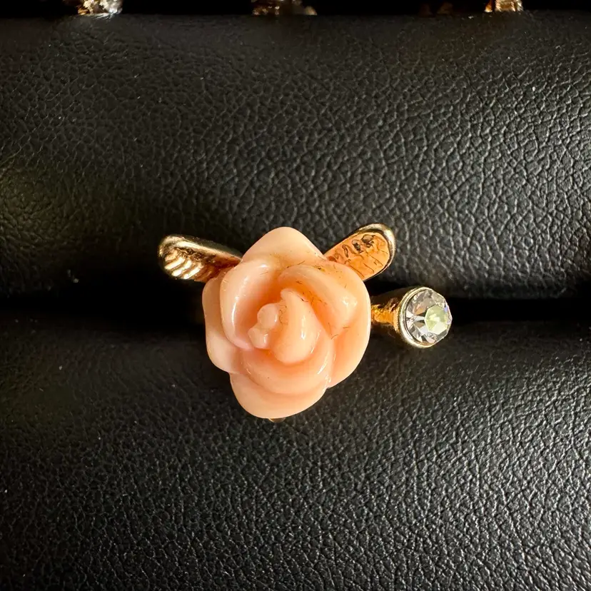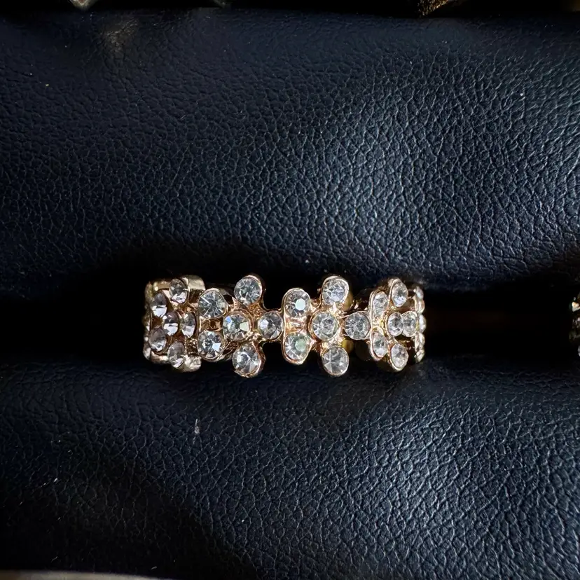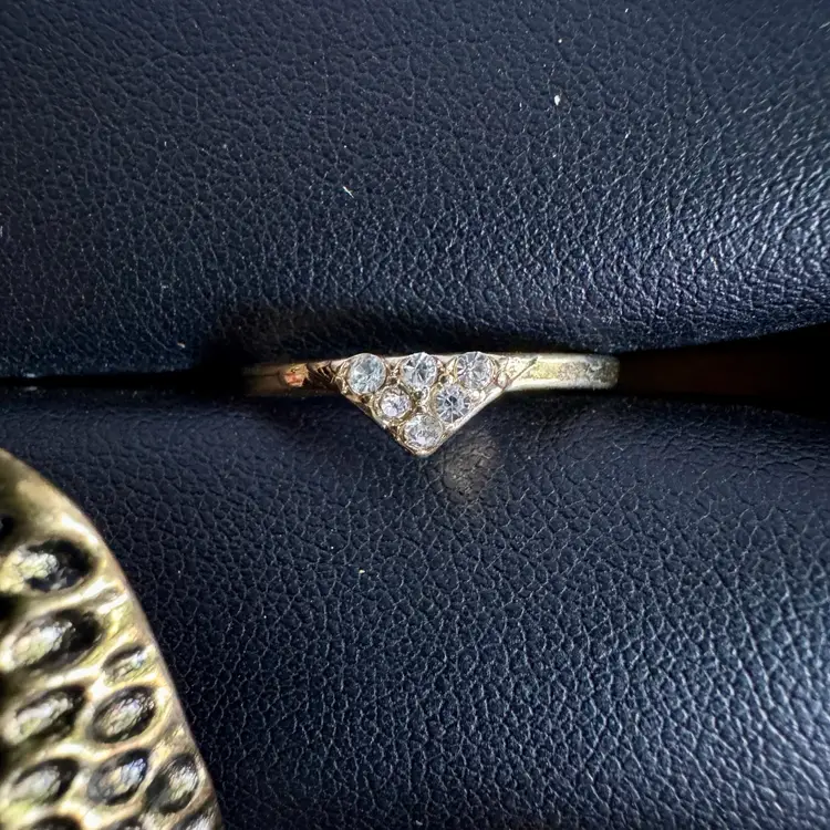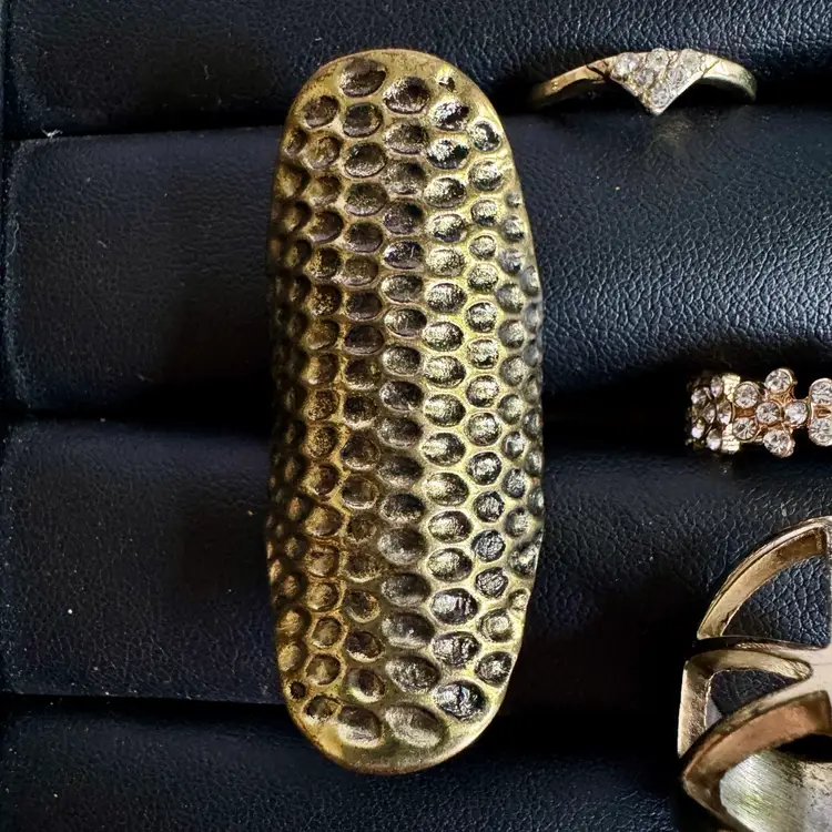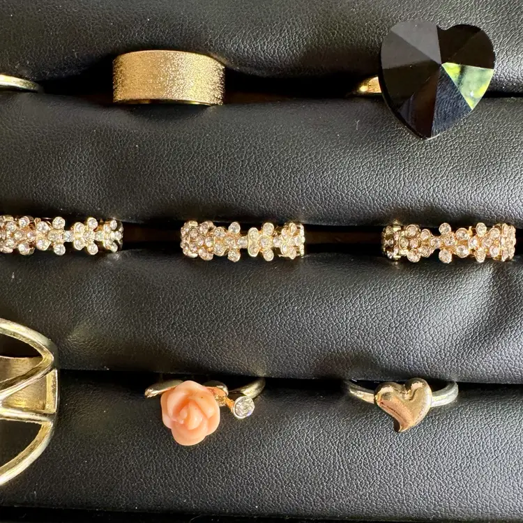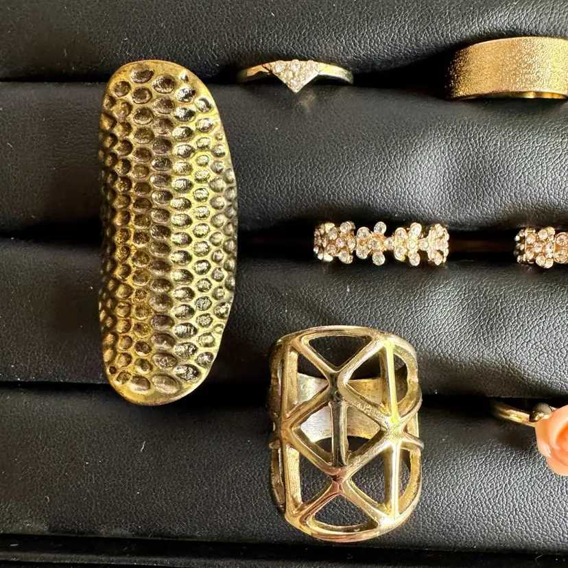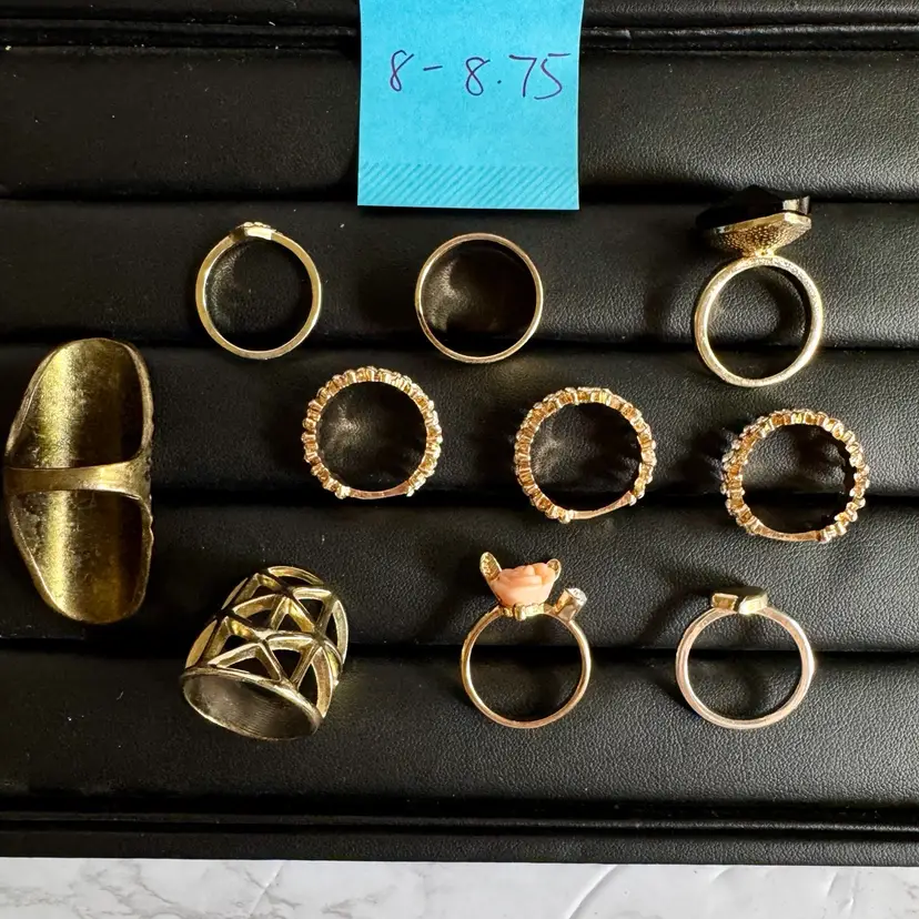 Gold tone. Some might have missing rhinestones. Combination of metal, glass, plastic, rhinestone. All with minor signs of wear.
