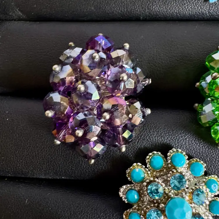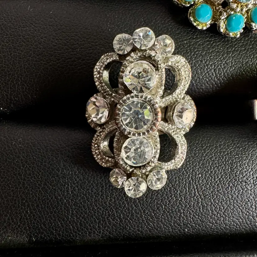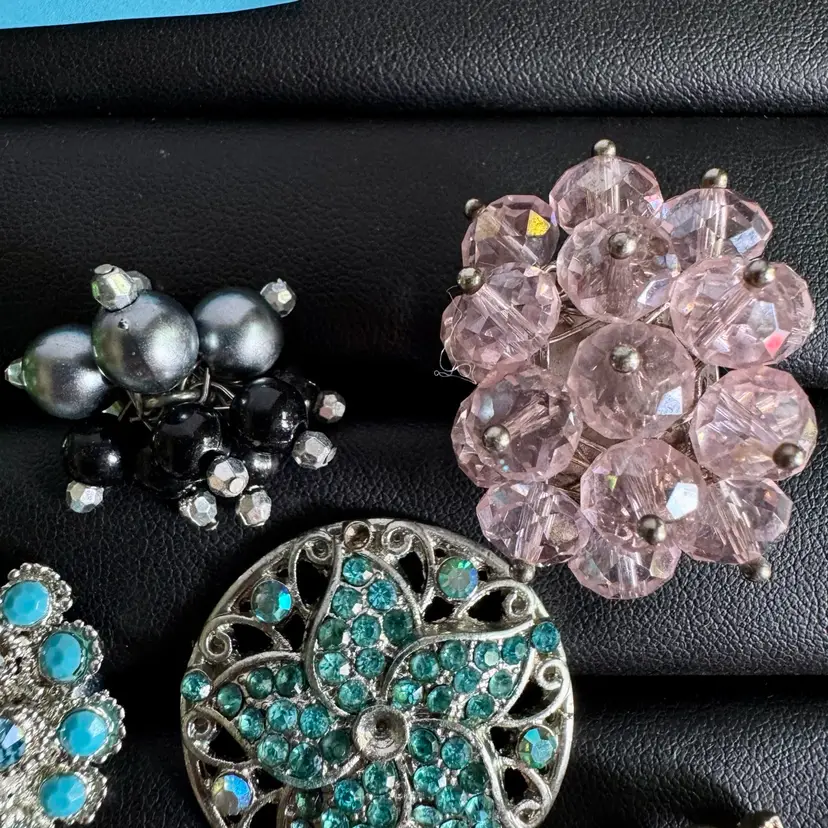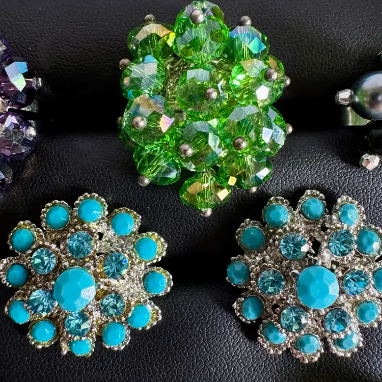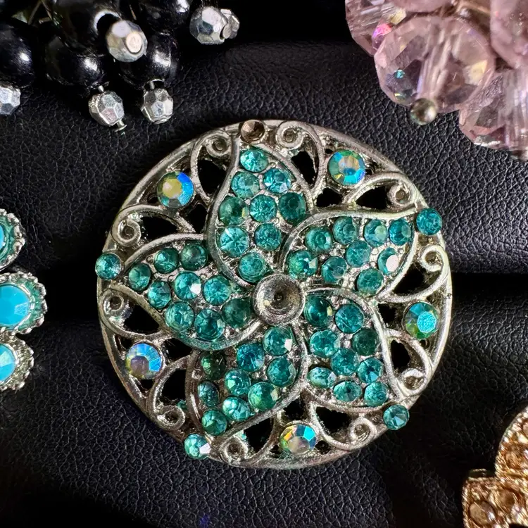 Silver & gold tone. Some missing rhinestones. Combination of metal, glass, plastic, rhinestone, beads. All with minor signs of wear.