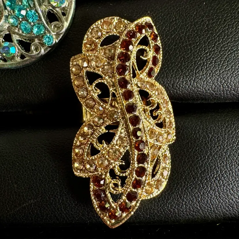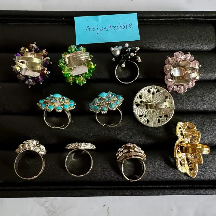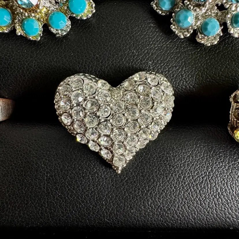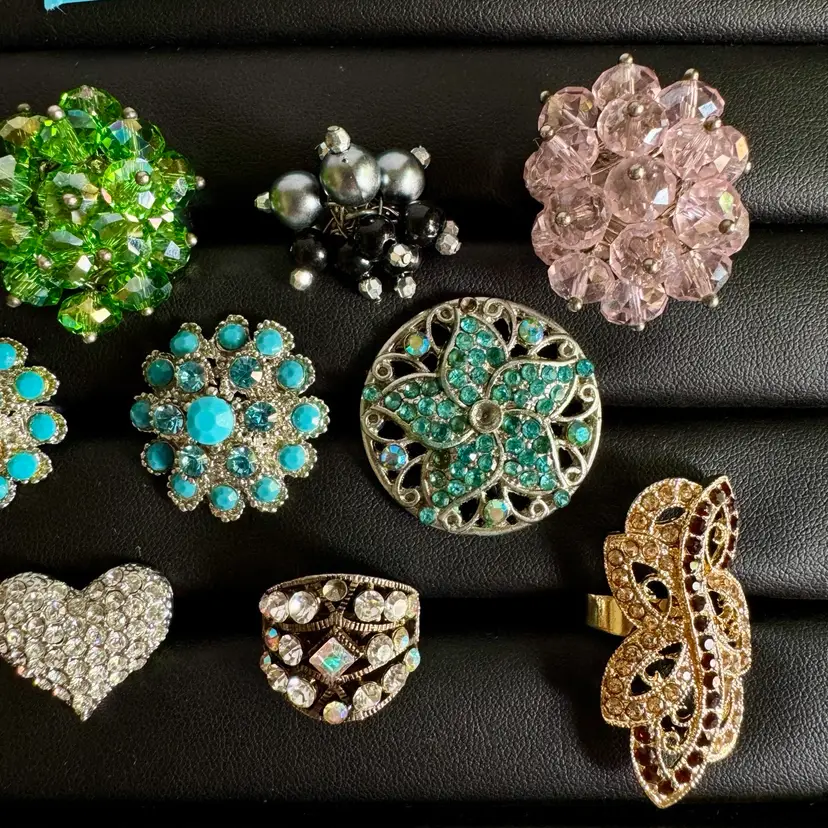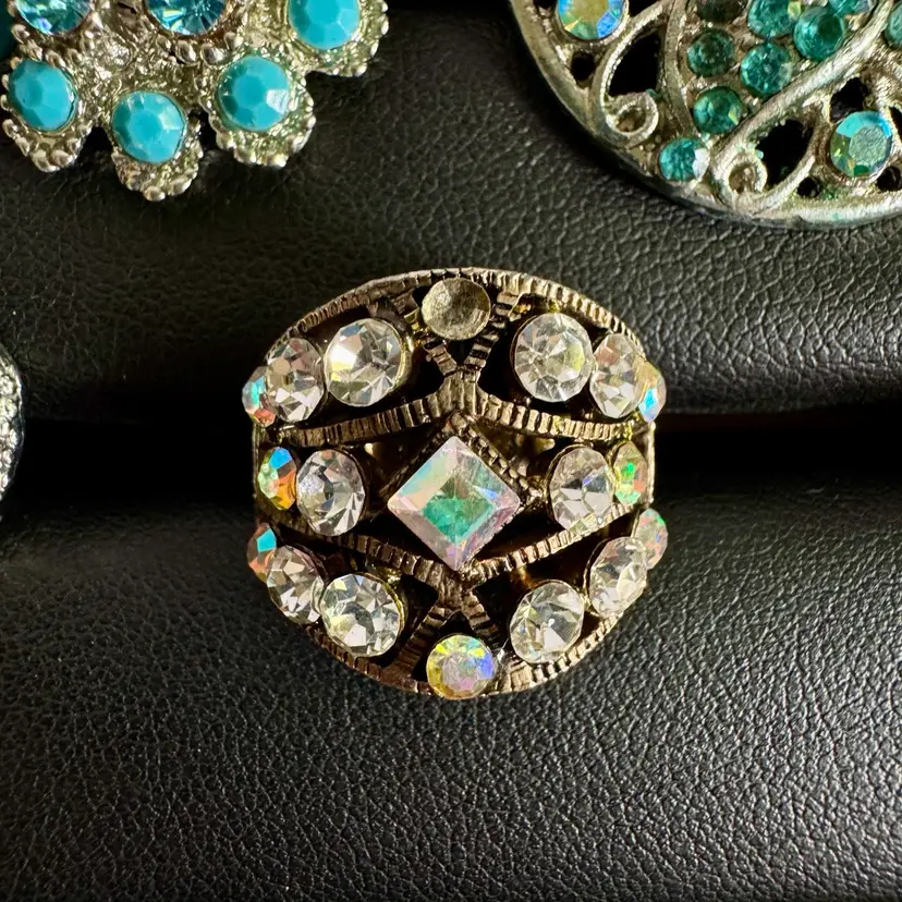Silver & gold tone. Some missing rhinestones. Combination of metal, glass, plastic, rhinestone, beads. All with minor signs of wear.