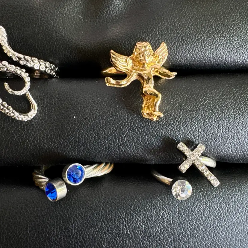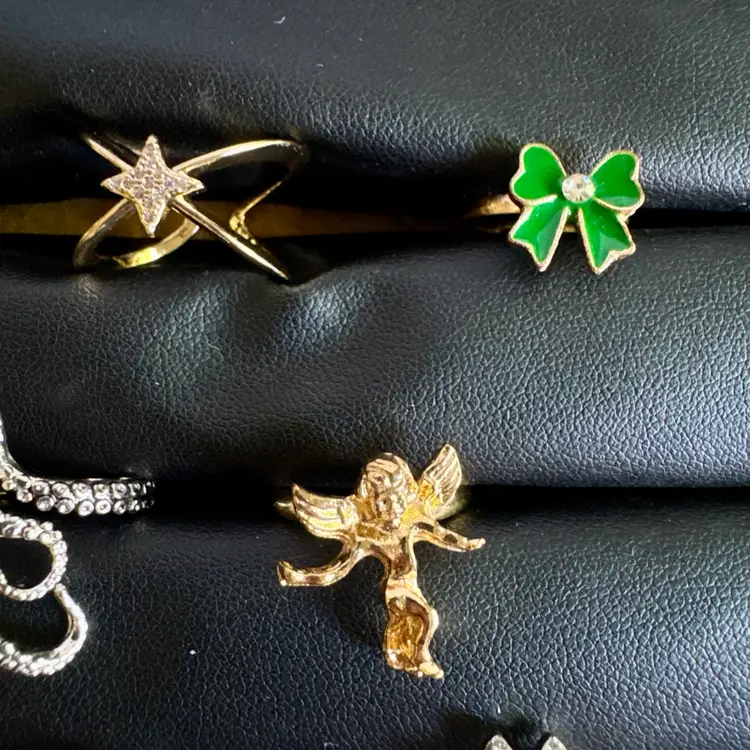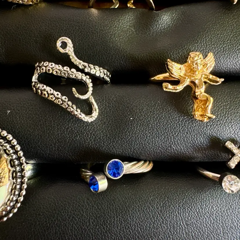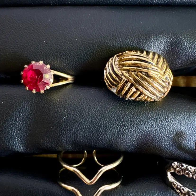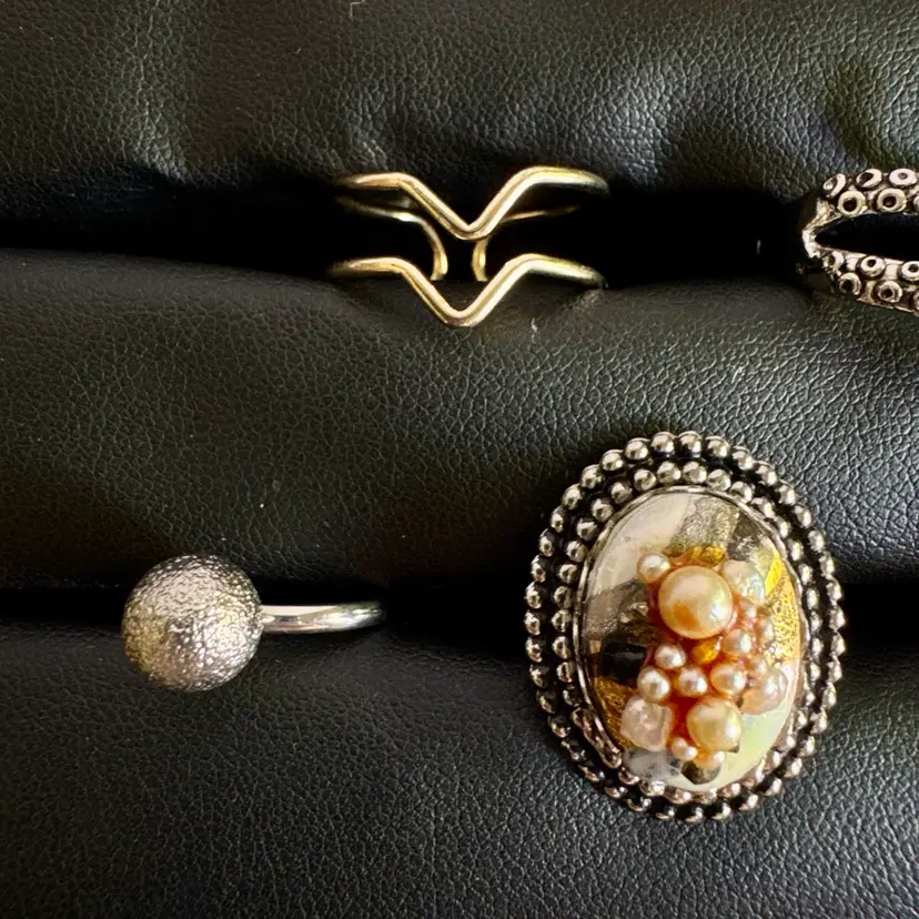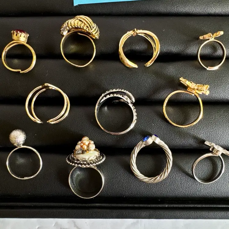 Silver tone & gold tone. Some might be missing rhinestones. Combination of metal, glass, plastic, rhinestone, faux pearls, beads. All with minor signs of wear.