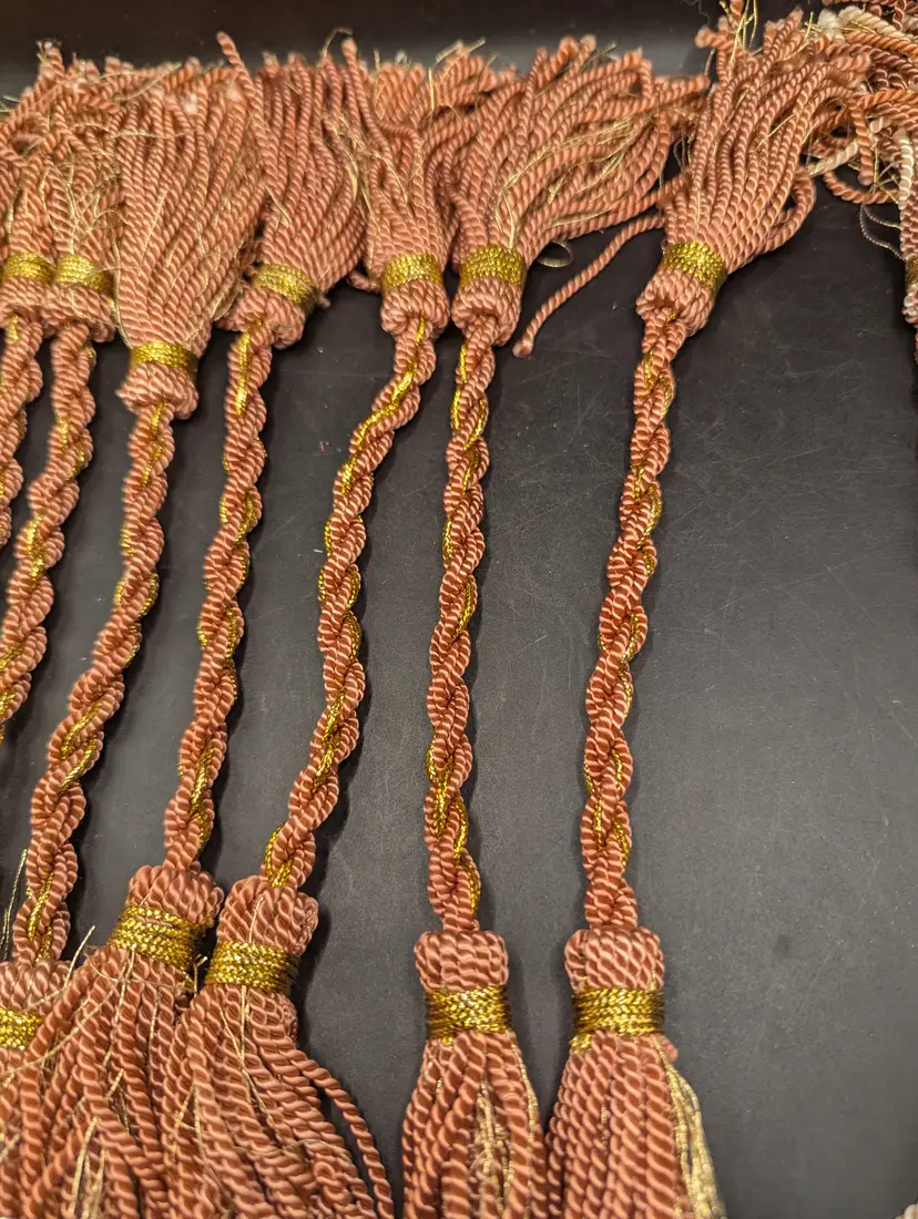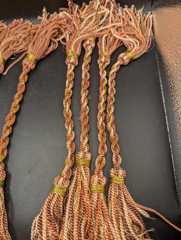 This is a lovely Lot of 12 Christmas Tree Rope Garland Tassel Ties 8 Victorian Pink and Gold 4 Tri Color Pink and Gold. Each one measures 12" long to wrap around branches. Please see all pictures for condition and details.