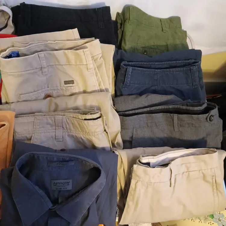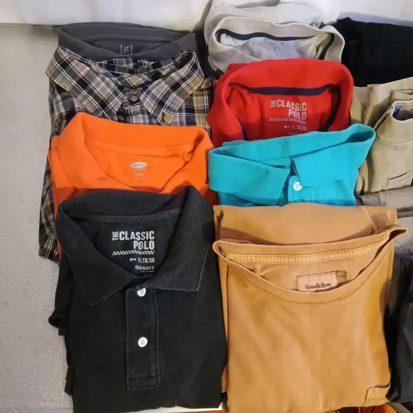 This is a 16 item bundle manifested w mostly old navy but has a few others. Generally 100% Cotton. The Goodfellow green shorts have a slight tear on the button hole pocket (see photo).
