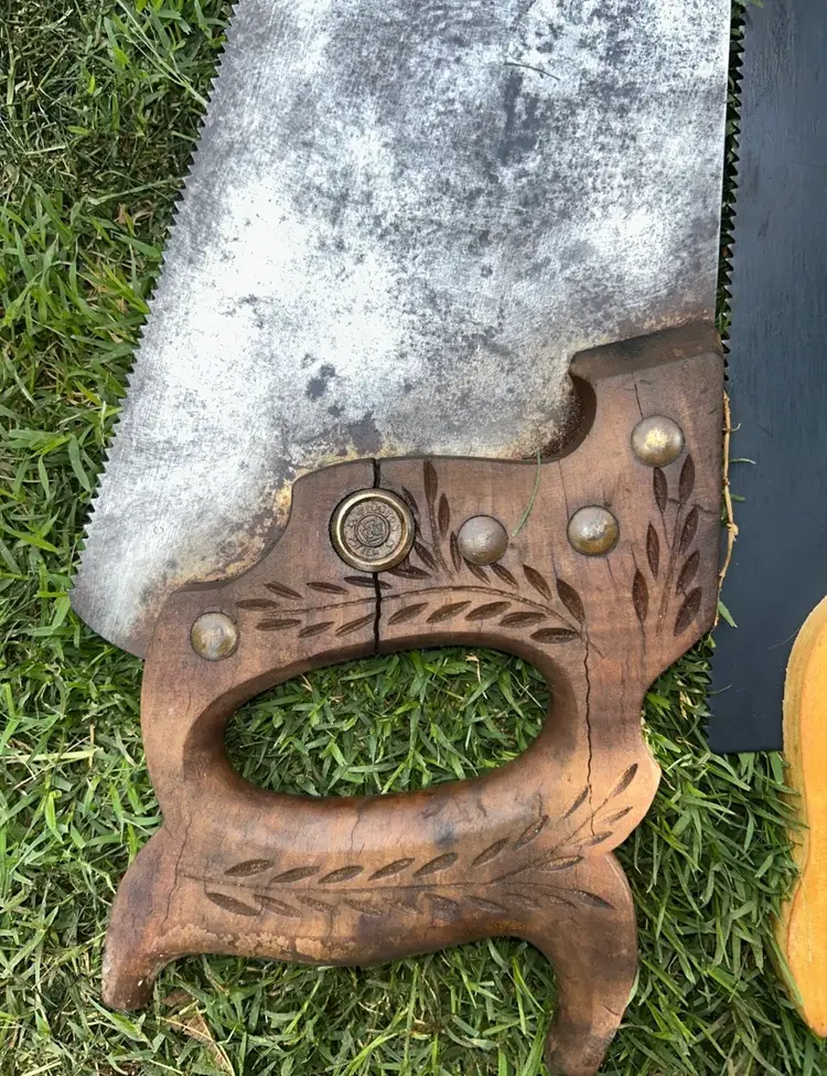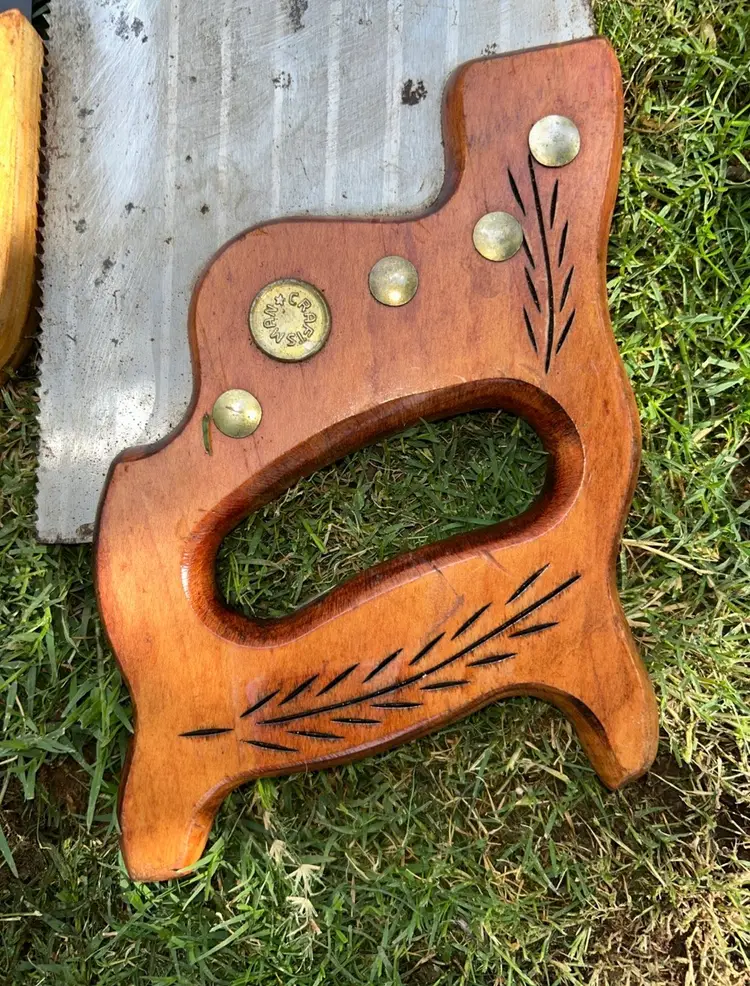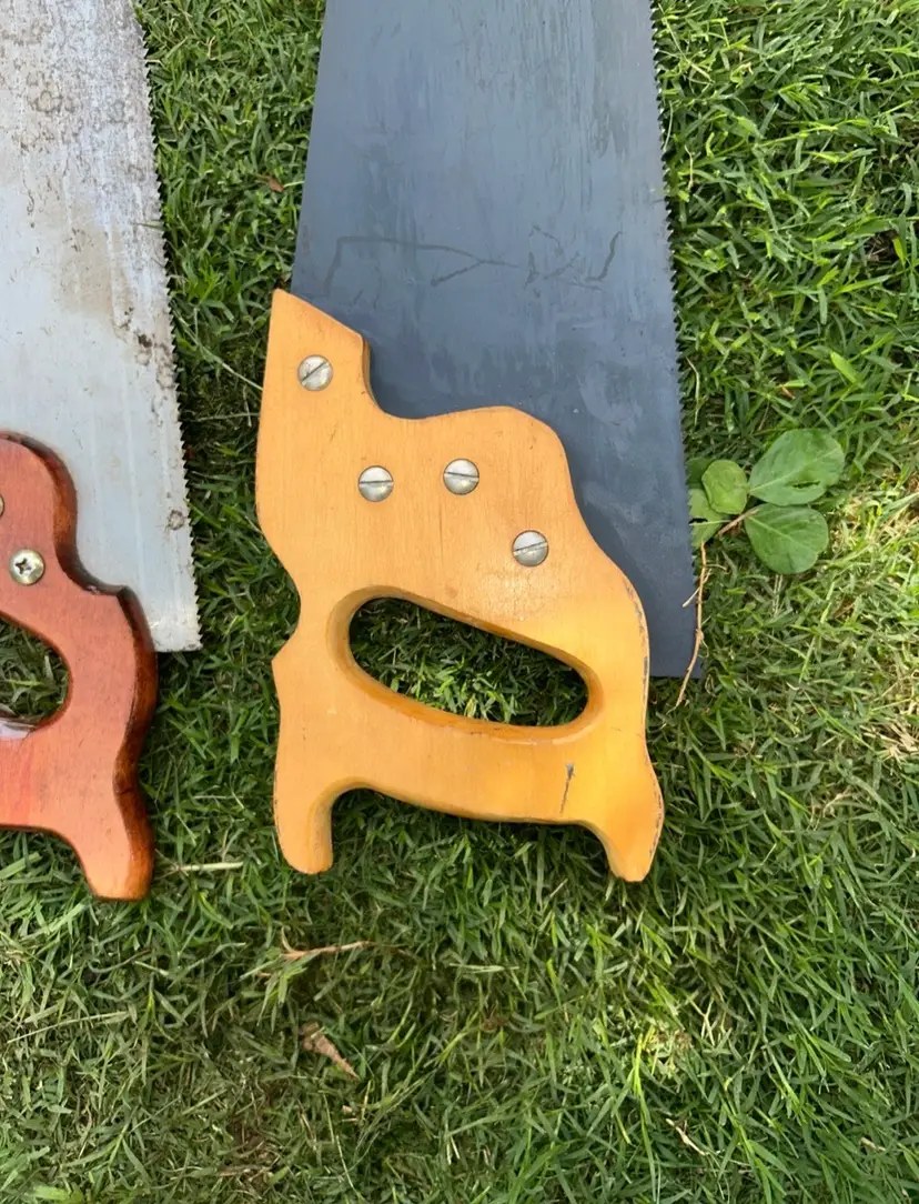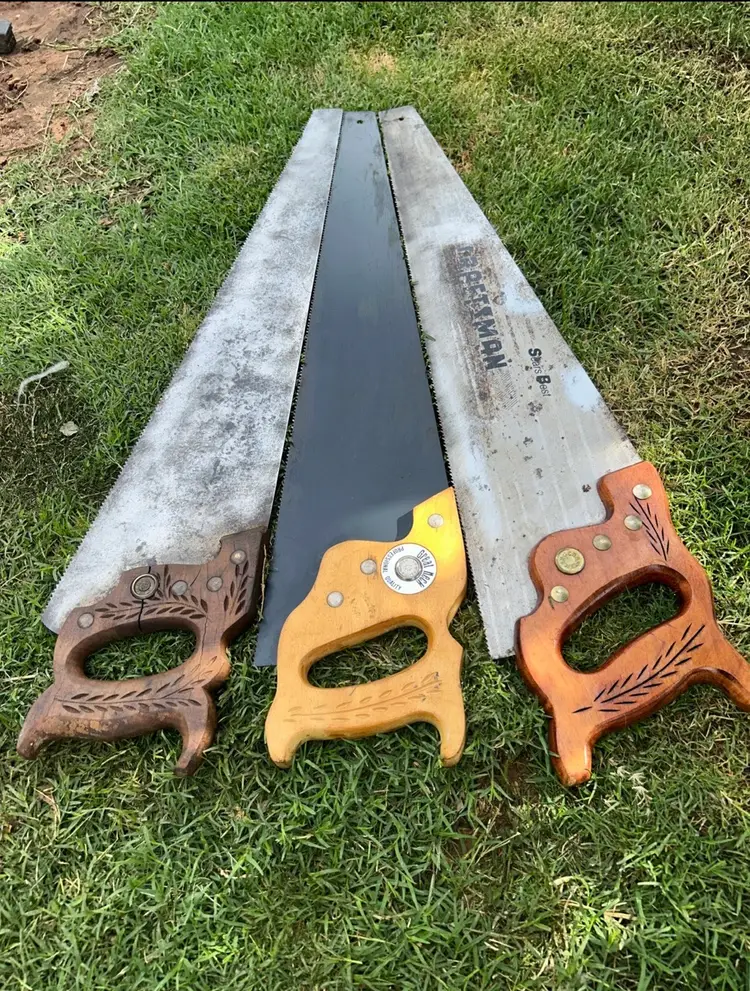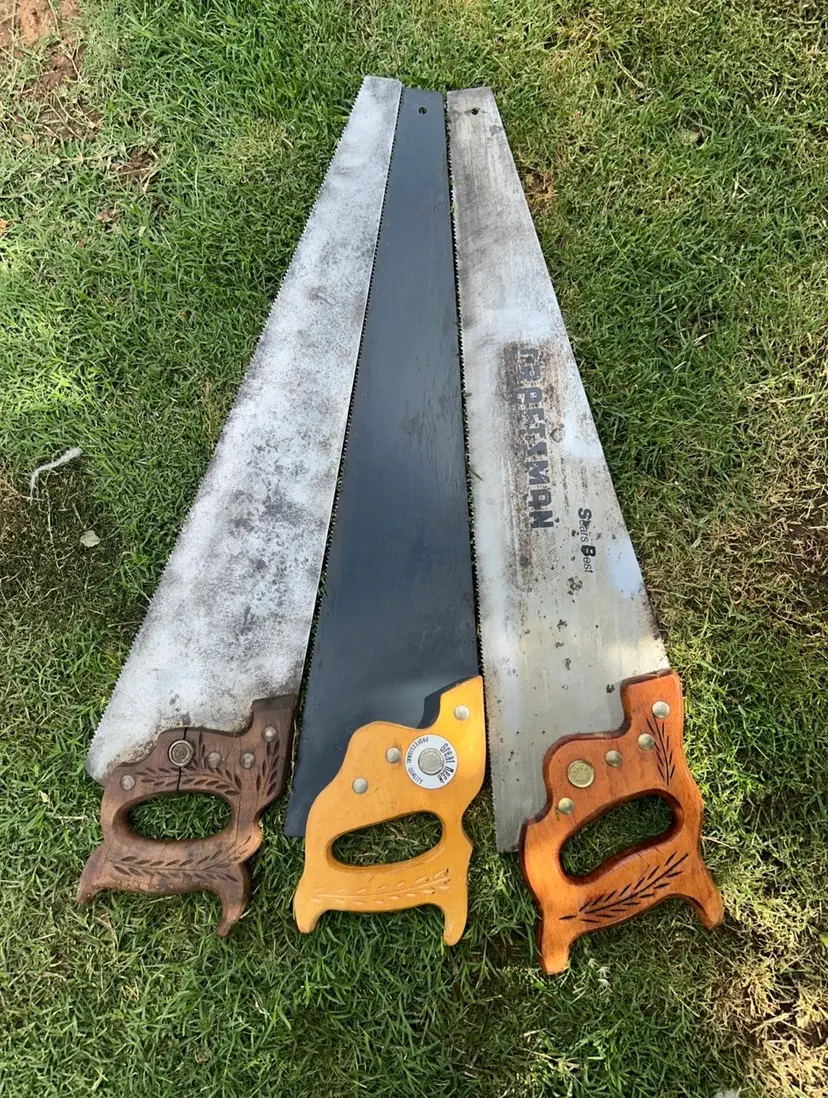The product is a lot of 3 hand saws with 26" blades, featuring a 10 point design. They are from various brands including Disston, Craftsman, and Sears, all with steel blades and hardwood handles. Made in the United States, these hand saws are durable and versatile for various cutting tasks in the home and garden. The multicolor design adds a visual touch to the tools, while the high-quality materials ensure long-lasting performance. Perfect for a workshop or tool enthusiast, this set of hand saws is a valuable addition to any collection.