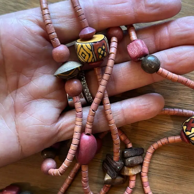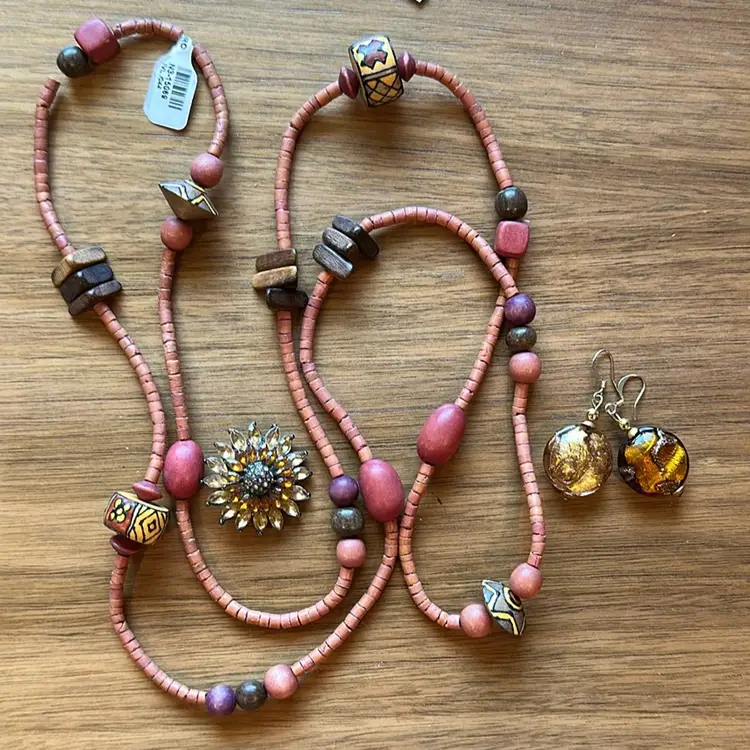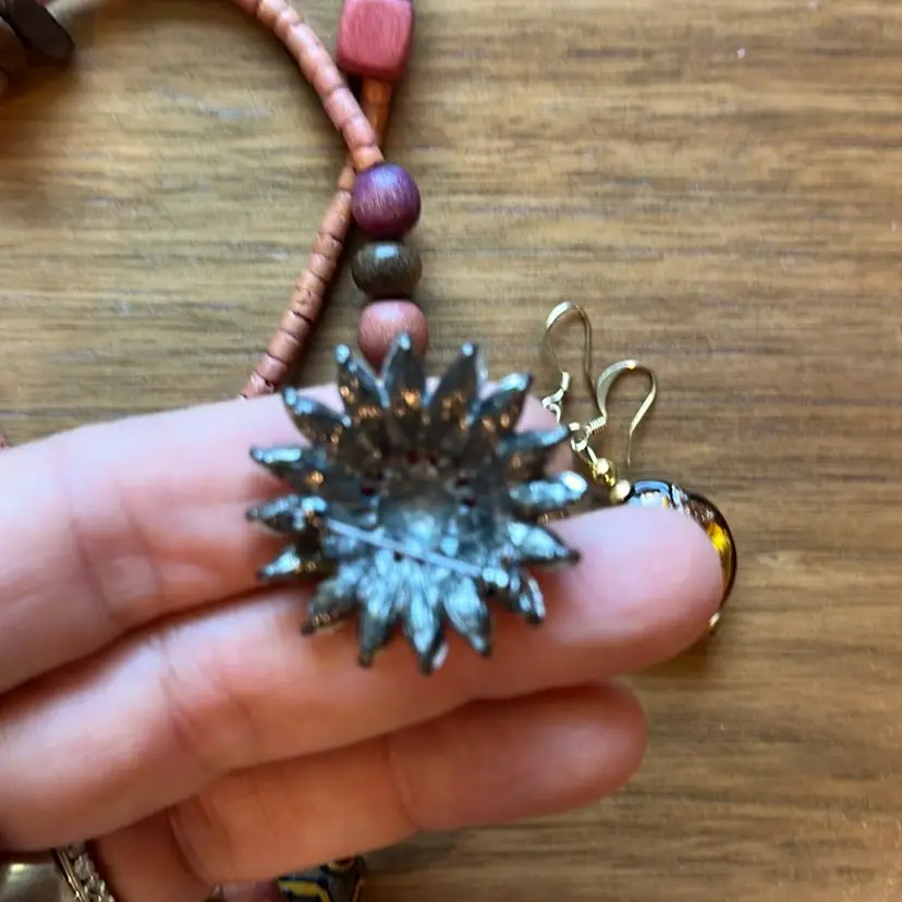 Lot of 3 fall crystal sunflower, pen, glass, designer earrings, and 28 inch chunky bead neck