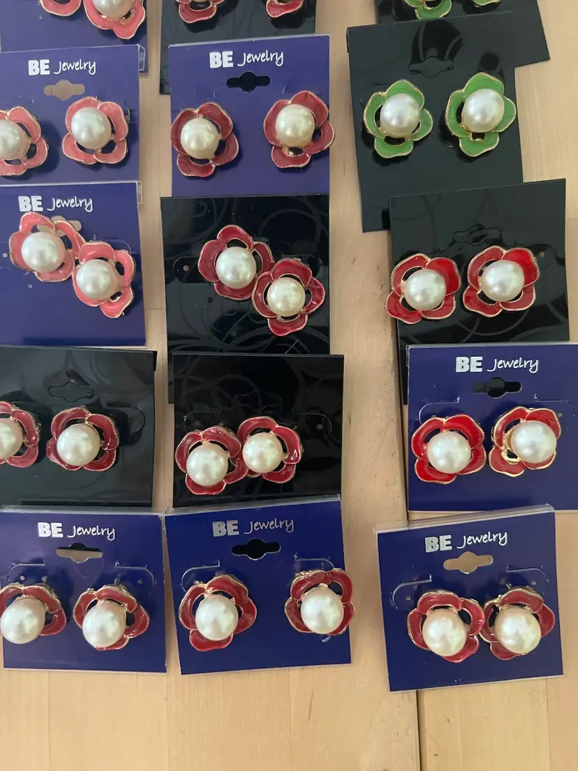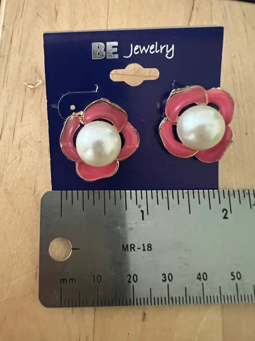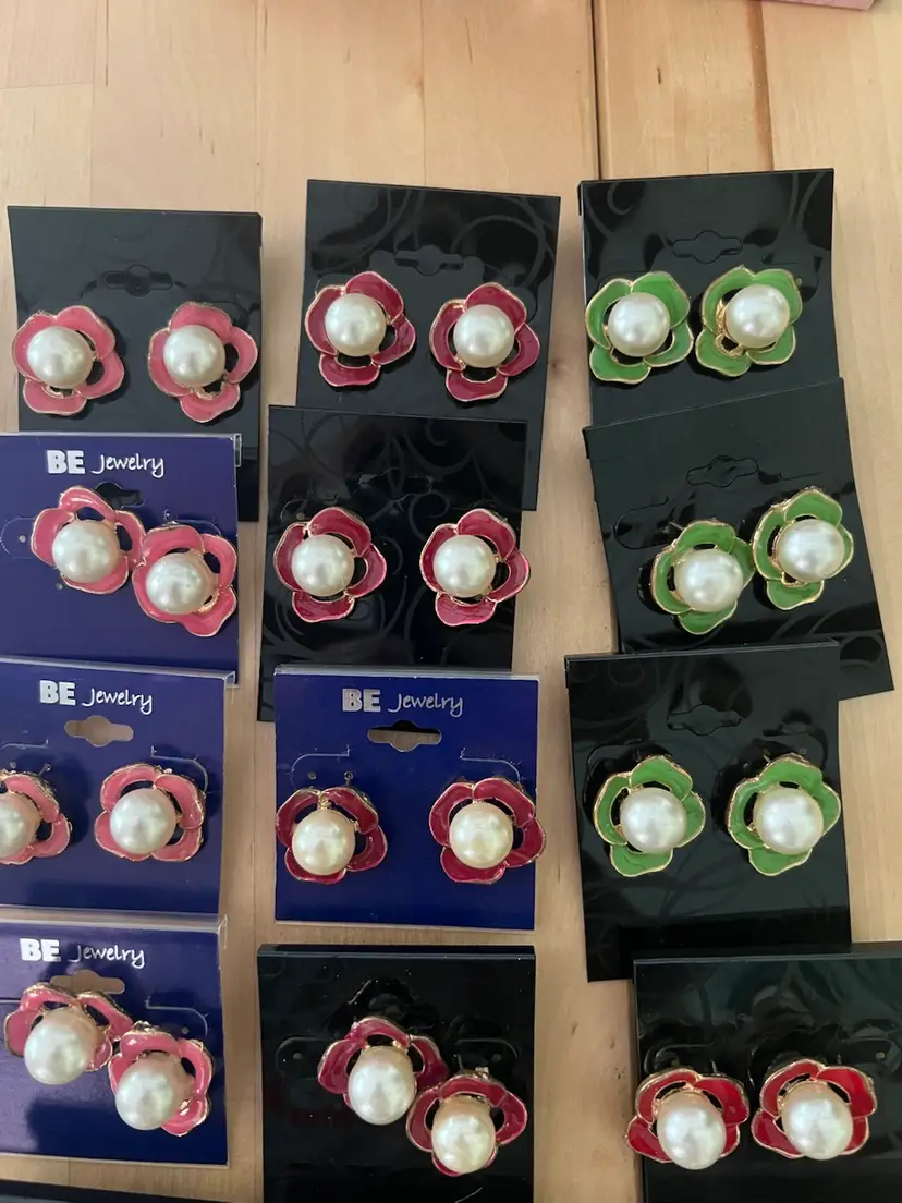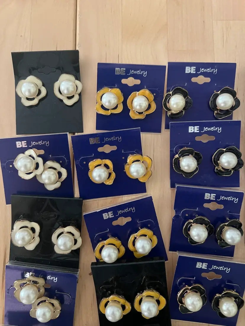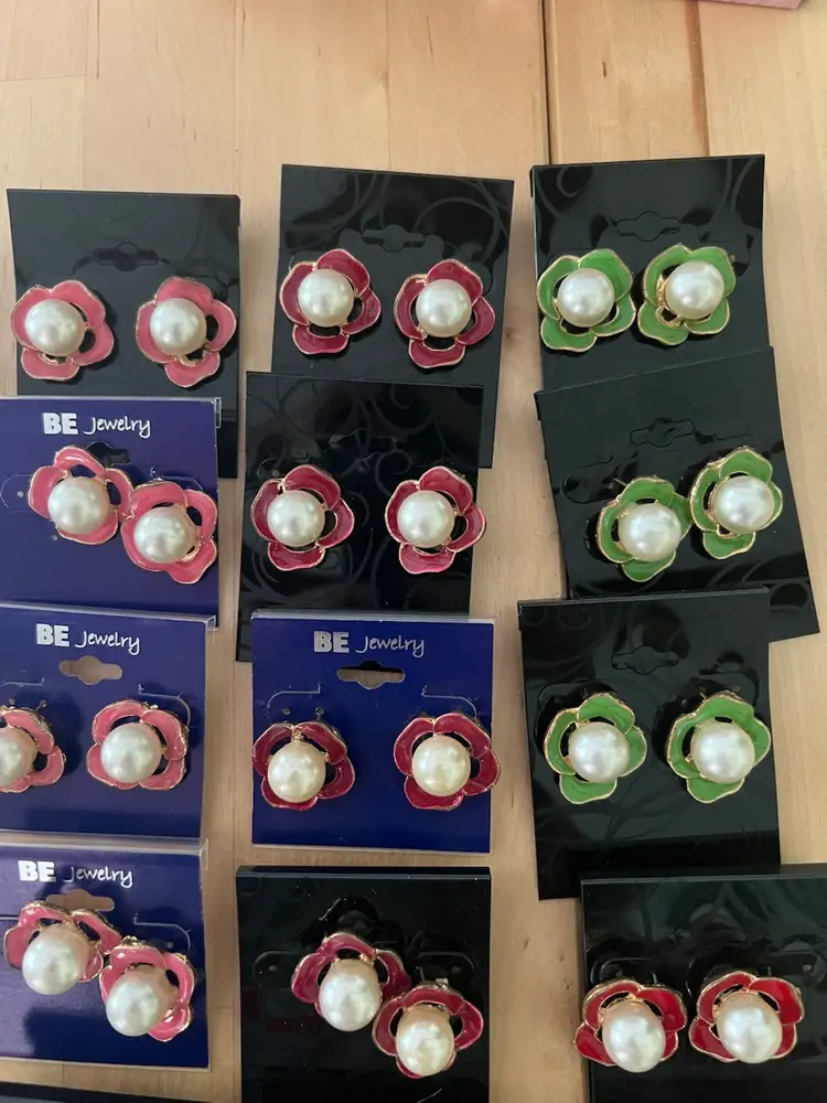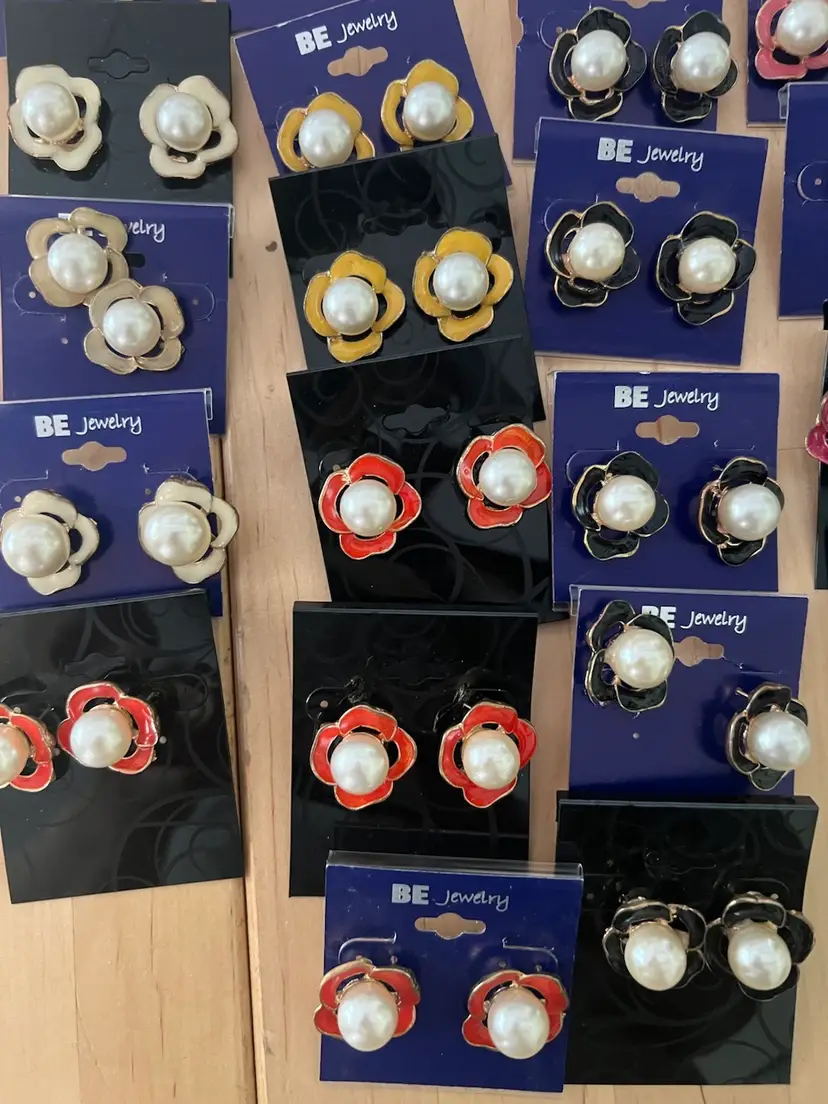 Lot of 38 enamel and gold tone stud earrings in flower shape with faux pearl center Assorted colors as shown About 3/4” diameter See photos for size, detail and complete lot you get