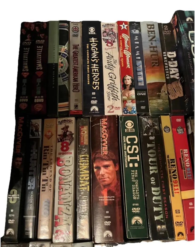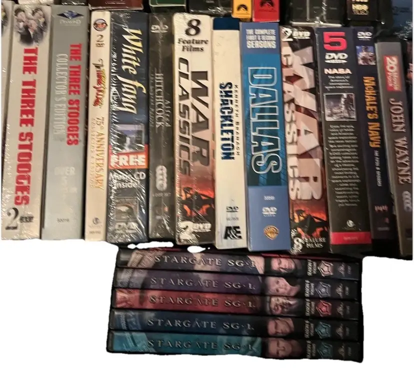 Sealed collections: War Classics, white fang, Alfred Hitchcock, three stooges, have gun - will travel, Abraham & mary, Combat, Bonanza, Andy Griffith.
