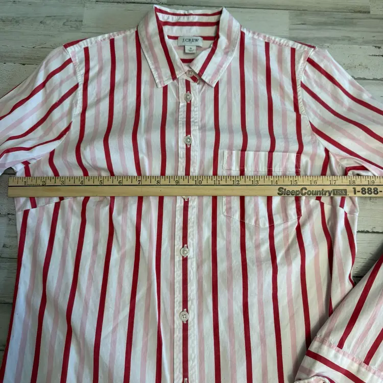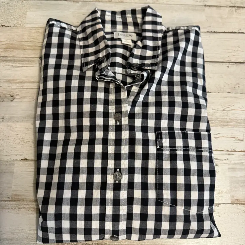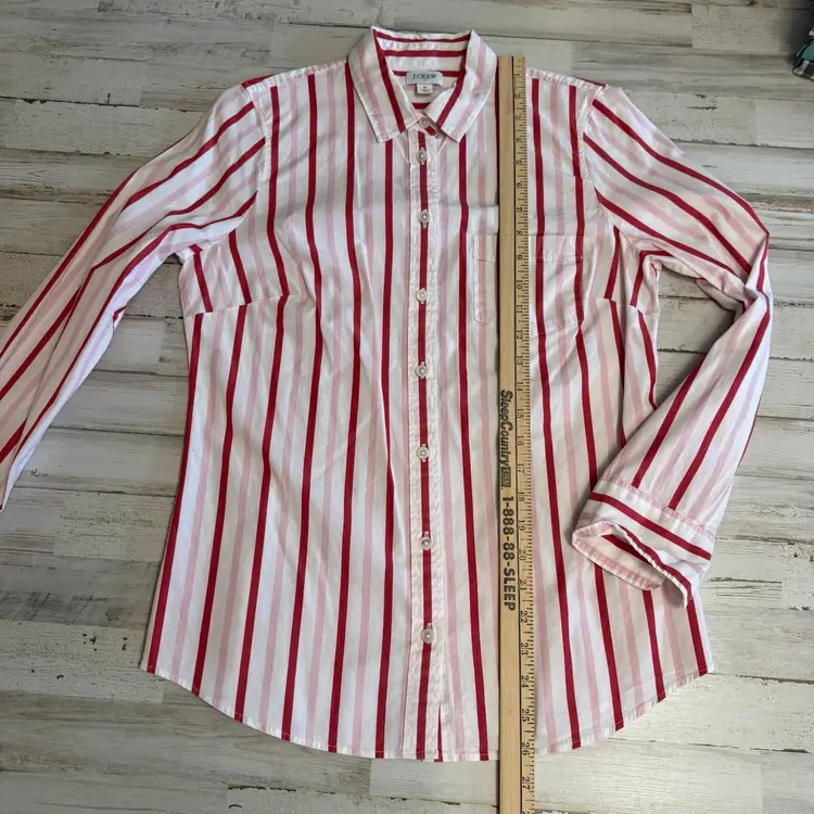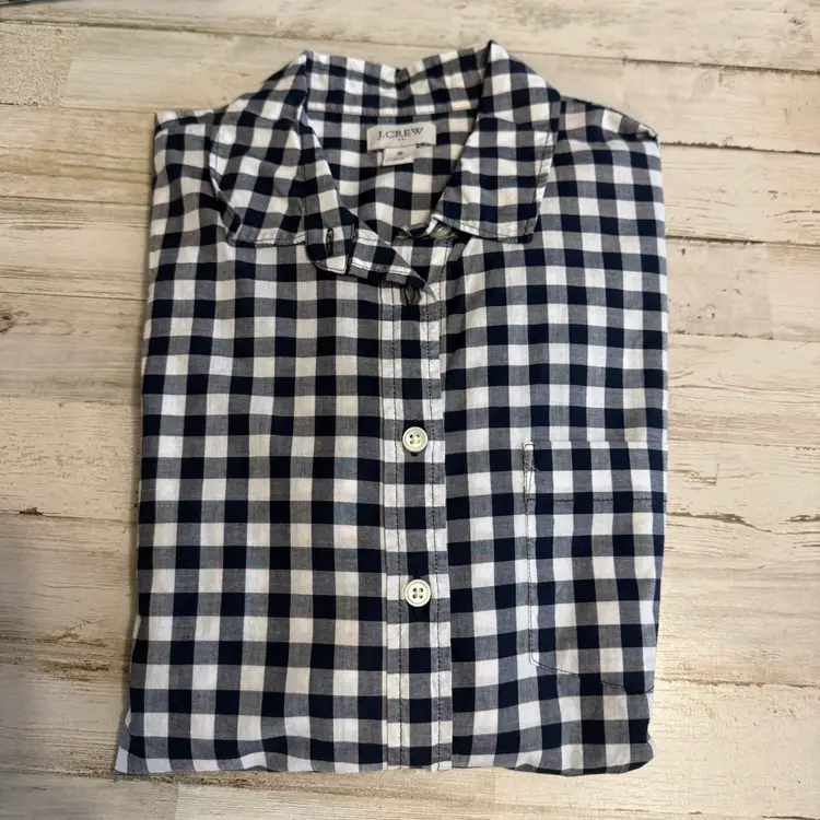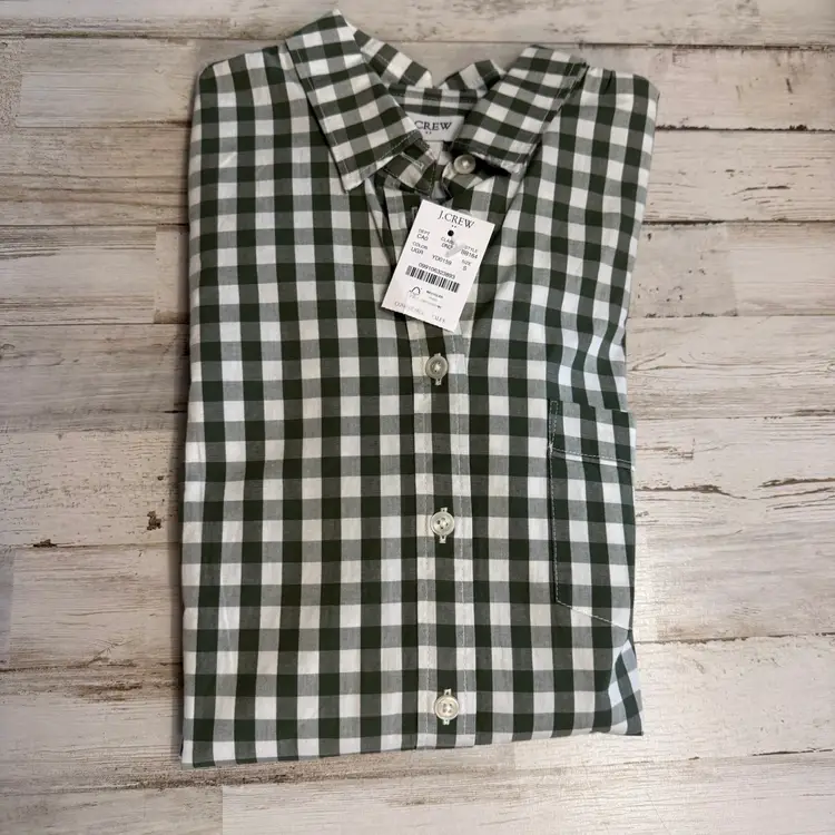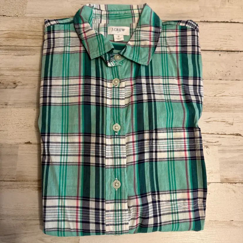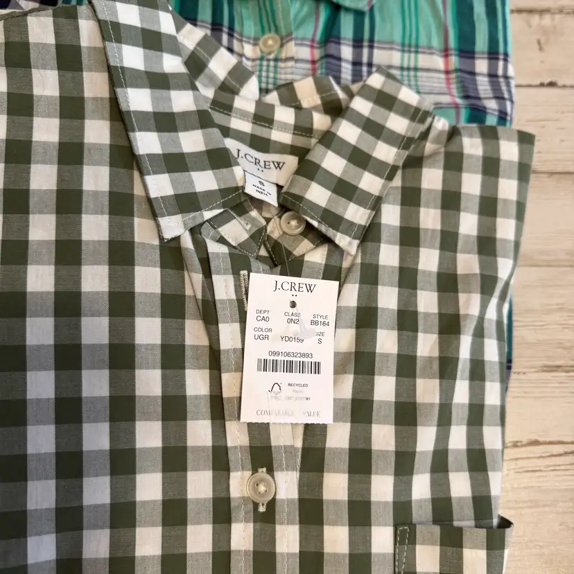 ✨ Details: • Brand: J.Crew Factory • Size: Smalls • Styles include: • Red & white vertical stripes • Black & white gingham check • Navy & white gingham check • Green & white gingham check • Green, teal, and pink plaid • Classic button-front style with collars and chest pockets • Approx. measurements (red stripe shirt shown): • Pit-to-pit: 18” • Length: 26.5”