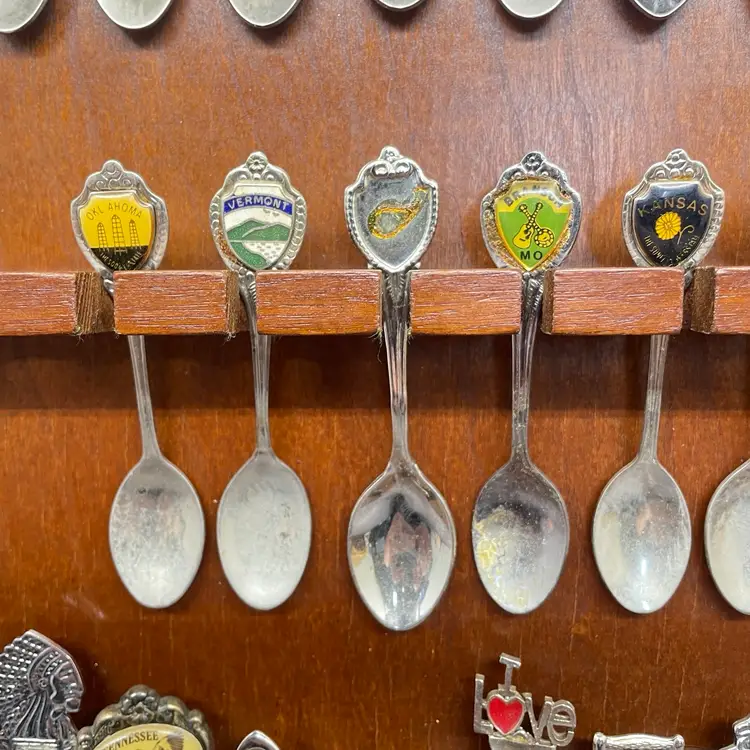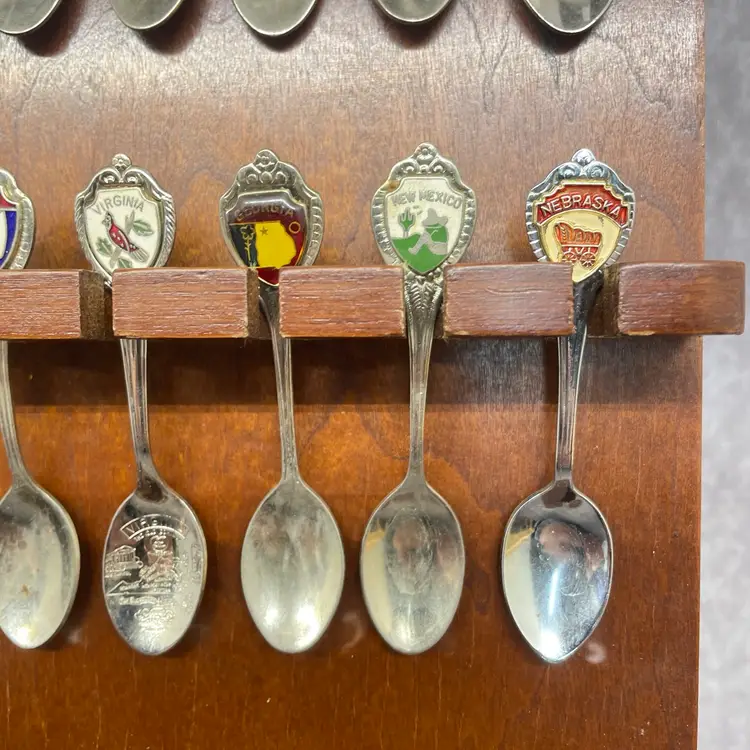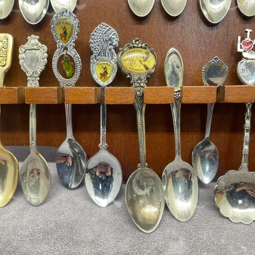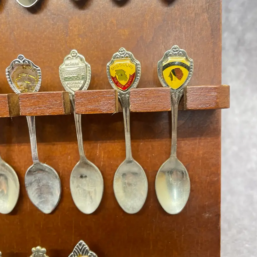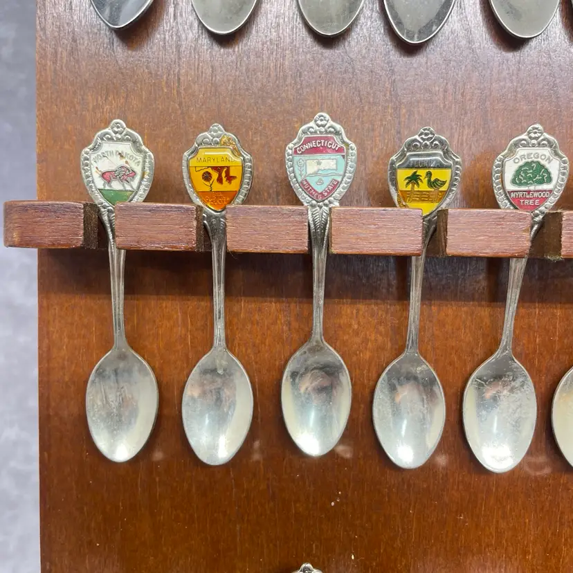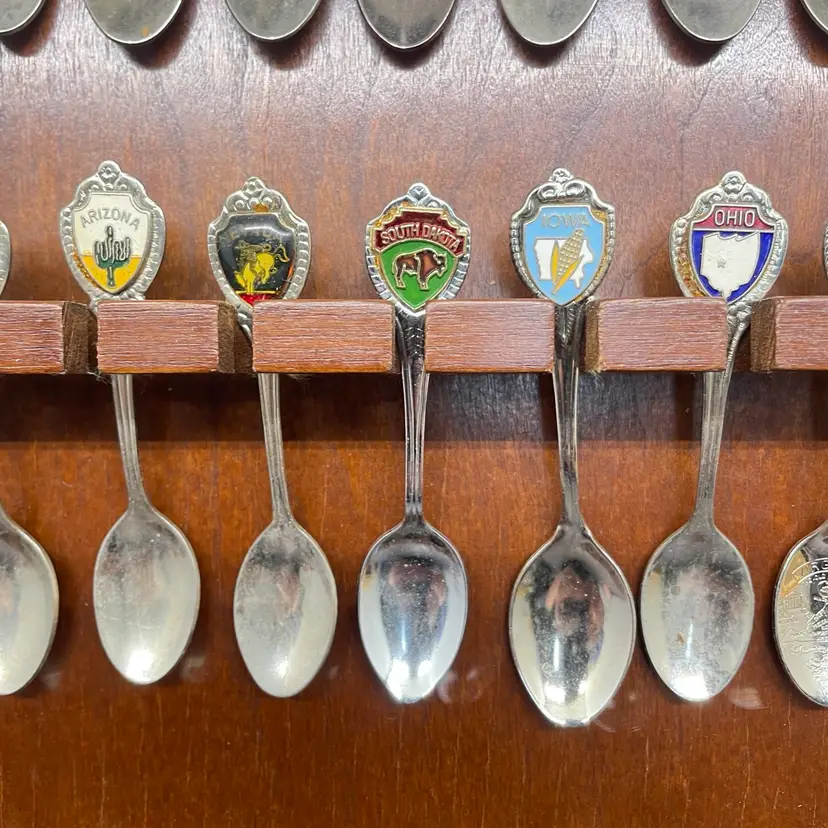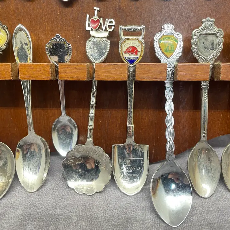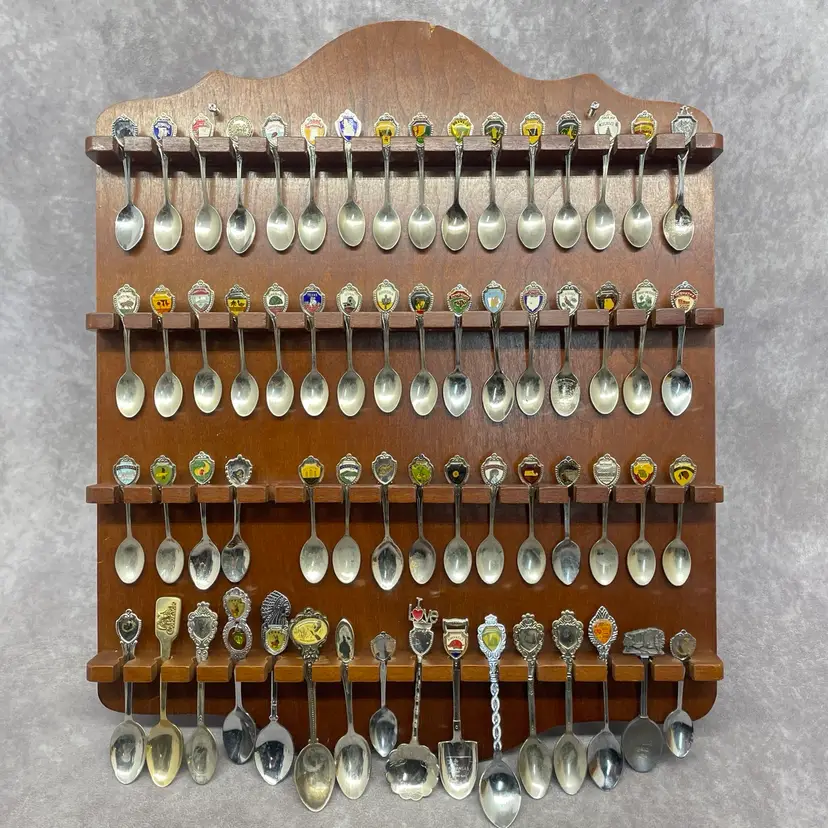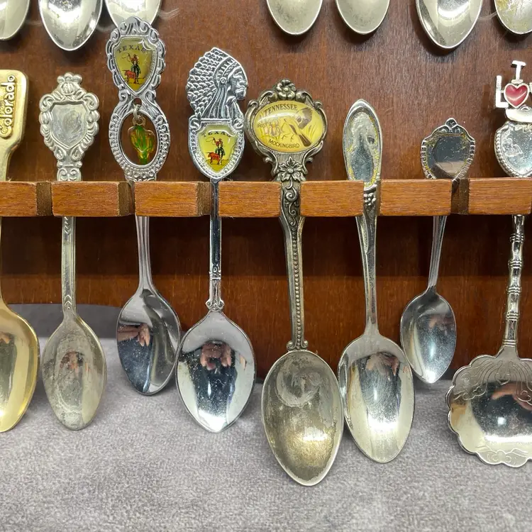 Lot of 63 decorative/collectible spoons. Approximately 11 are missing their decorative crest/shield.