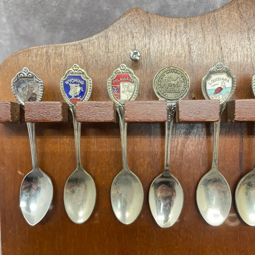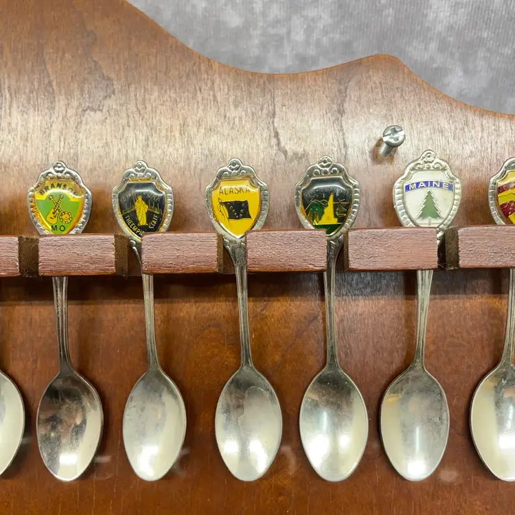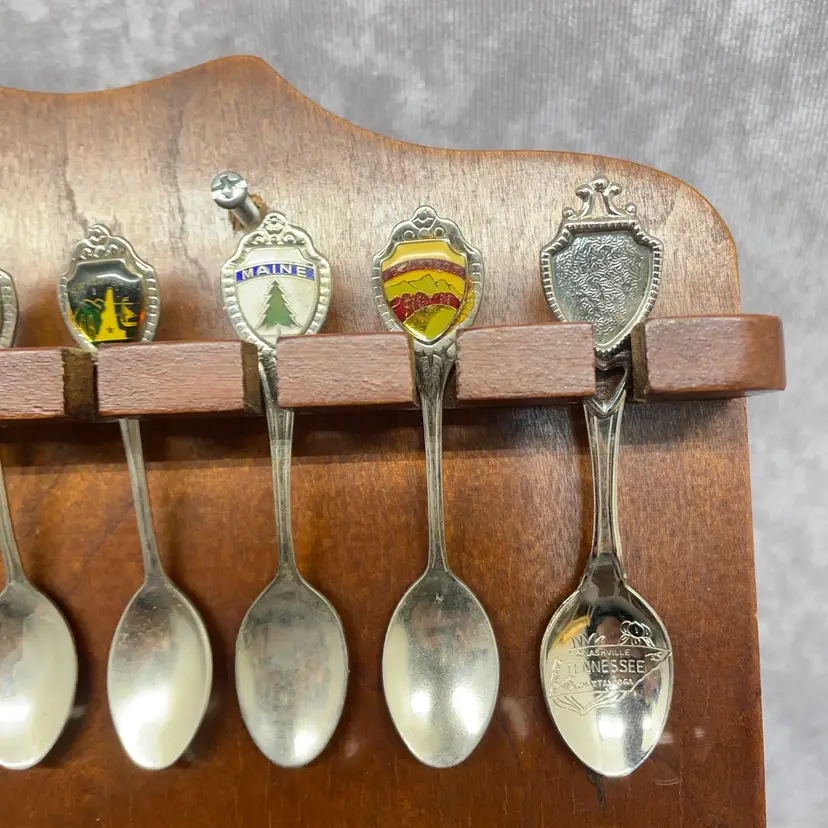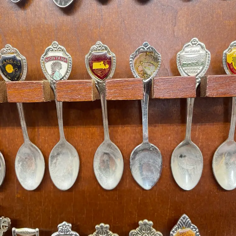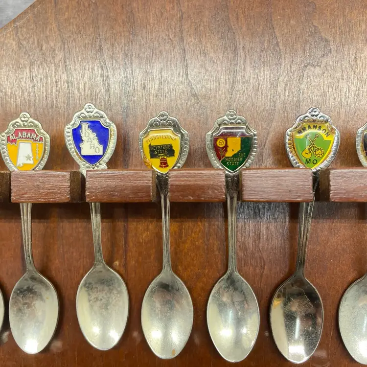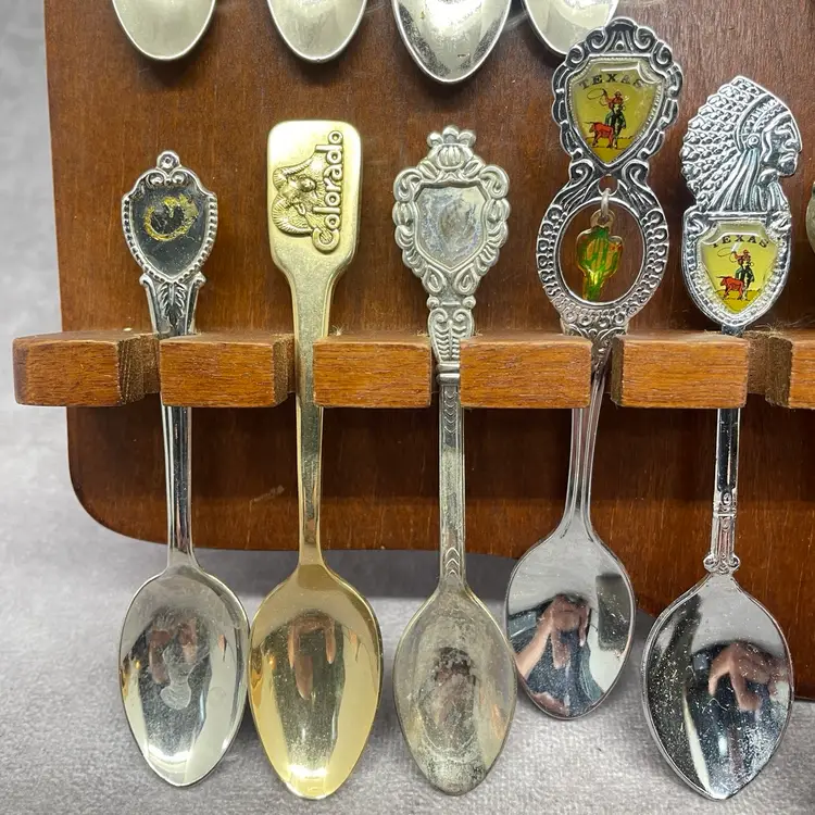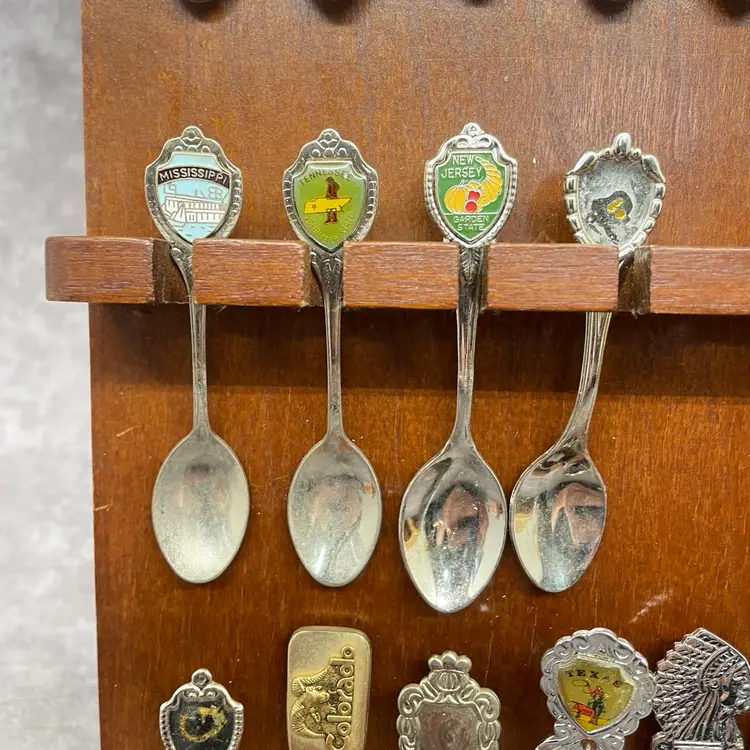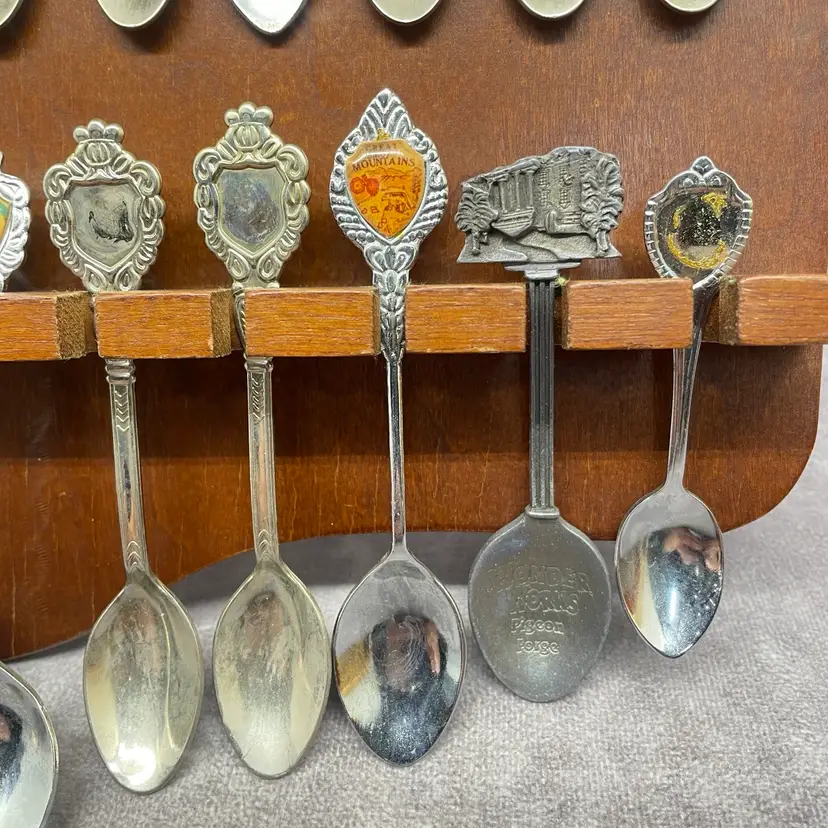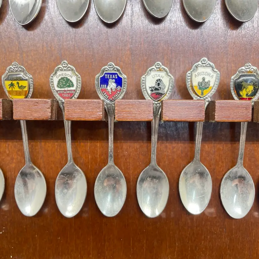 Lot of 63 decorative/collectible spoons. Approximately 11 are missing their decorative crest/shield.