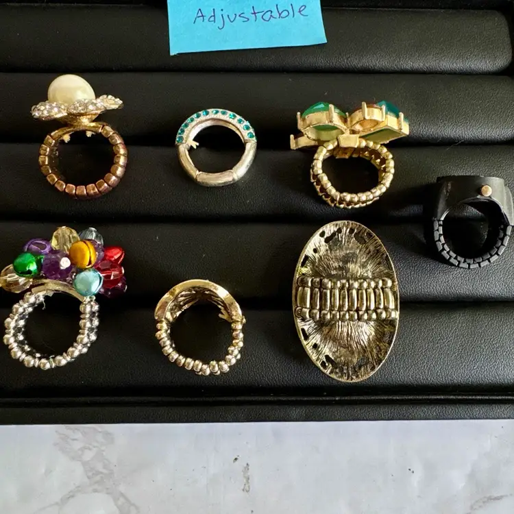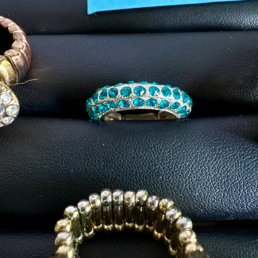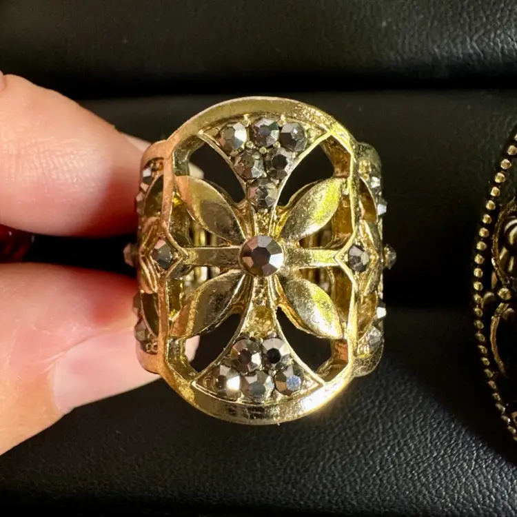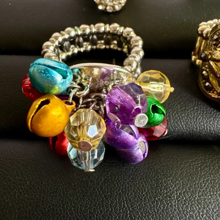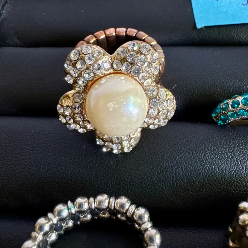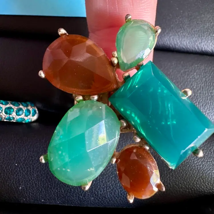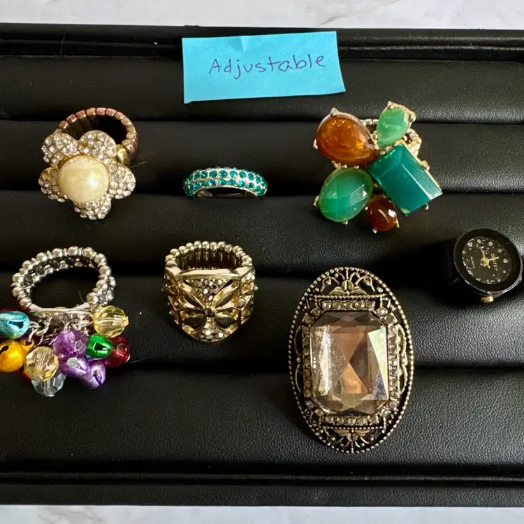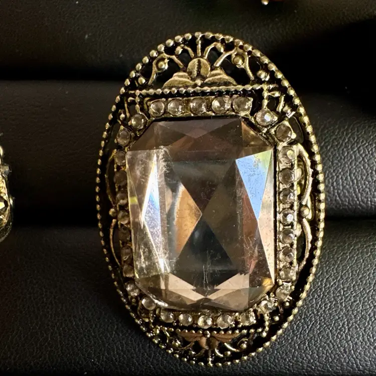 Silver tone, gold tone, & plastic. Some missing rhinestones. Combination of metal, glass, plastic, rhinestone, beads. All with minor signs of wear.