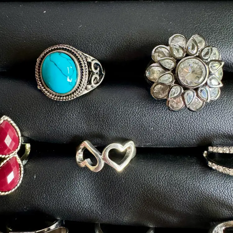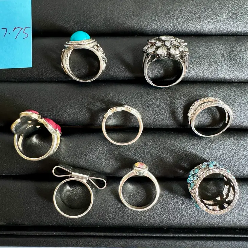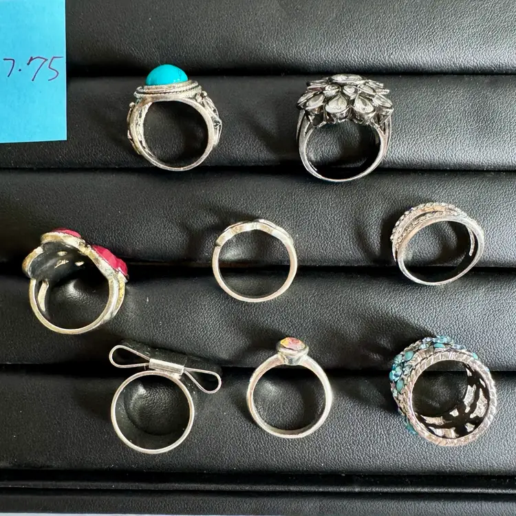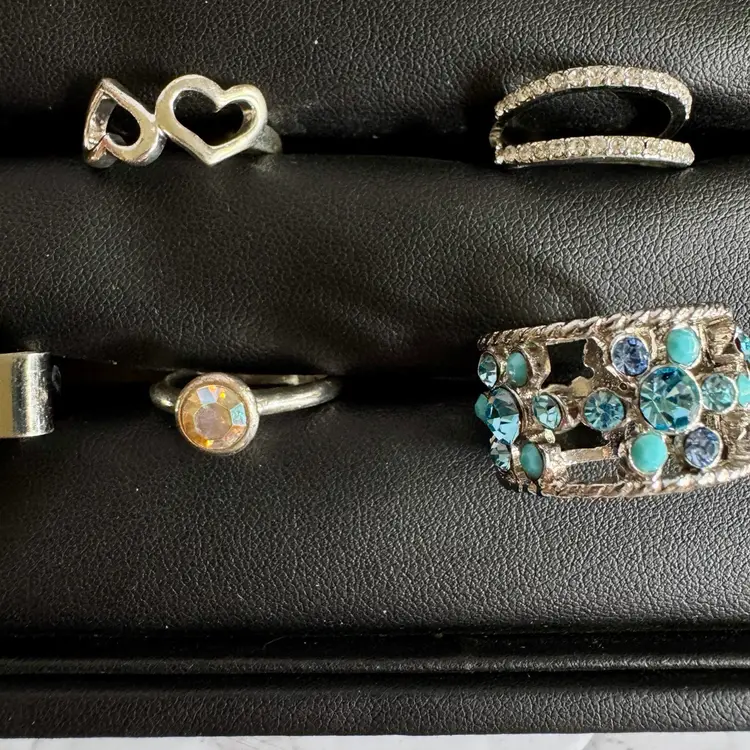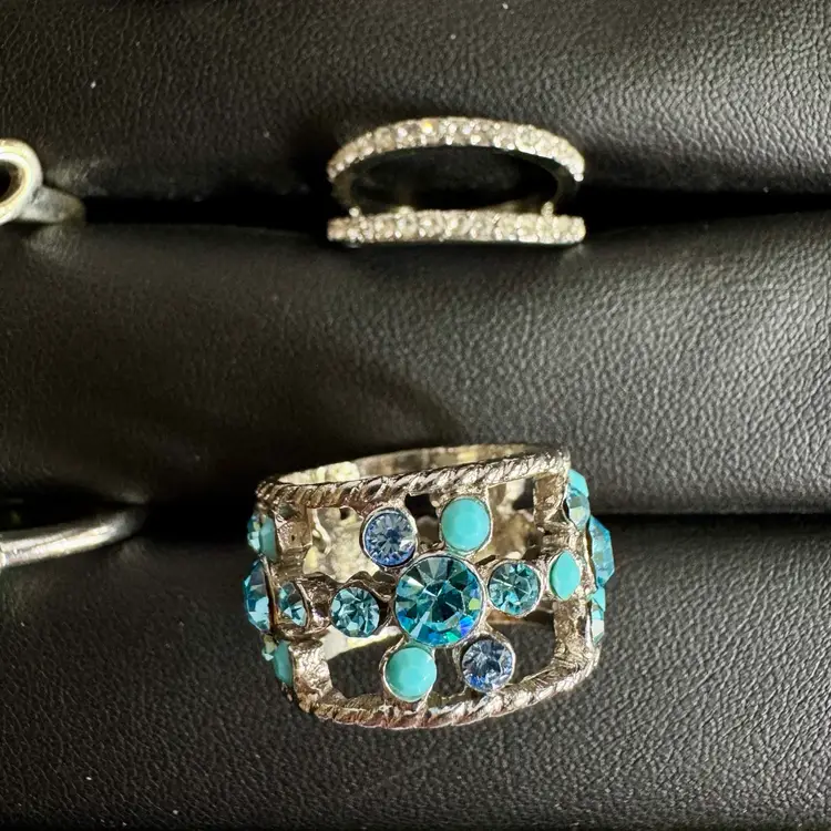 Silver tone. Combination of metal, glass, plastic, rhinestone. All with minor signs of wear.