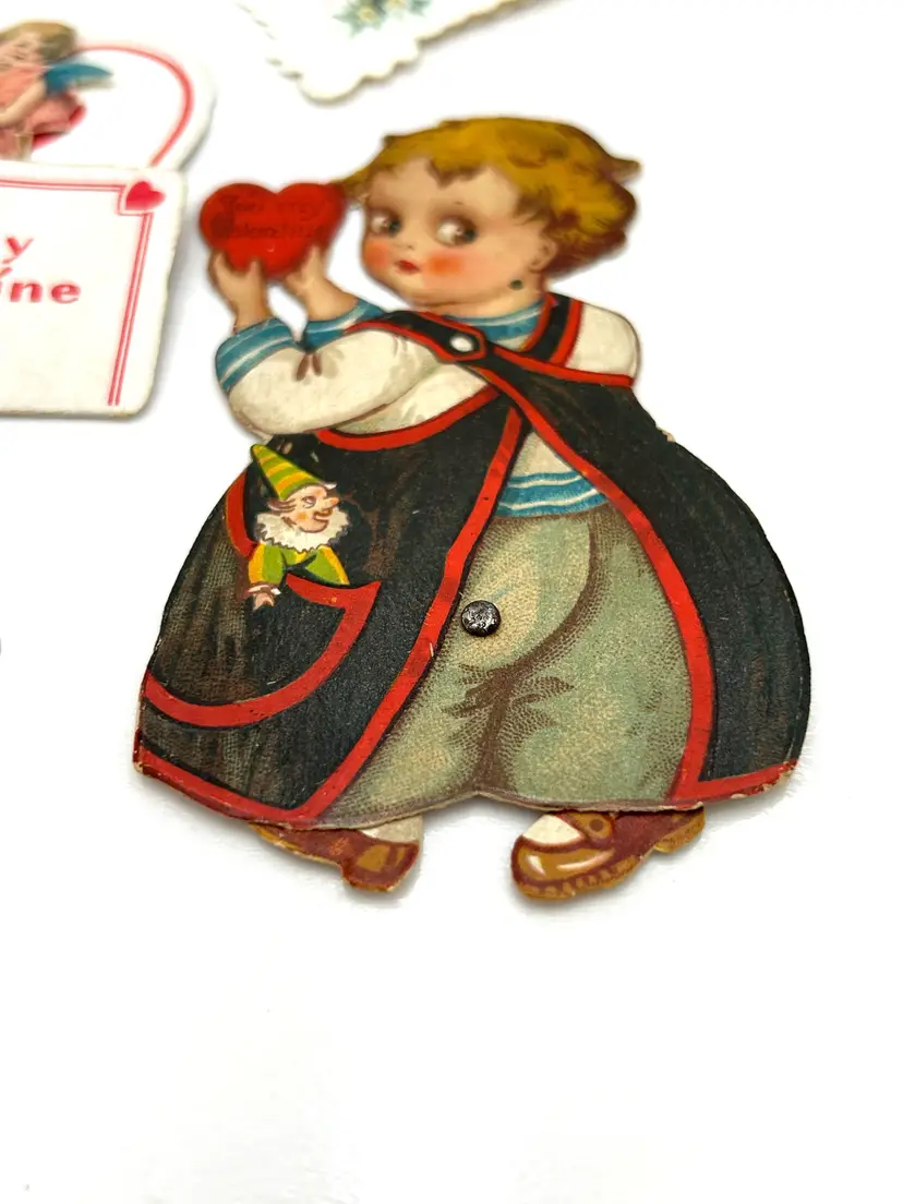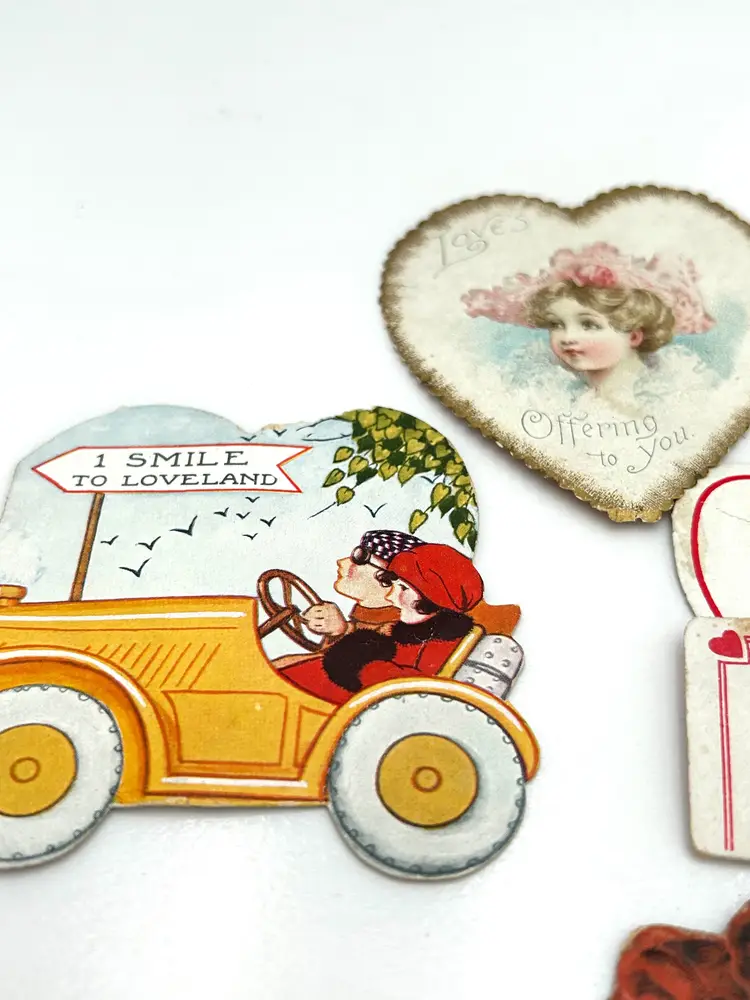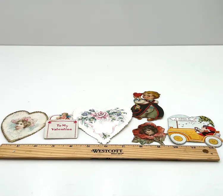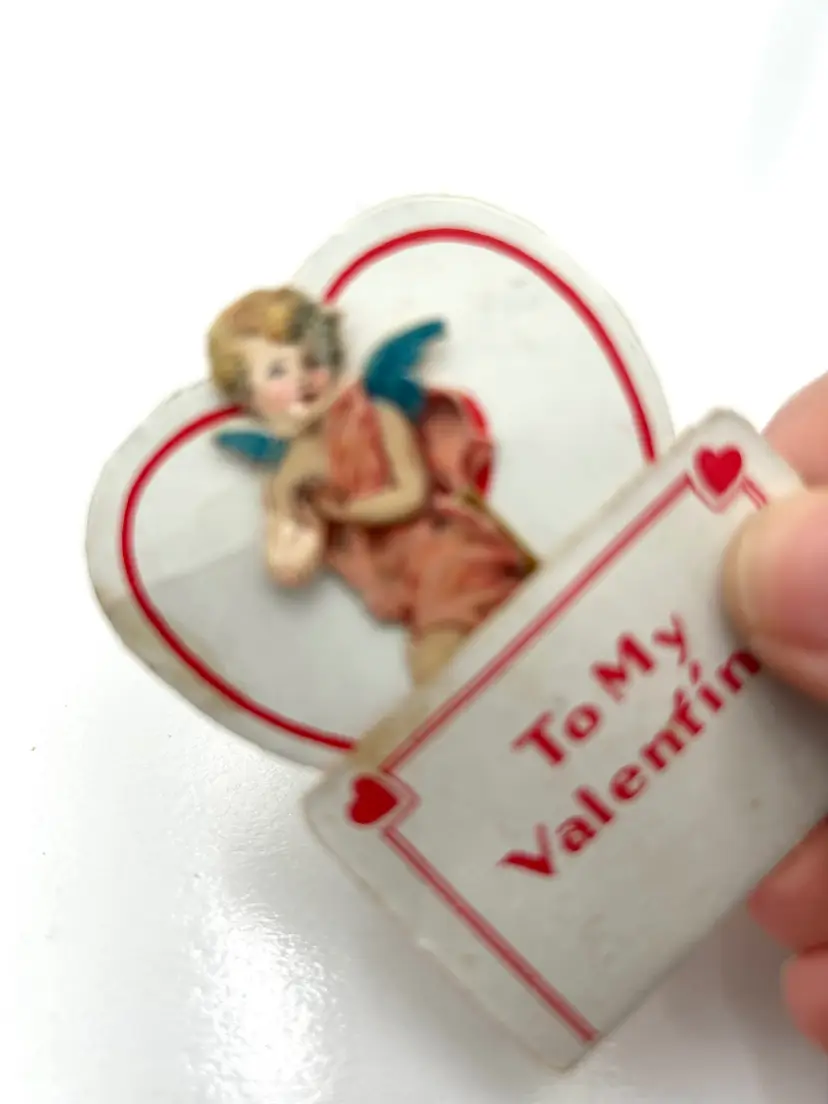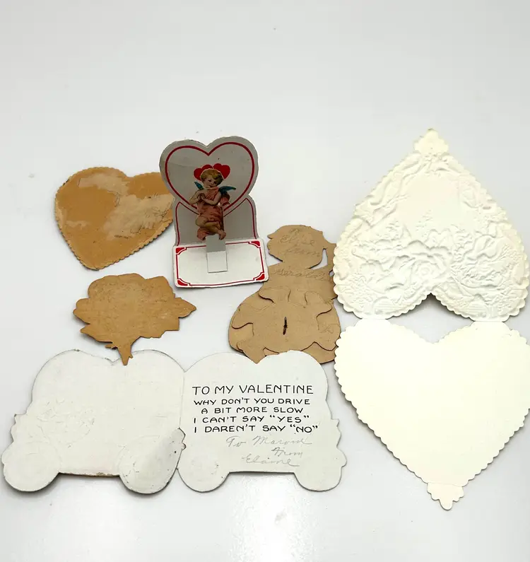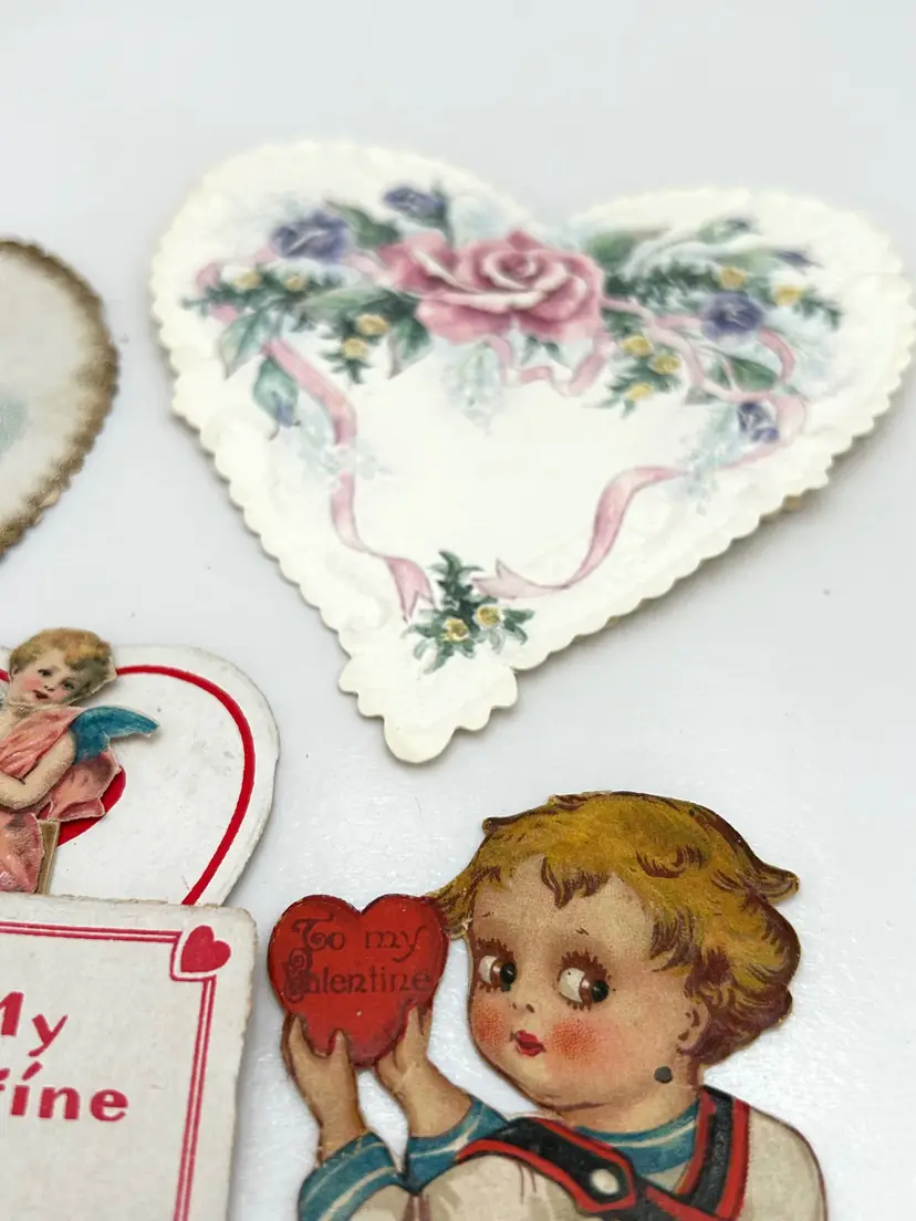 We found this pretty group of ephemera that included cards and other items from a variety of holidays. We took the lot and put together all of the Valentine’s Day items to bring to the shop. The lot includes five Valentines and one pretty die cut. All of them are older and in very good condition for being paper. We have shown that some of them are written on while others are blank. The most fun is the young child with the feet that still spin when you move them and the pop up that still works and is not torn. They are a variety of shapes and sizes with the largest being about 4 inches wide. There are some small tears and some items do have bends to them and we have tried to show them.