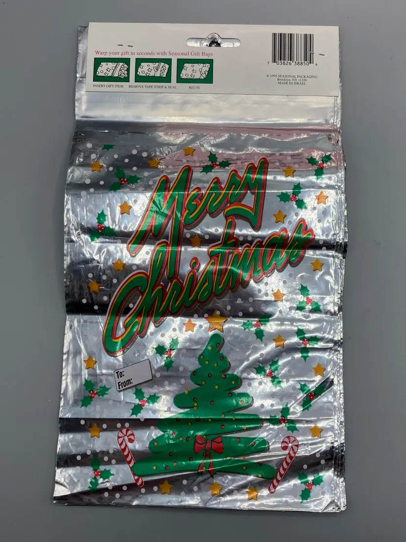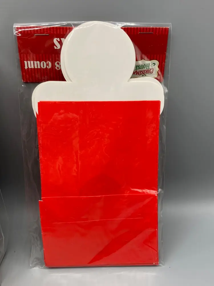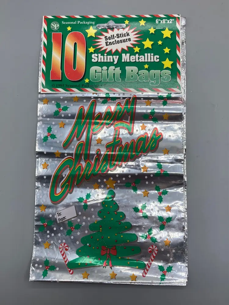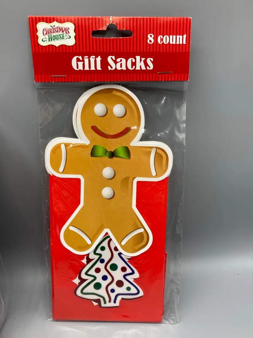 This lot includes the following: 10 Shiney Metallic Gift Bags - 6" x 8" x 2" 7 Heart and Holly Plastic Bags - 5" x 6 1/4" 3 packs of ice cream cone wrappers (12 wrappers per pack) 2 packs of wedding shower favor kits (12 count per pack) 8 gift sacks gingerbread man bags - 8 1/2" tall overall, bag is 6" tall x 4"